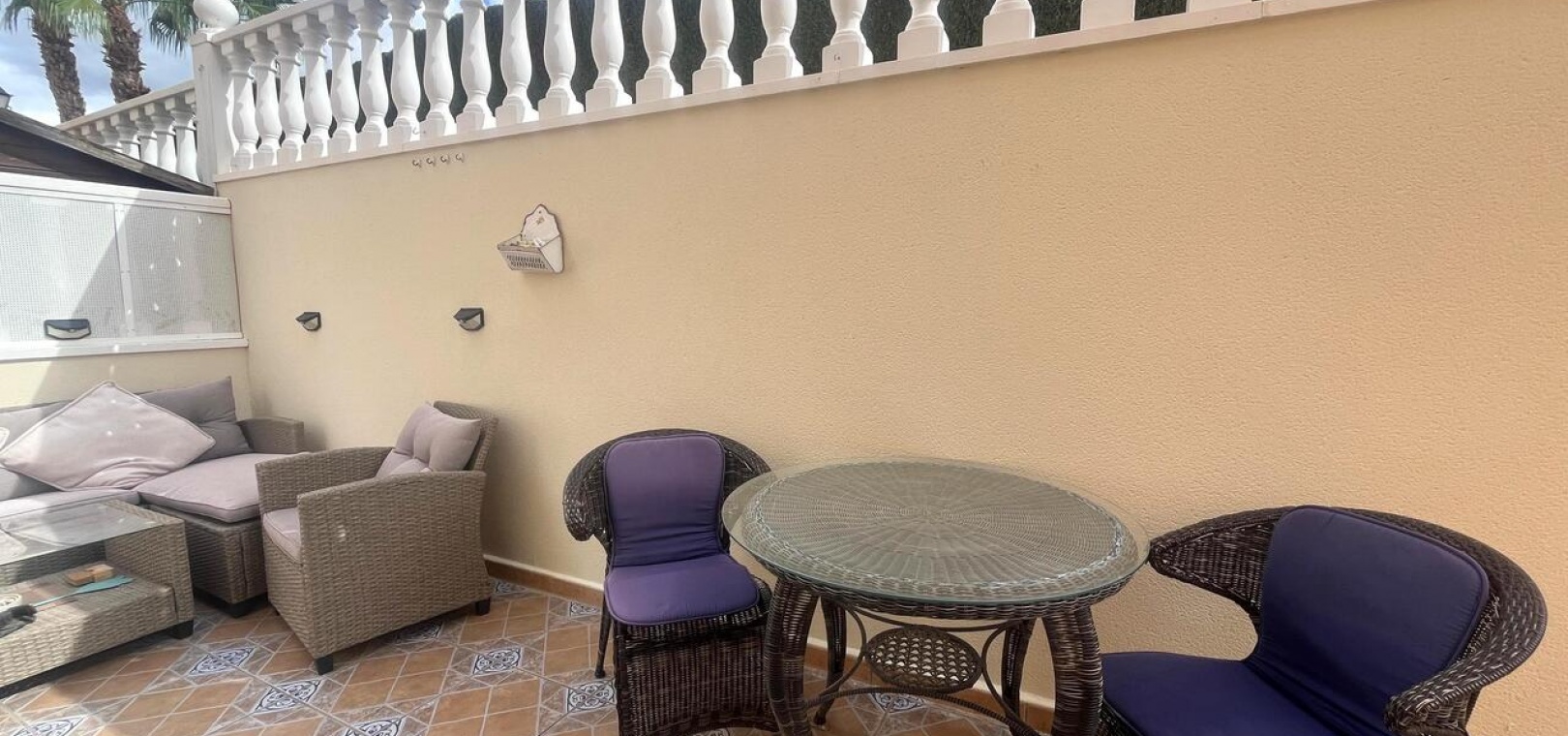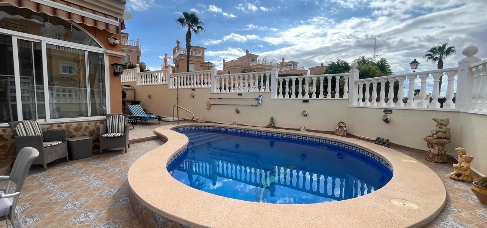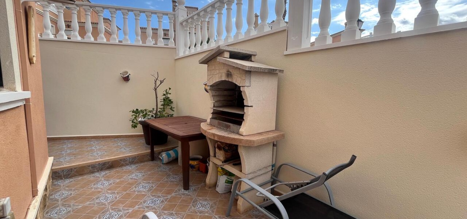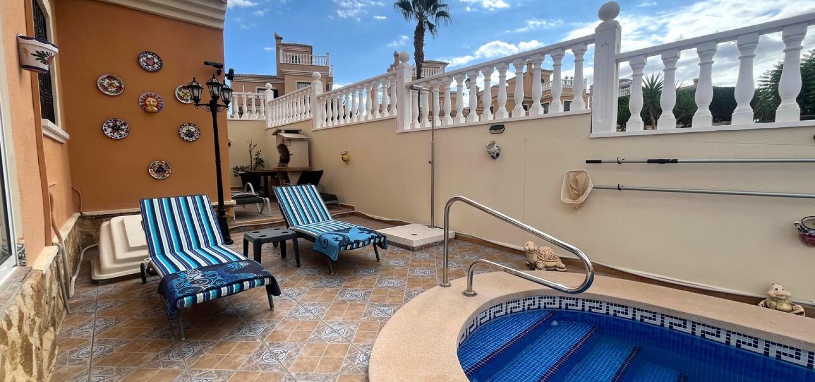 Der umlaufende Garten ist pflegeleicht und komplett gefliest und verfügt über einen privaten Swimmingpool, einen separaten Grillplatz sowie elektrische Markisen, die auf Knopfdruck angenehmen Schatten spenden. Dieser traumhafte Außenbereich ist perfekt zum Entspannen, für gesellige Stunden oder einfach zum Genießen der spanischen Sonne.