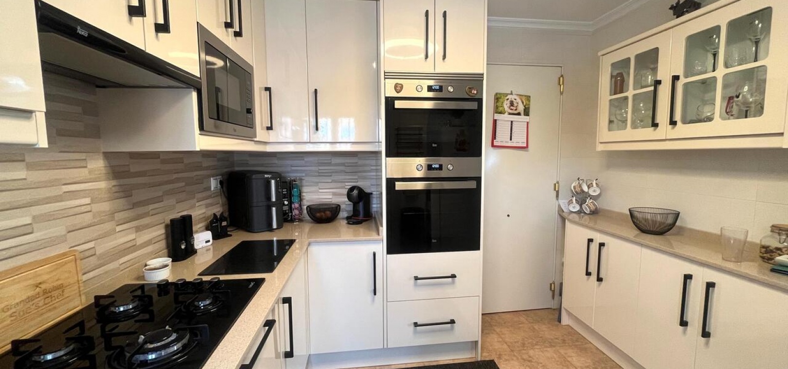 Im Erdgeschoss befinden sich ein geräumiges Doppelzimmer, ein Badezimmer und eine kürzlich renovierte, moderne Küche. Das helle, einladende Wohnzimmer ist mit einem Gaskamin und einer Klimaanlage ausgestattet und bietet so in den kühleren Monaten eine behagliche Atmosphäre und im Sommer ein angenehmes Raumklima.