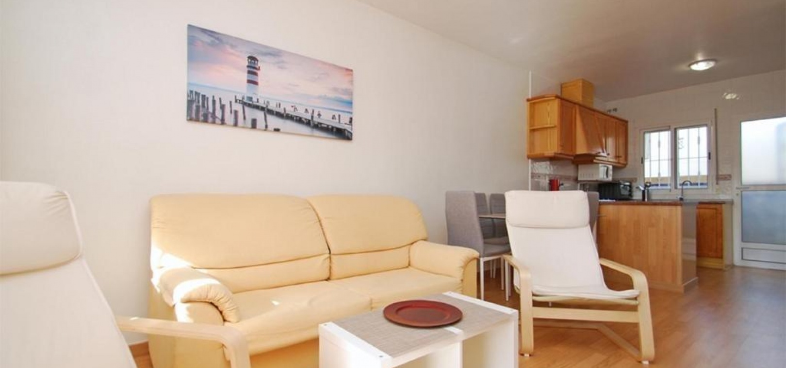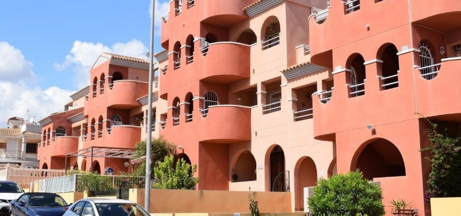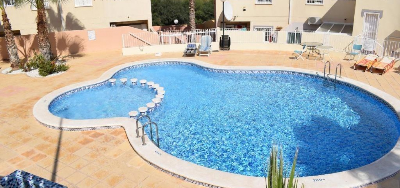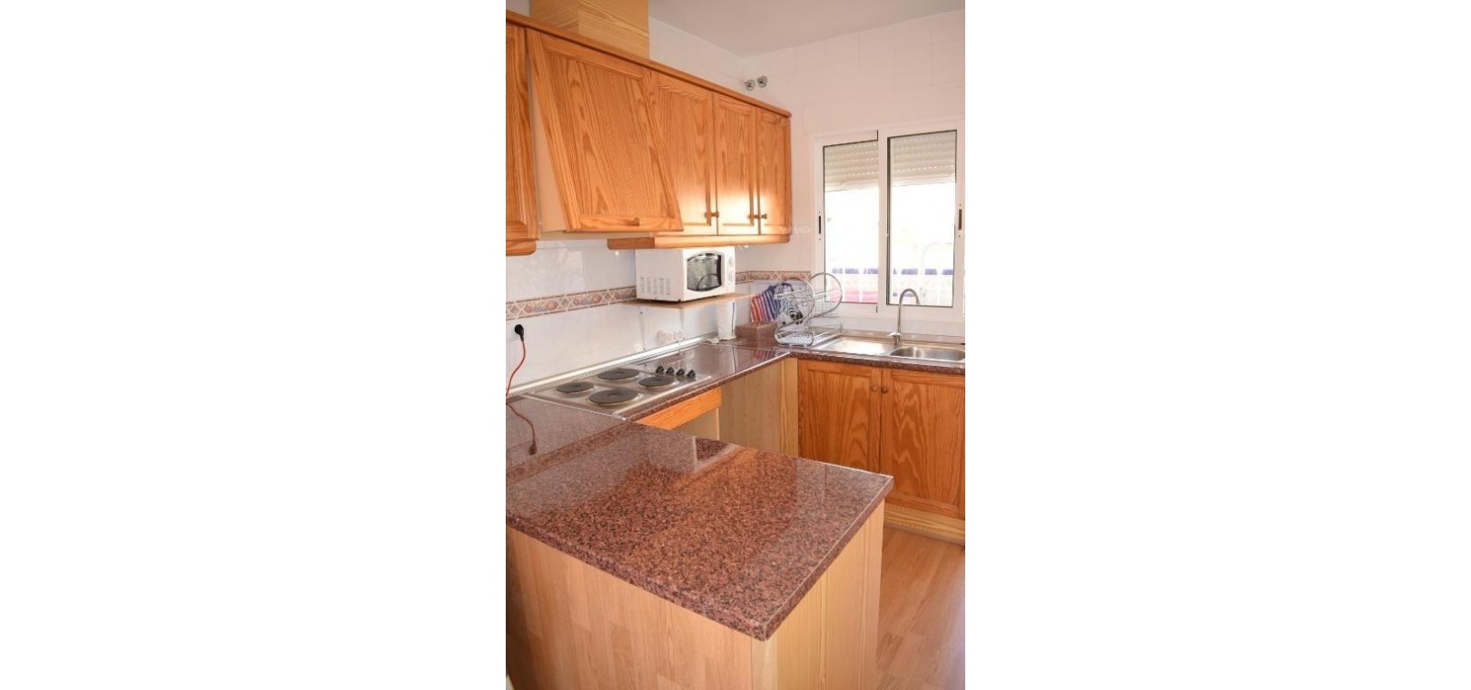 Diese ansprechend gestaltete Wohnung im ersten Stock bietet einen komfortablen Grundriss mit Wohn-/Essbereich, offener Küche, separatem Hauswirtschaftsraum, zwei Doppelschlafzimmern mit Einbauschränken, einem Badezimmer und einem sonnigen Balkon. Zur Anlage gehört außerdem ein Swimmingpool.