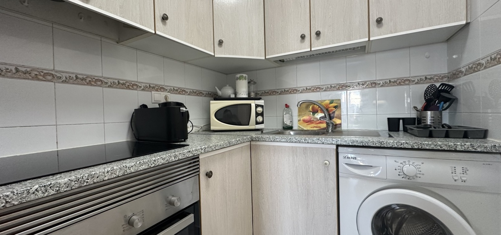 Die Wohnung besticht durch eine große, modern geflieste Terrasse , ideal zum Sonnenbaden und Essen im Freien . Über wenige Stufen gelangt man auf eine erhöhte, verglaste Terrasse , die sich perfekt als zweites Wohnzimmer eignet, um die Wintersonne zu genießen. Im Inneren bietet die Wohnung ein helles und geräumiges Wohn- und Esszimmer sowie eine voll ausgestattete, separate Küche mit Zugang zu einem überdachten Hauswirtschafts- und Abstellraum .