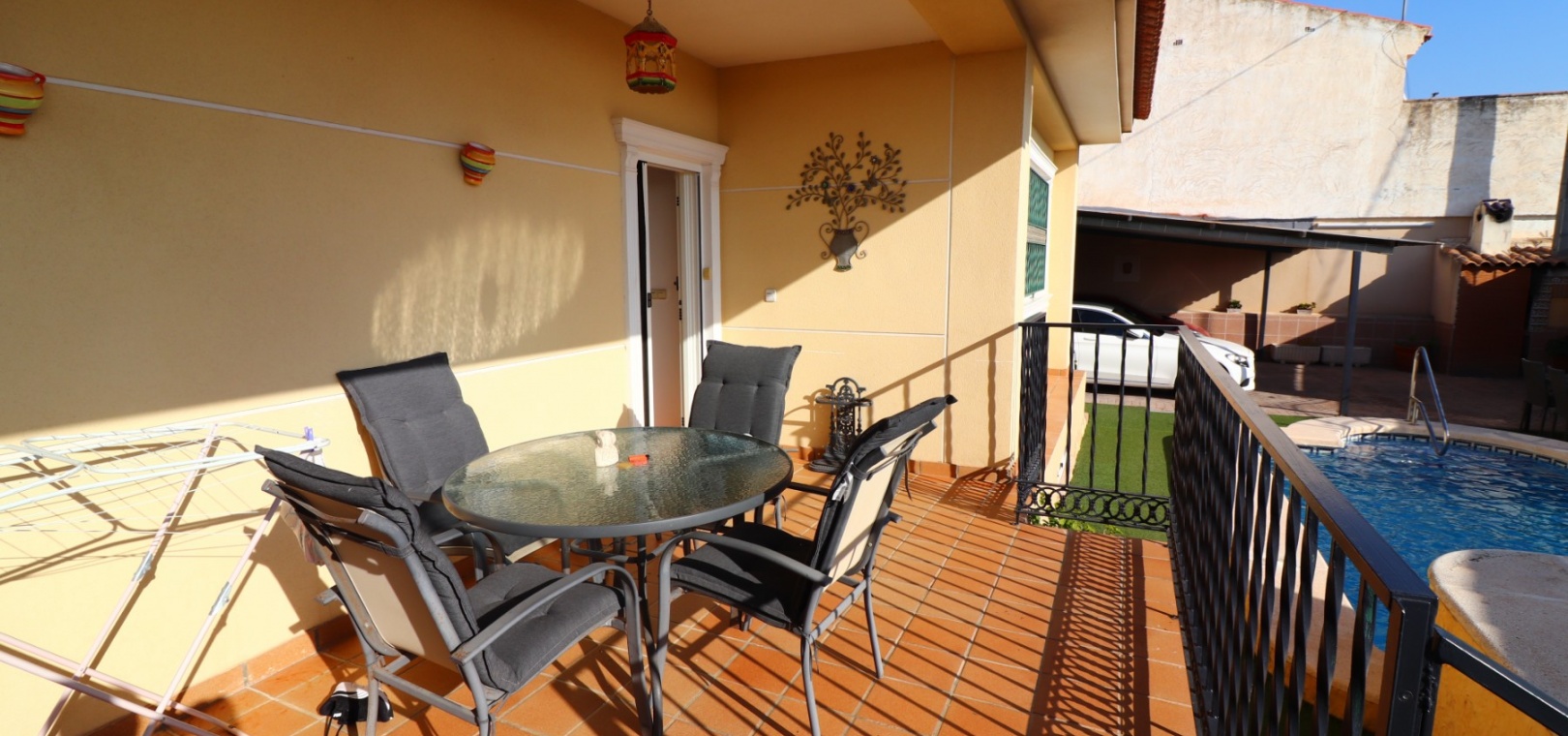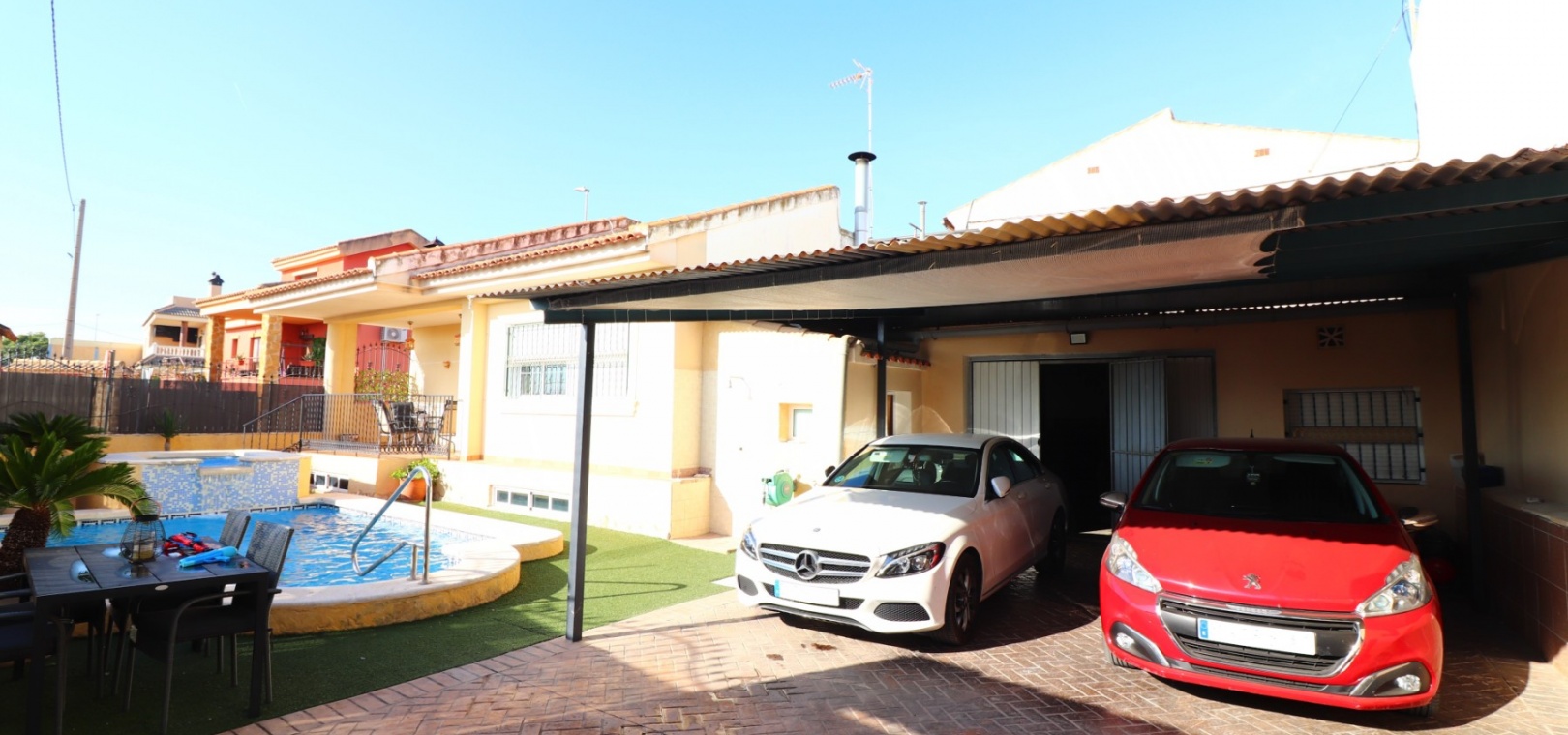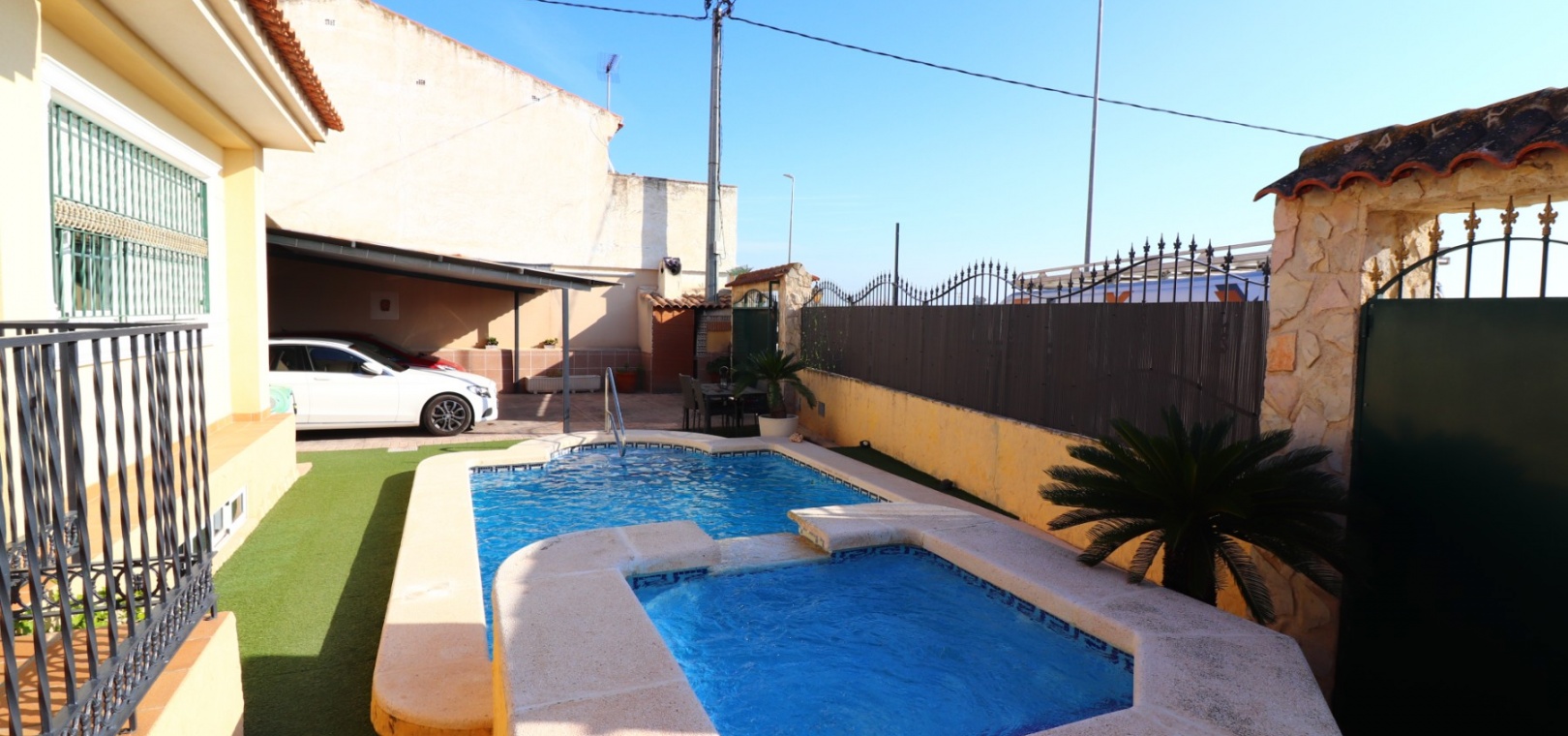 Auf einem großzügigen 368 m² großen Grundstück gelegen, sind die Außenbereiche perfekt zum Entspannen und für gesellige Stunden gestaltet. Es gibt einen Carport für zwei Fahrzeuge sowie eine geräumige Garage , die auch als Spielzimmer oder Unterhaltungsbereich genutzt werden kann und über eine Einbauküche sowie ein separates WC verfügt. Eine überdachte Terrasse mit Blick auf den privaten Swimmingpool mit Whirlpool , umgeben von Kunstrasen und mit freiem Blick in die Landschaft , schafft ein ideales Ambiente für das Leben im Freien.