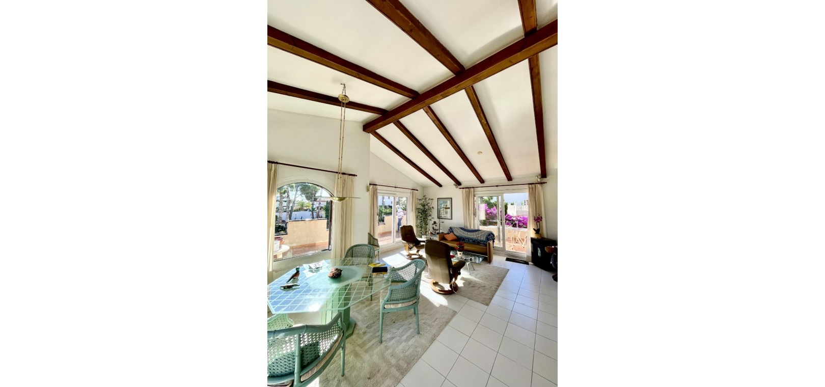Vom Wohnzimmer führen drei separate Schiebetüren direkt auf drei großzügige Terrassen mit atemberaubendem Meerblick, Blick auf den gepflegten Garten mit Palmen und die umliegende grüne Landschaft. Dank der Ausrichtung nach Osten, Süden und Westen genießen Sie zu jeder Tageszeit Sonne oder Schatten. Eine Terrasse ist zusätzlich mit Markisen und einem Windschutz ausgestattet und bietet so ganzjährigen Komfort im Freien.