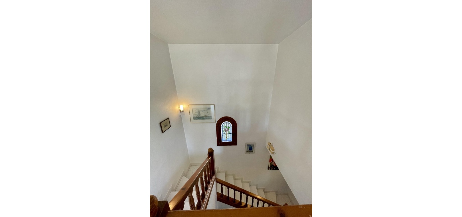 Das Obergeschoss besticht durch ein großes, einladendes Wohnzimmer mit hohen Decken, Holzbalken, einem Kamin und doppelt verglasten PVC-Fenstern, die viel Tageslicht hereinlassen und eine helle, offene Atmosphäre schaffen. Auf dieser Ebene befinden sich außerdem eine renovierte Küche und ein Gäste-WC.