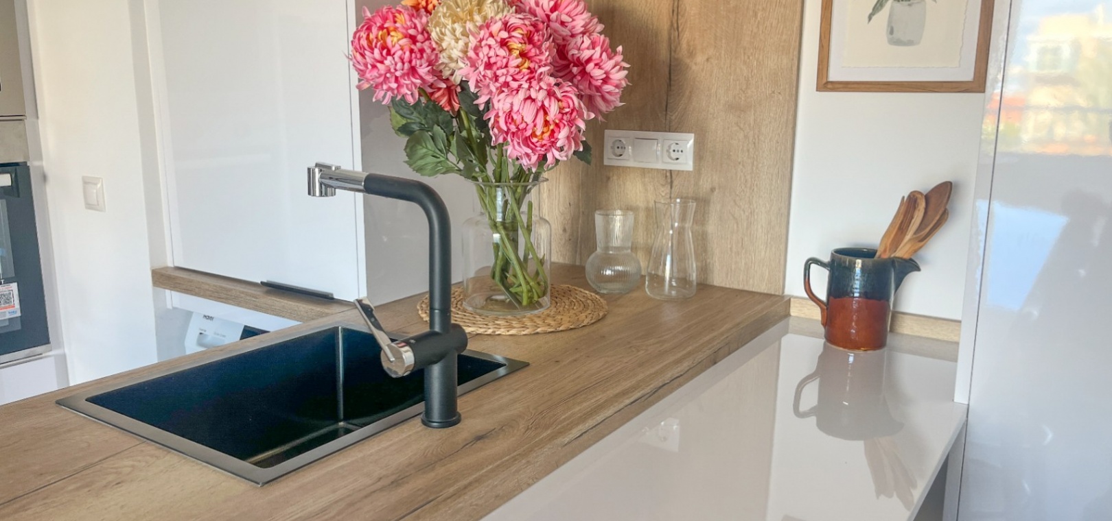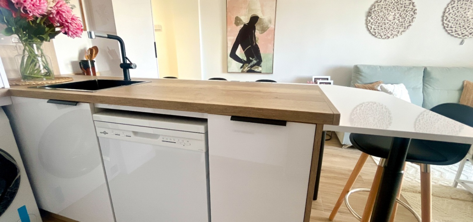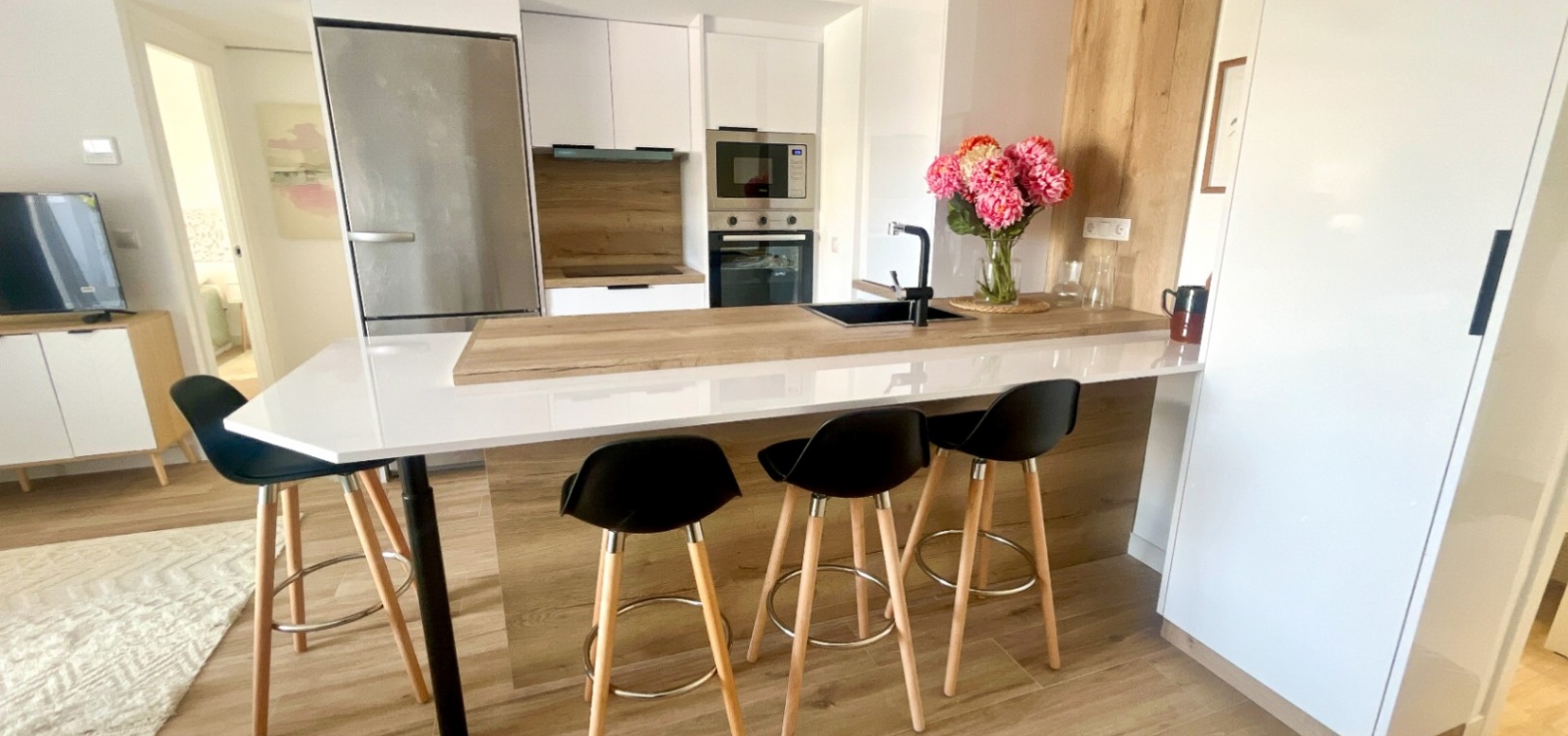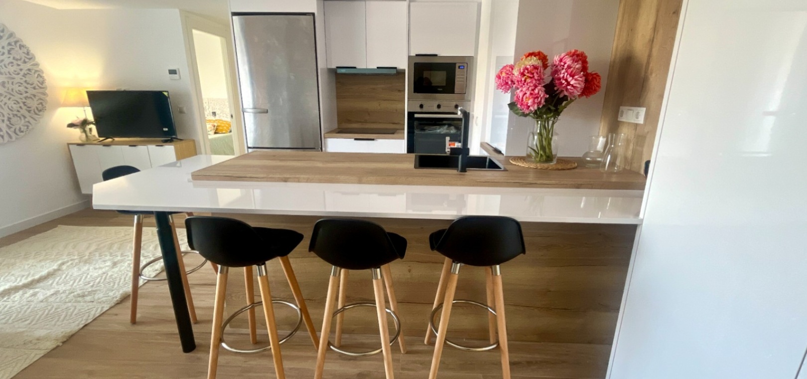Die Wohnung ist komplett möbliert und sofort bezugsfertig. Sie besticht durch ein helles und harmonisches Raumkonzept mit einem komfortablen Wohn- und Essbereich, der nahtlos in die kürzlich renovierte, moderne Küche übergeht. Die Küche verfügt über eine stilvolle Kochinsel, hochwertige Einbaugeräte und durchdachte Stauraumlösungen und ist somit sowohl praktisch als auch einladend für gesellige Stunden.
