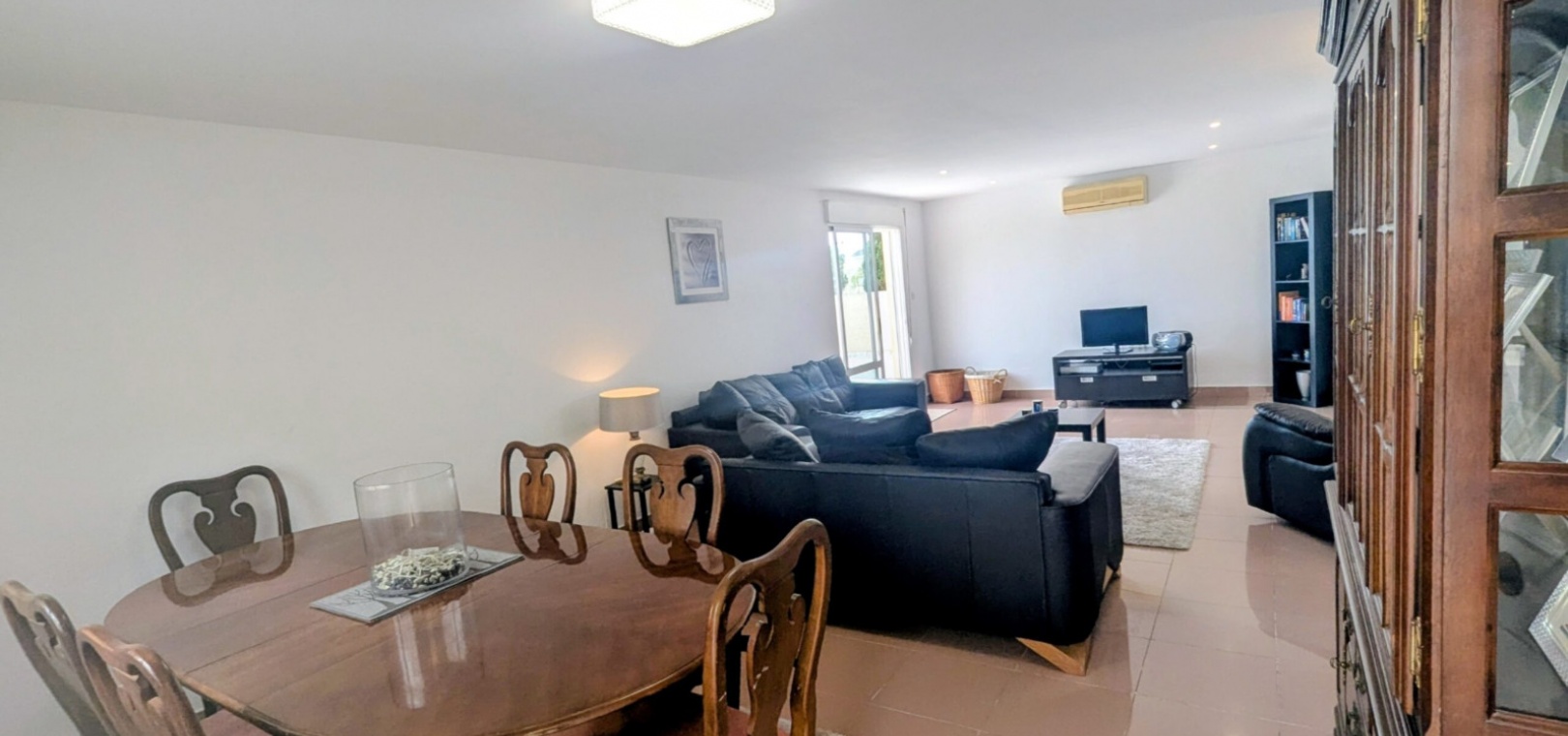 Im Erdgeschoss befindet sich ein großzügiger Wohn- und Essbereich mit großen Glastüren, die direkt auf den privaten Poolbereich führen – ideal zum Entspannen, für gesellige Stunden oder zum Sonnenbaden. Der Pool ist 37 m² groß und von einer weitläufigen Terrasse umgeben. Auf dieser Ebene befinden sich außerdem ein Schlafzimmer, ein Badezimmer mit Badewanne und eine separate Küche.