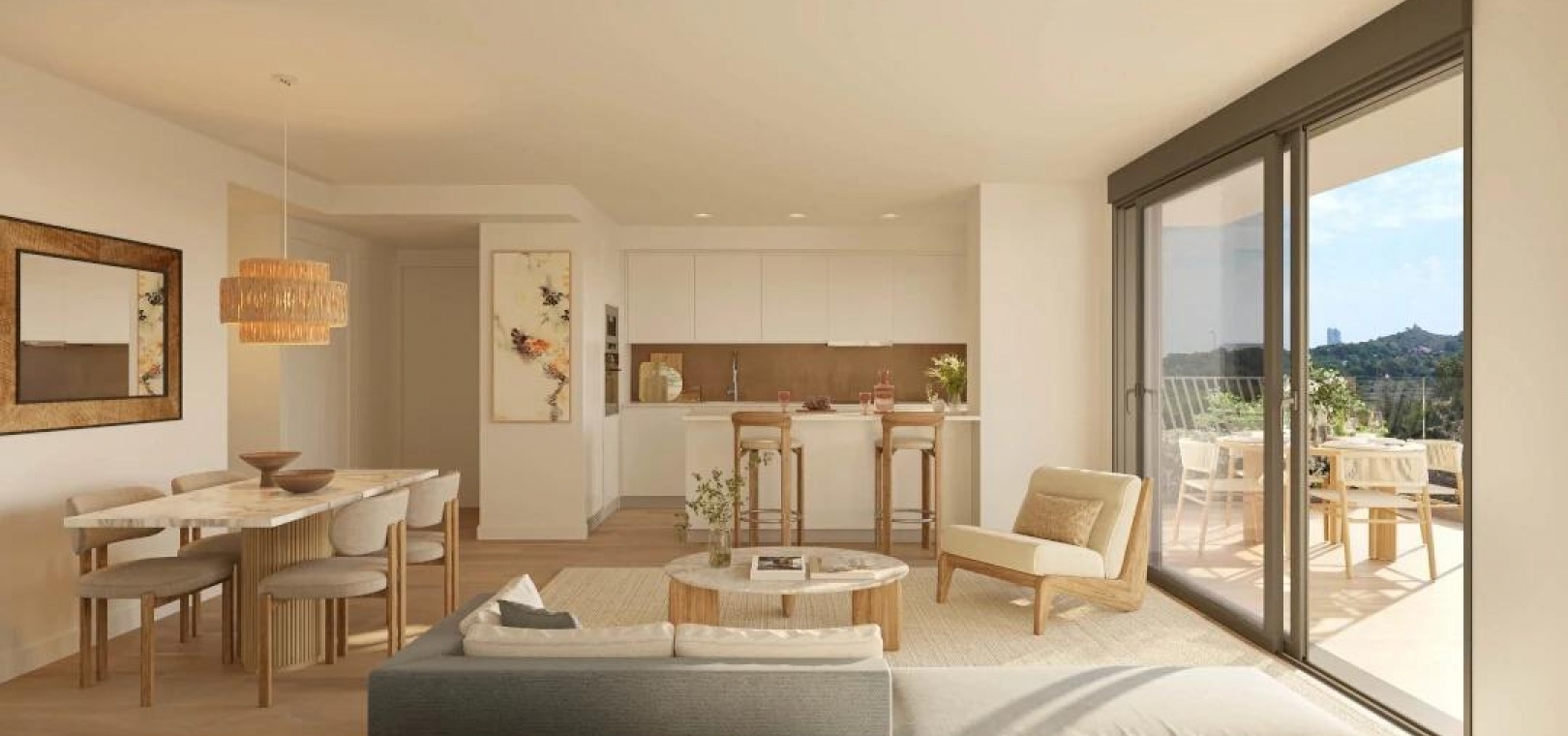 Wohnungen mit 1 und 2 Schlafzimmern und 1 und 2 Badezimmern mit großen Terrassen, die über einen überdachten und einen offenen Bereich verfügen.
