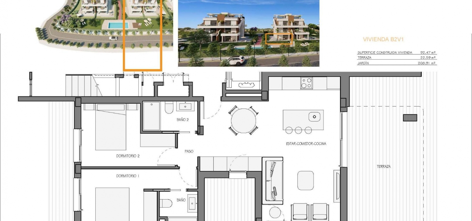 Die Wohnanlage besteht aus kleinen Bauabschnitten mit nur 2 Blöcken mit jeweils 6 Wohnungen, was Privatsphäre und eine gemütliche Atmosphäre garantiert. Alle Apartments verfügen über 2 Schlafzimmer und 2 Badezimmer sowie große Terrassen. Sie haben die Wahl zwischen: