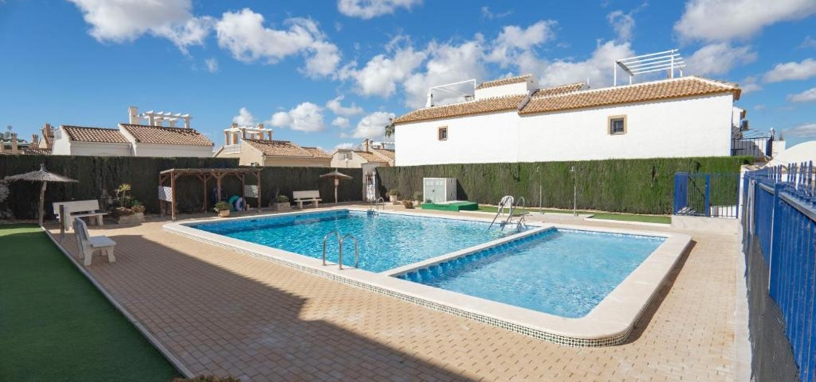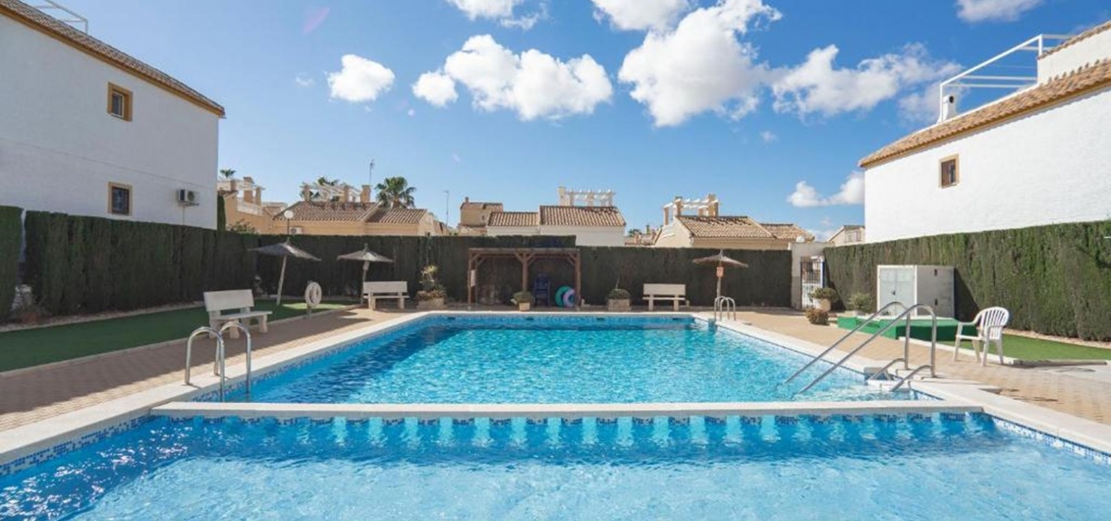 Die Bewohner profitieren von einem gepflegten Gemeinschaftspool , der sich ideal zum Abkühlen und geselligen Beisammensein eignet. In einer ruhigen Wohngegend gelegen und dennoch nur wenige Schritte von Geschäften, einem großen Supermarkt, Bars und Restaurants entfernt, bietet diese Immobilie die perfekte Balance zwischen Ruhe und Komfort .