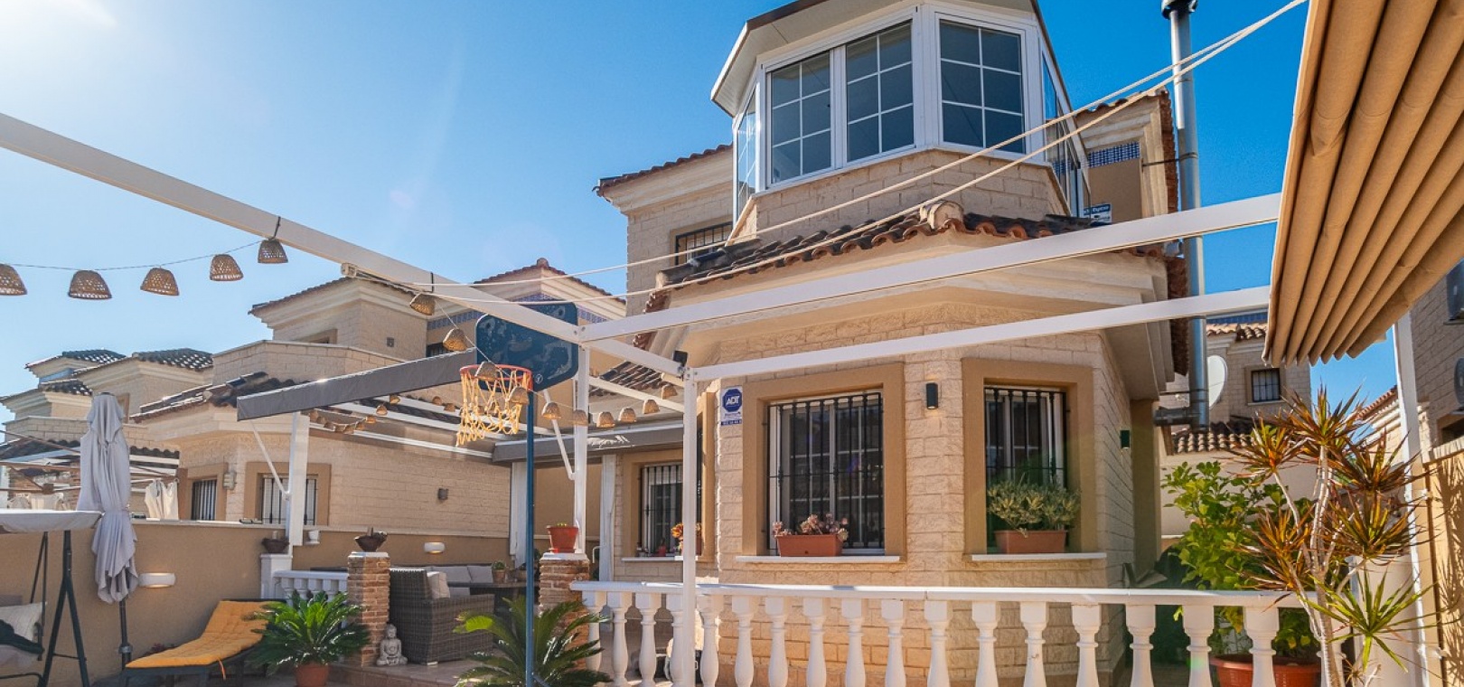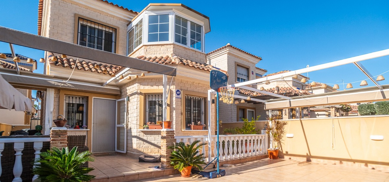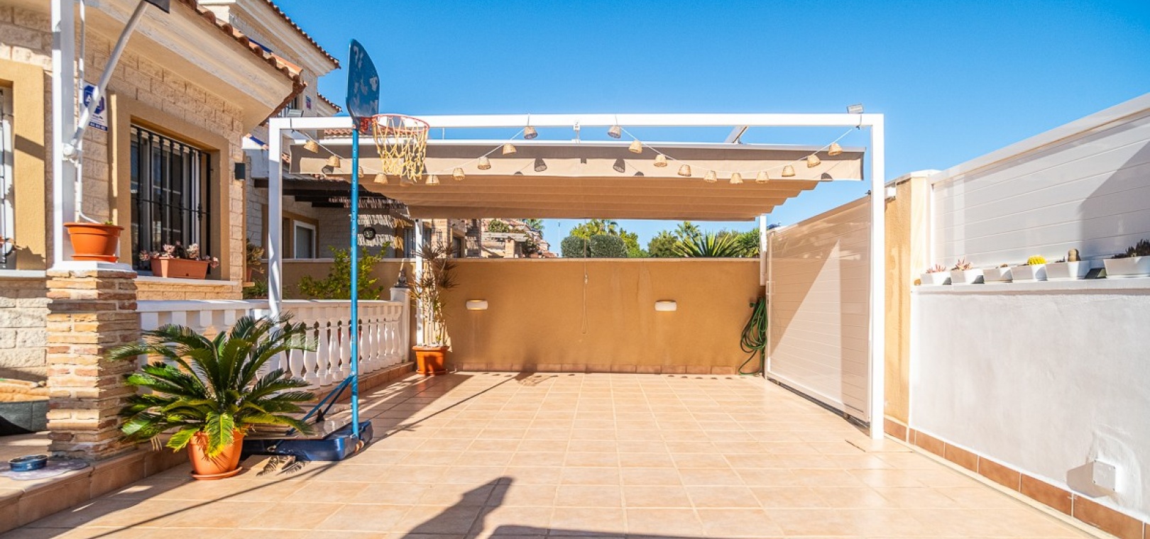 Das Anwesen besticht durch einen beeindruckenden , 188 m² großen privaten Außenbereich , der ideal zum Entspannen, für gesellige Stunden und zum Genießen des mediterranen Lebensstils geeignet ist. Markisen und Sonnensegel spenden zu jeder Tageszeit Schatten und Komfort.