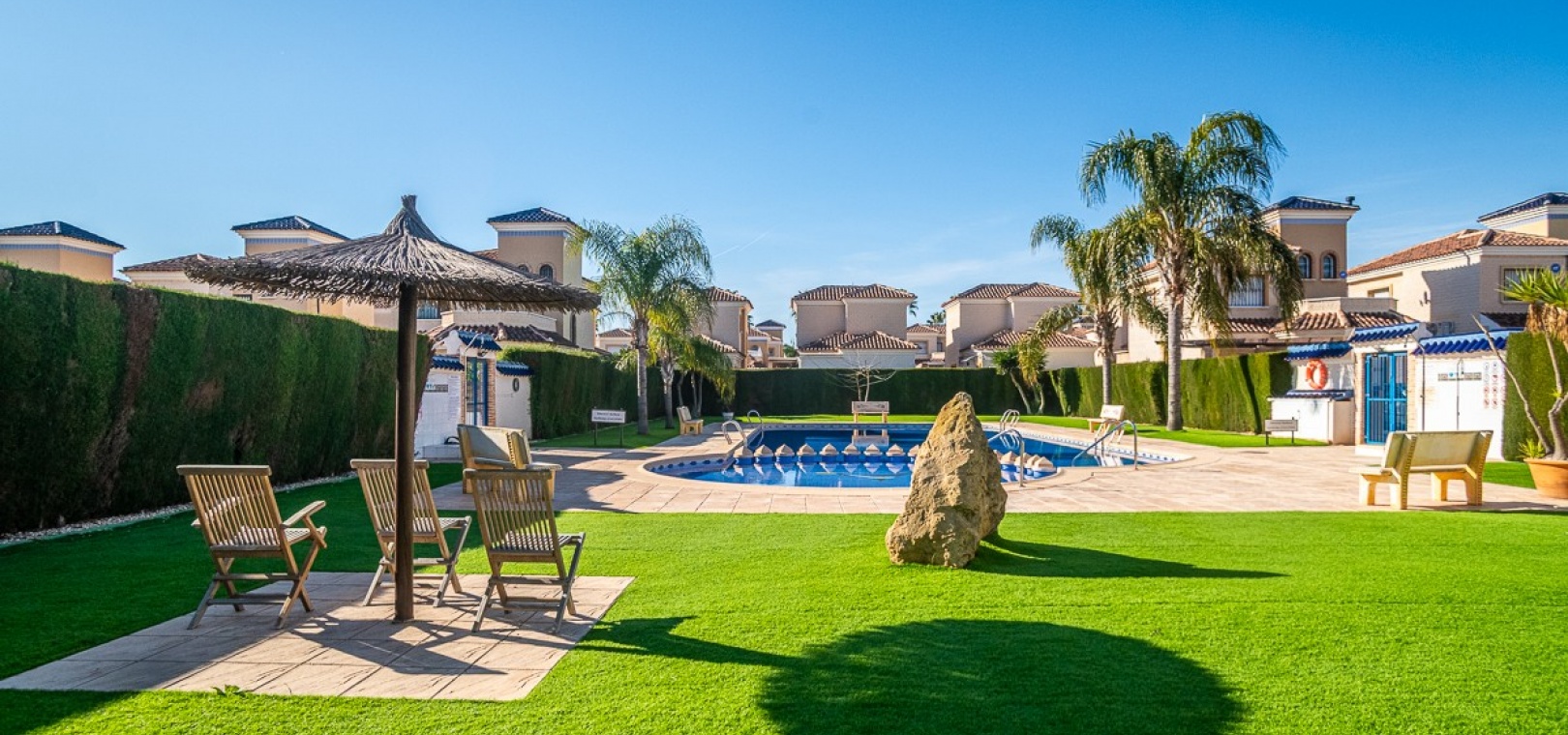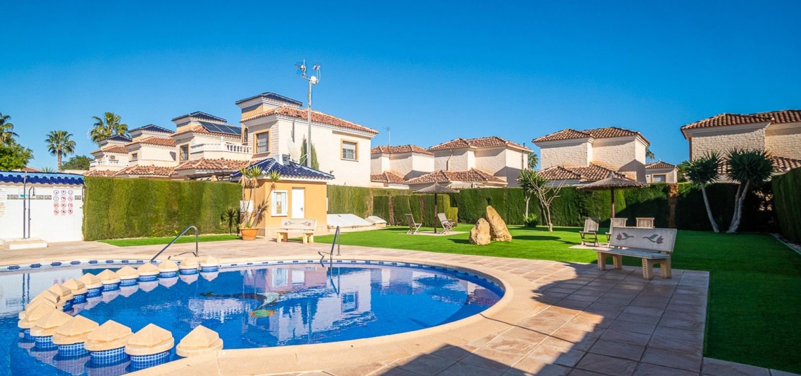 Die Villa ist Teil einer charmanten und gepflegten Wohnanlage mit Zugang zu einem großen Gemeinschaftspool , ideal, um das sonnige Klima der Costa Blanca zu genießen.