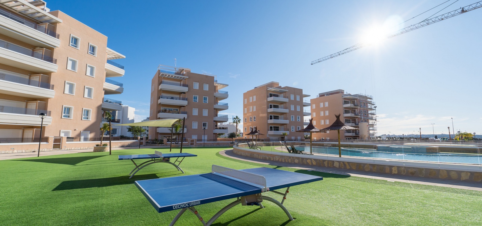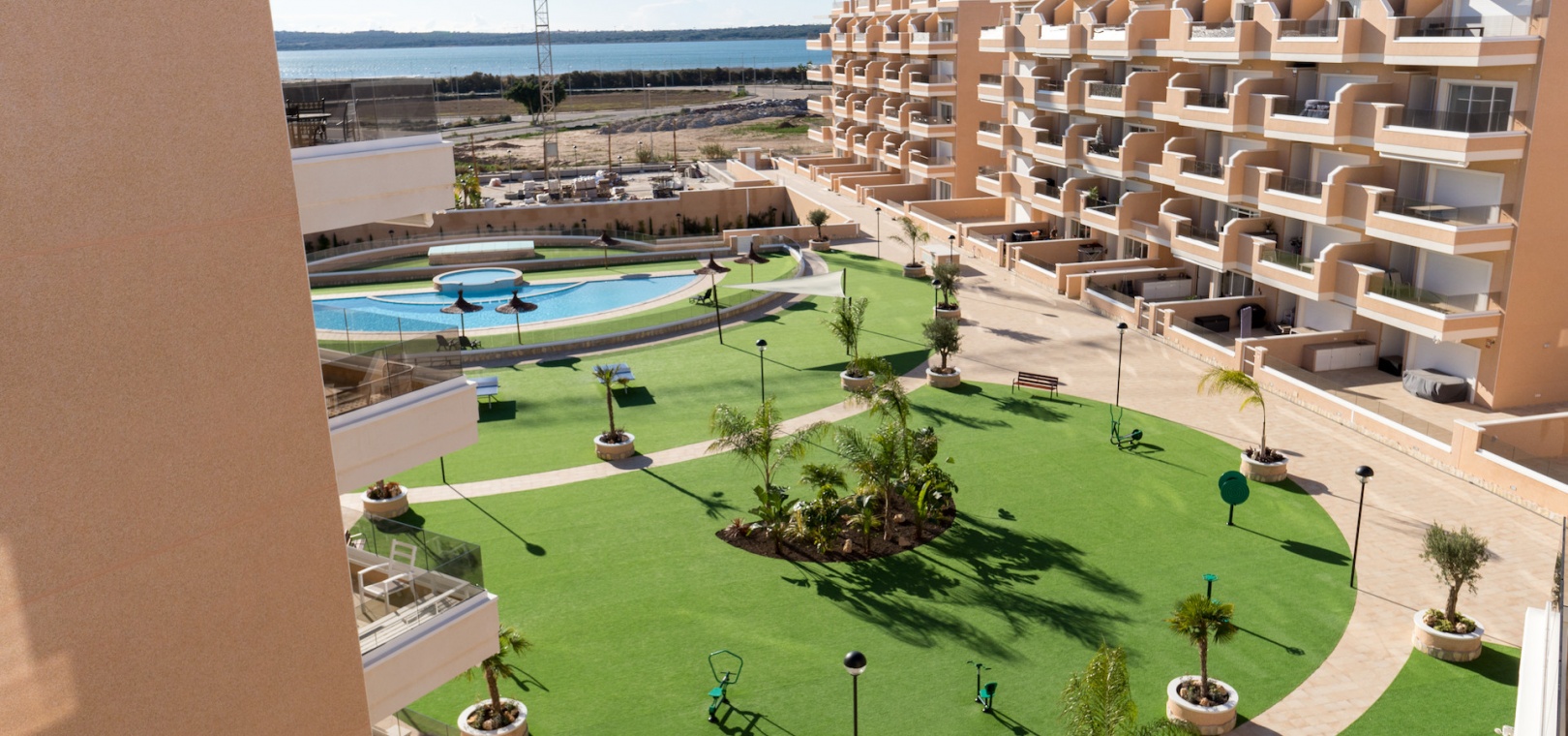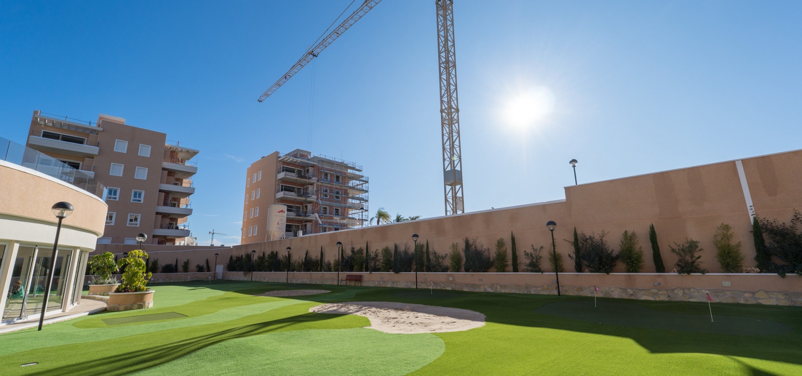 Großer Außenpool im Sommer Beheizter Innen-Spa-Bereich Landschaftsgärten und Entspannungszonen Kinderspielplatz „Vista Park“ Outdoor-Fitnessstudio mit bio-gesunden Geräten Putting Green zum Golftraining Sichere, umzäunte Anlage