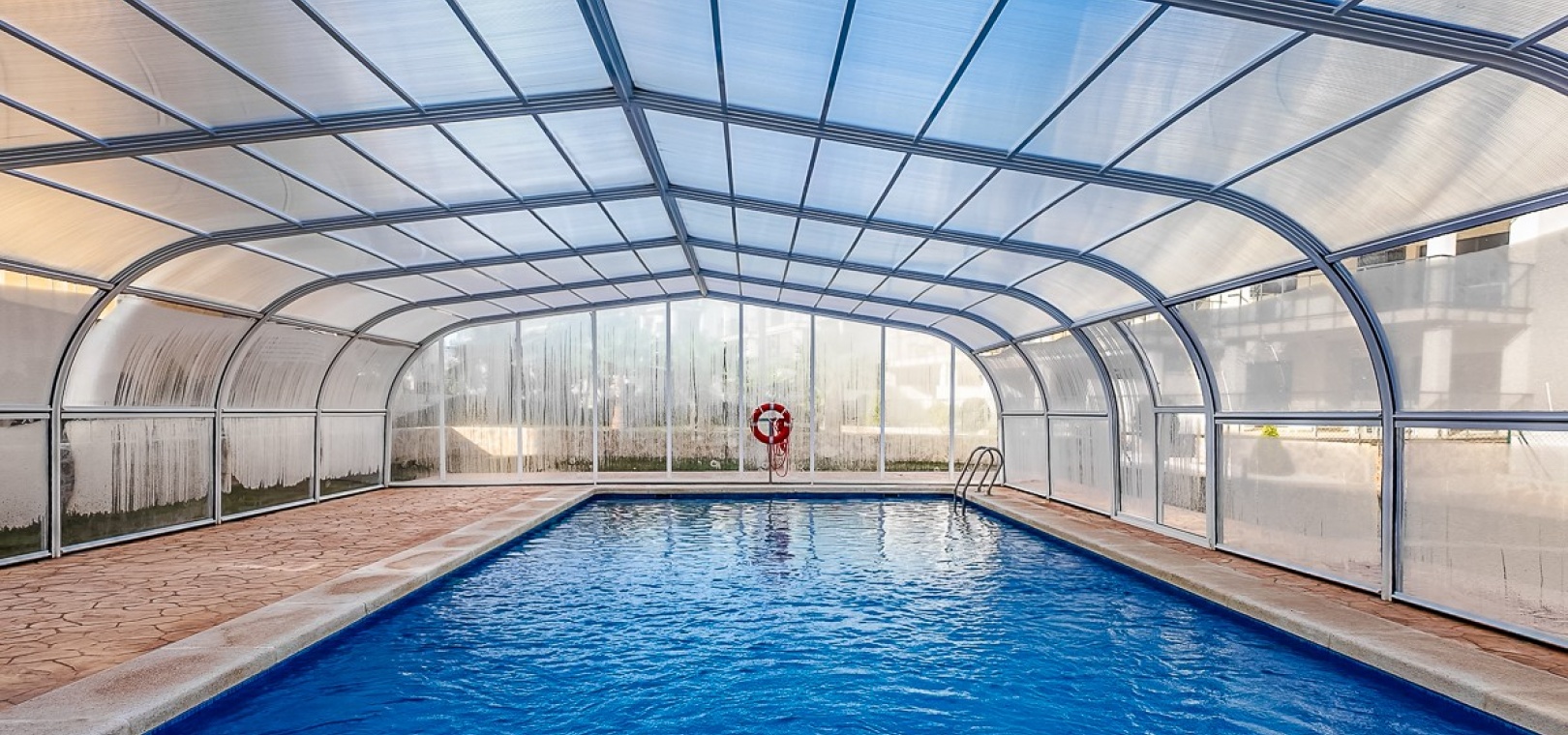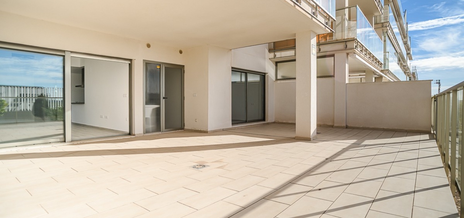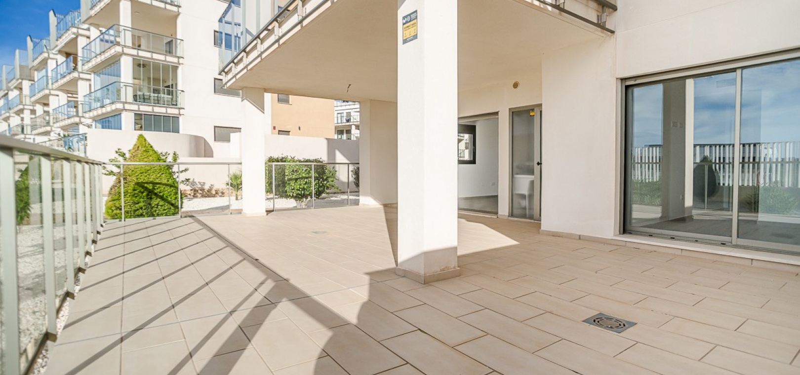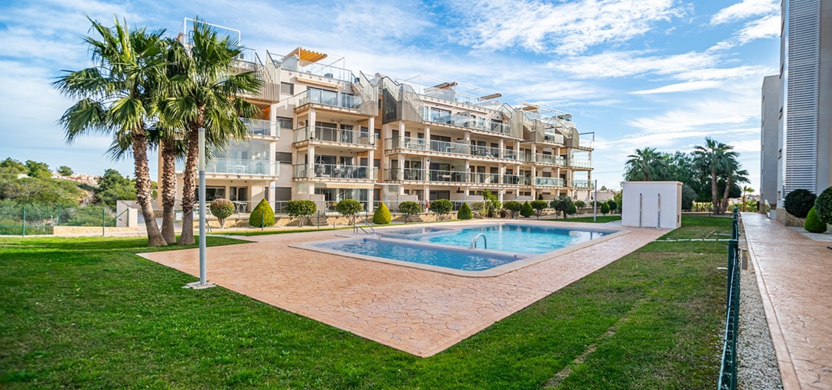 Betreten Sie die weitläufige, nach Süden ausgerichtete Terrasse, die teilweise überdacht und mit Glaswänden versehen ist, um zusätzlichen Nutzraum zu schaffen. Genießen Sie den direkten Zugang zu den wunderschön gepflegten Gemeinschaftsgärten und drei Swimmingpools – darunter ein beheiztes Becken, ein Kinderbecken und ein Whirlpool.
