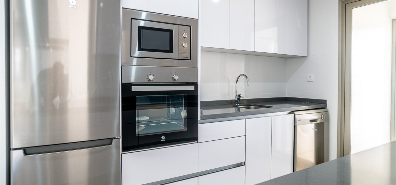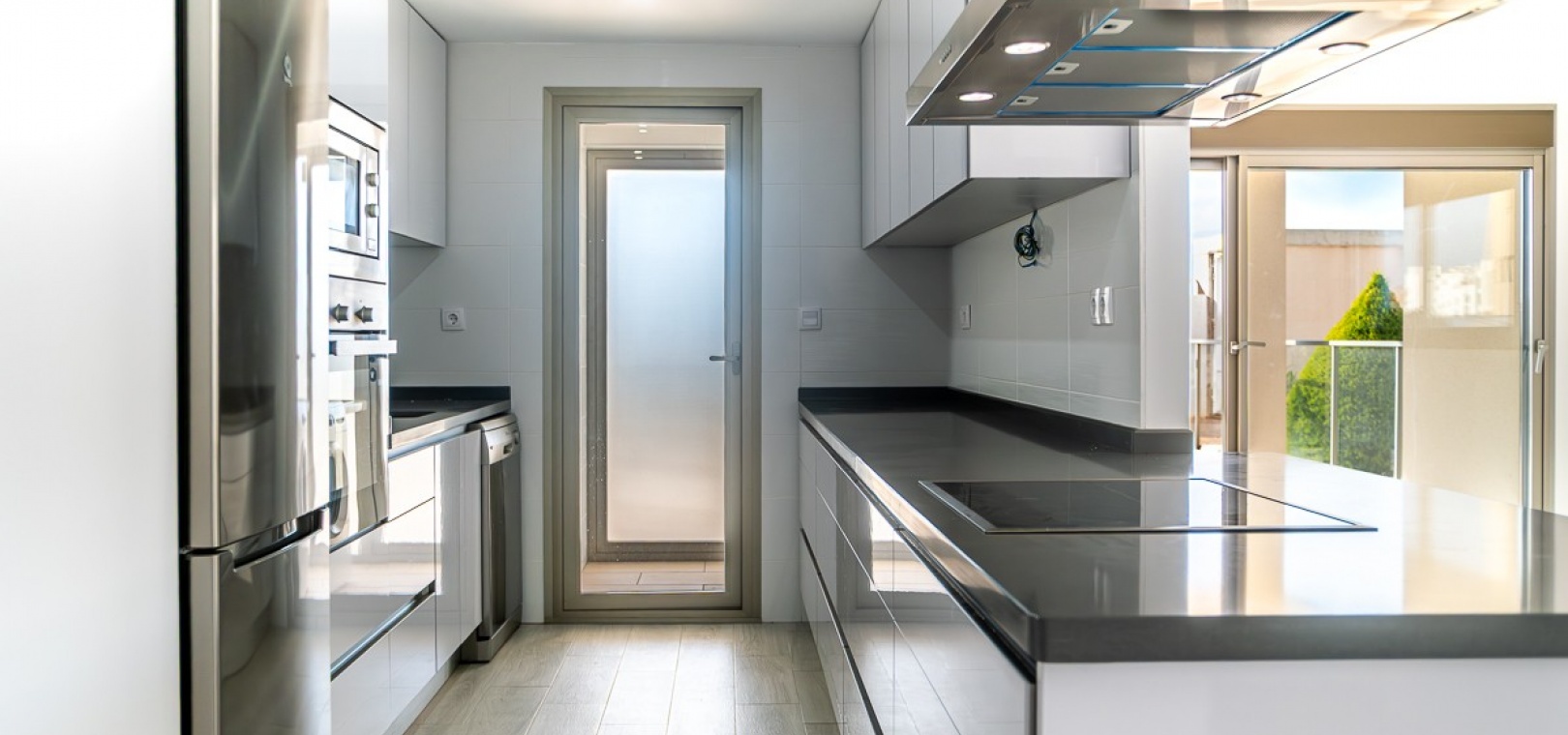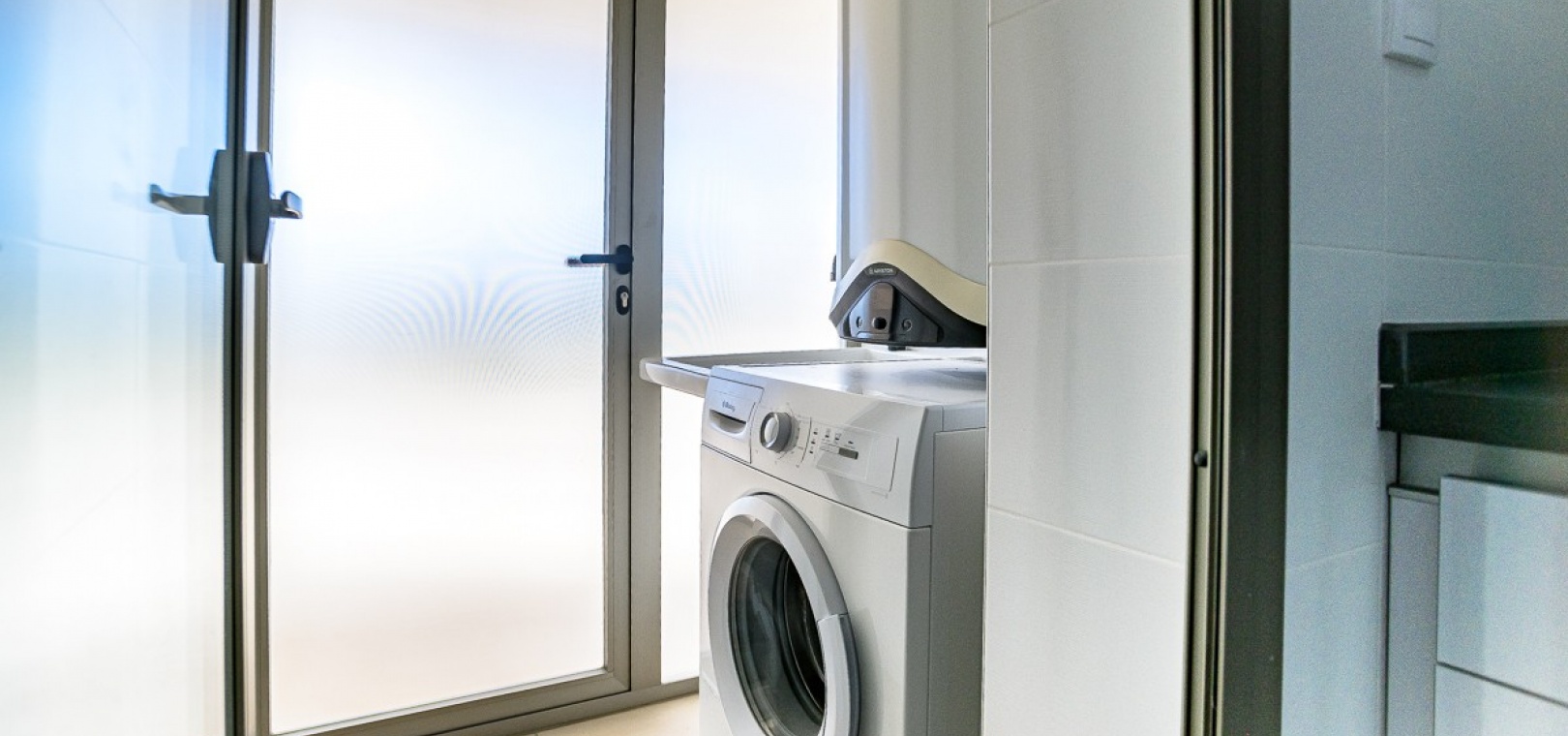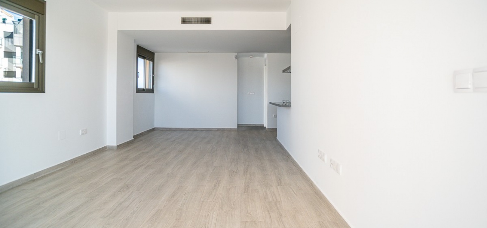 Die Wohnung verfügt über drei Schlafzimmer, darunter eine Master-Suite mit eigenem Badezimmer inklusive Fußbodenheizung, sowie zwei geräumige Gästezimmer. Ein helles und offenes Wohnzimmer geht fließend in die halboffene, voll ausgestattete Küche im amerikanischen Stil über. Ein separater Hauswirtschaftsraum sorgt für zusätzlichen Komfort.