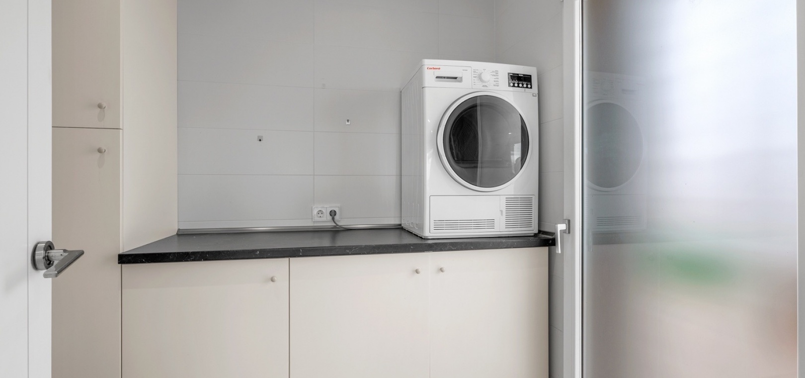 Angrenzend an die Küche befindet sich ein Abstellraum mit einem modernen Kamerasystem und eine Waschküche mit direktem Zugang zum hinteren Teil des Grundstücks für zusätzlichen Komfort. Ein Gäste-WC liegt direkt neben dem Wohnzimmer.