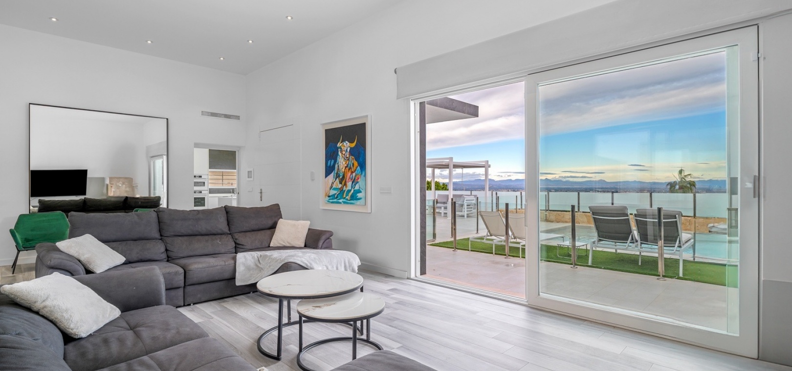 Am Haupteingang setzt eine imposante Drehtür ein markantes architektonisches Statement. Im Inneren empfängt Sie ein heller, offener Wohnbereich mit hohen Decken, moderner Beleuchtung und zwei Glasschiebetüren: Eine führt zur Poolterrasse, die andere zur Außenküche. So wird das Anwesen von natürlichem Licht durchflutet und ein fließender Übergang zwischen Innen- und Außenbereich geschaffen.