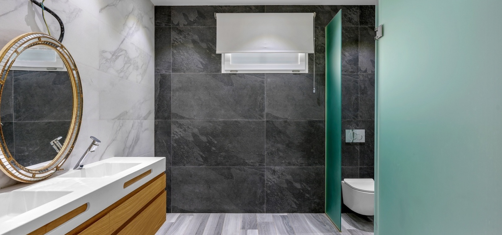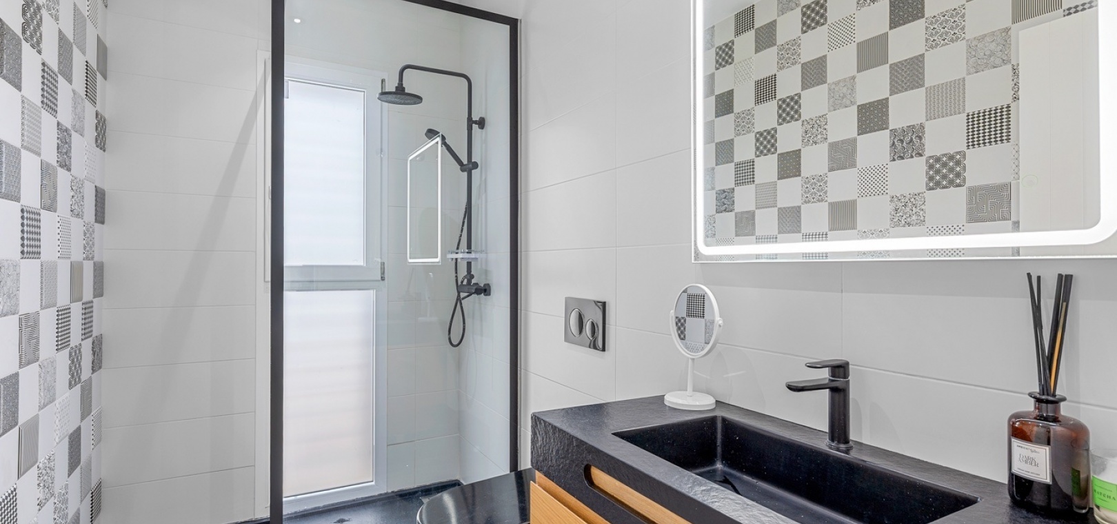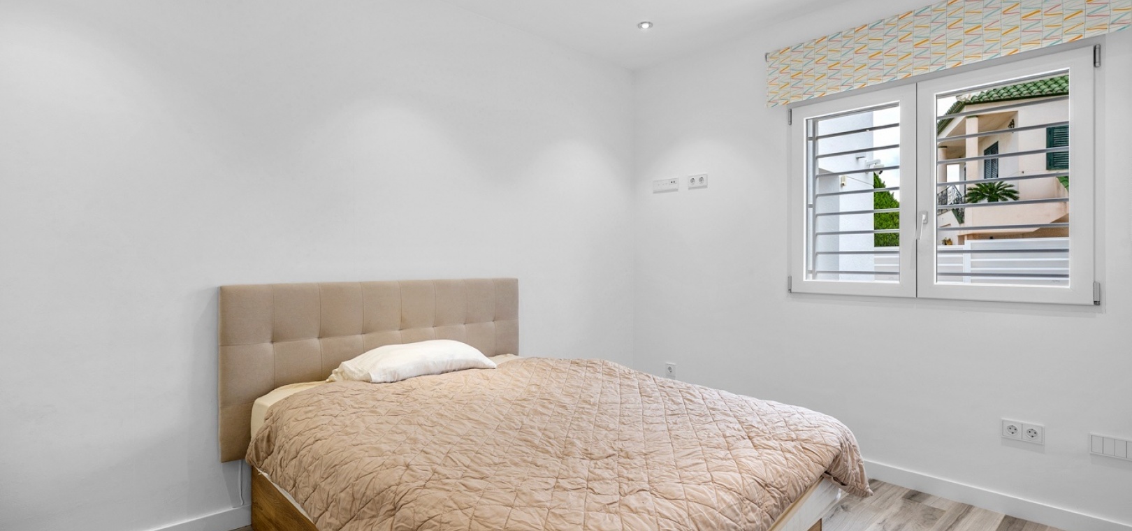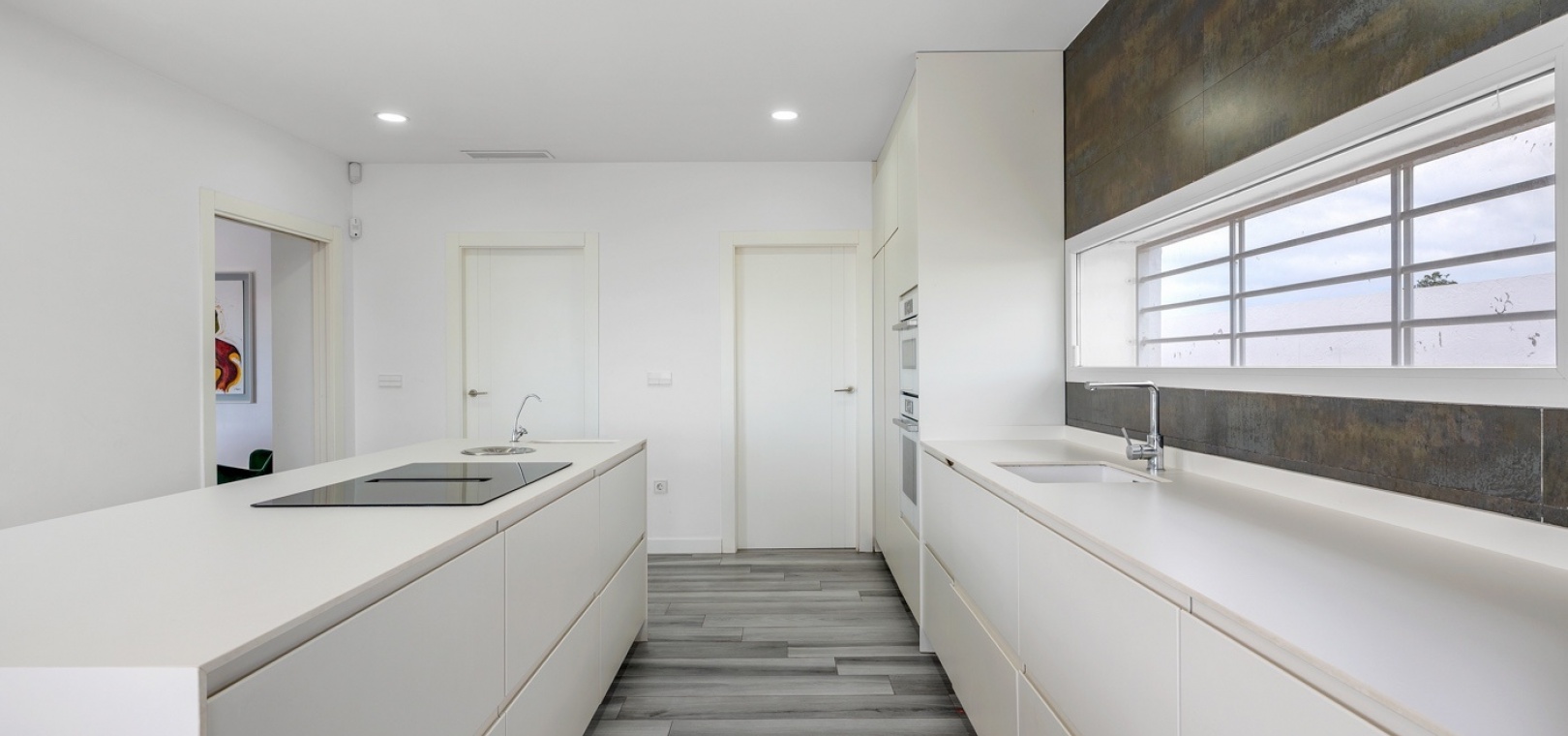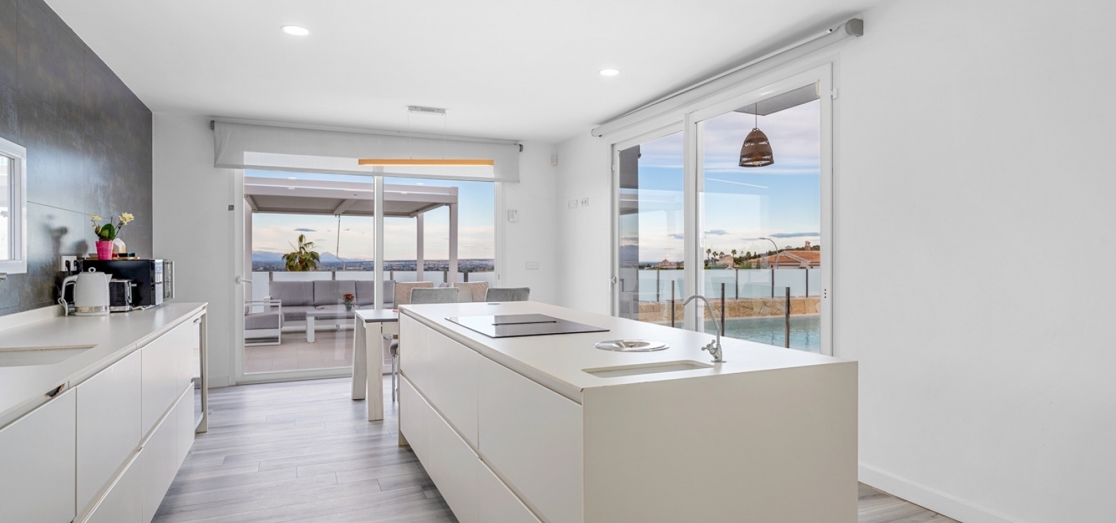 Angrenzend an das Wohnzimmer befindet sich eine luxuriöse Küche, die mit hochwertigen Bosch-Geräten ausgestattet ist, darunter ein integrierter Backofen, eine Mikrowelle und ein Geschirrspüler. Die moderne Kücheninsel verfügt über ein Wasserfiltersystem, einen Eiswürfelbereiter, ein Induktionskochfeld mit integrierter Dunstabzugshaube, ausklappbare Steckdosen und einen Weinkühlschrank. Das durchdachte Design vereint Funktionalität und Stil und maximiert dank zweier zusätzlicher Schiebetüren, die direkten Zugang zum Pool bieten, den Lichteinfall.