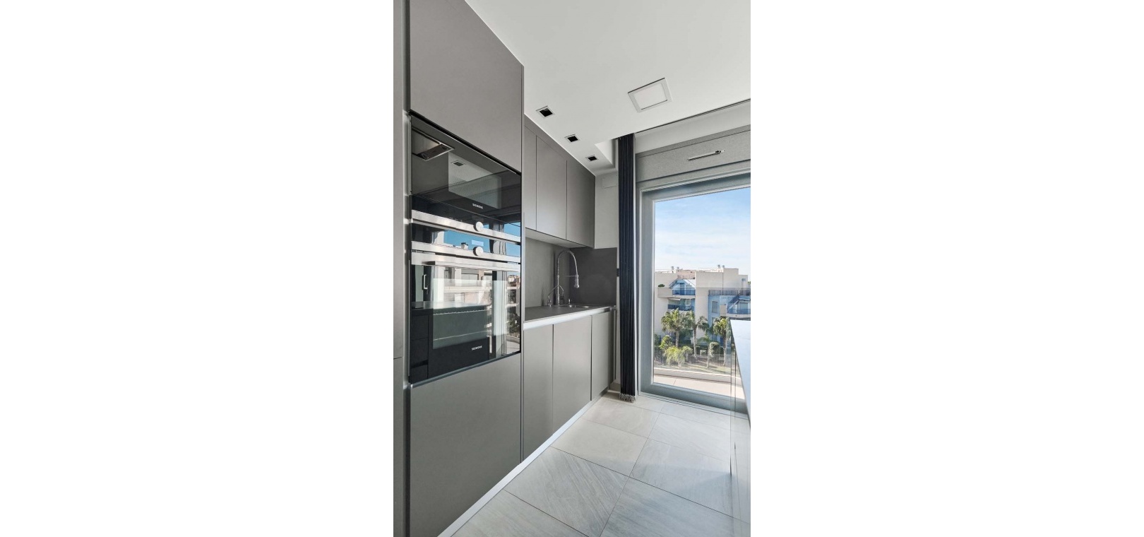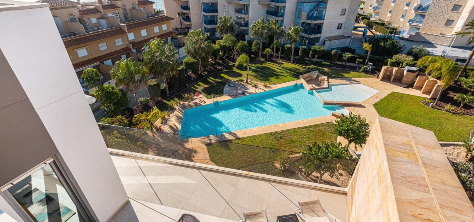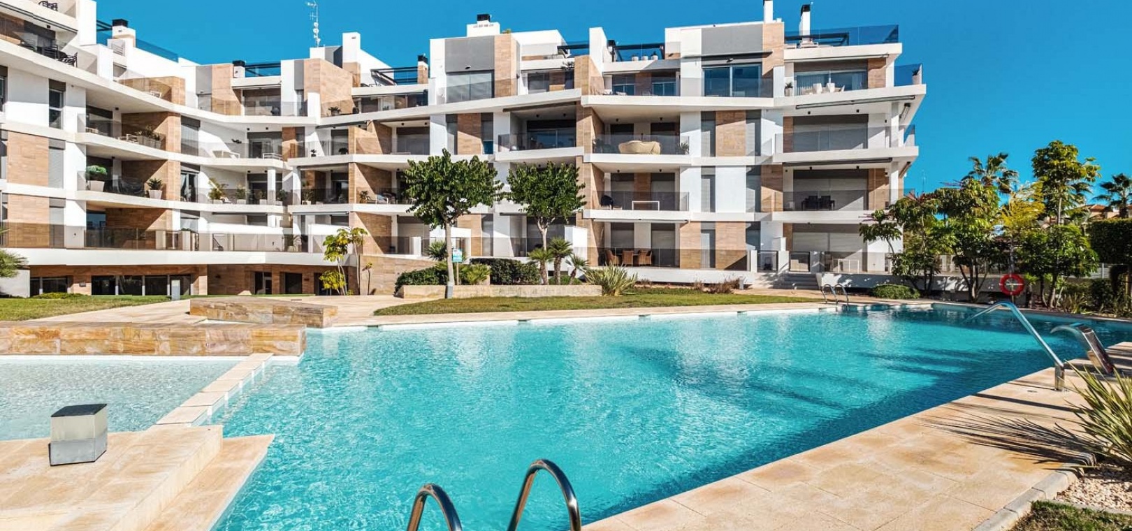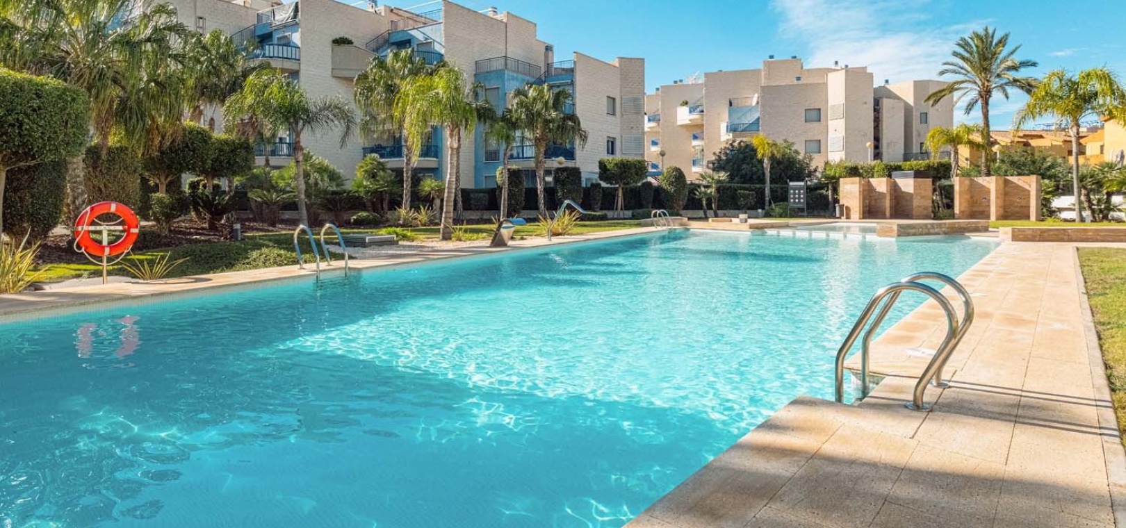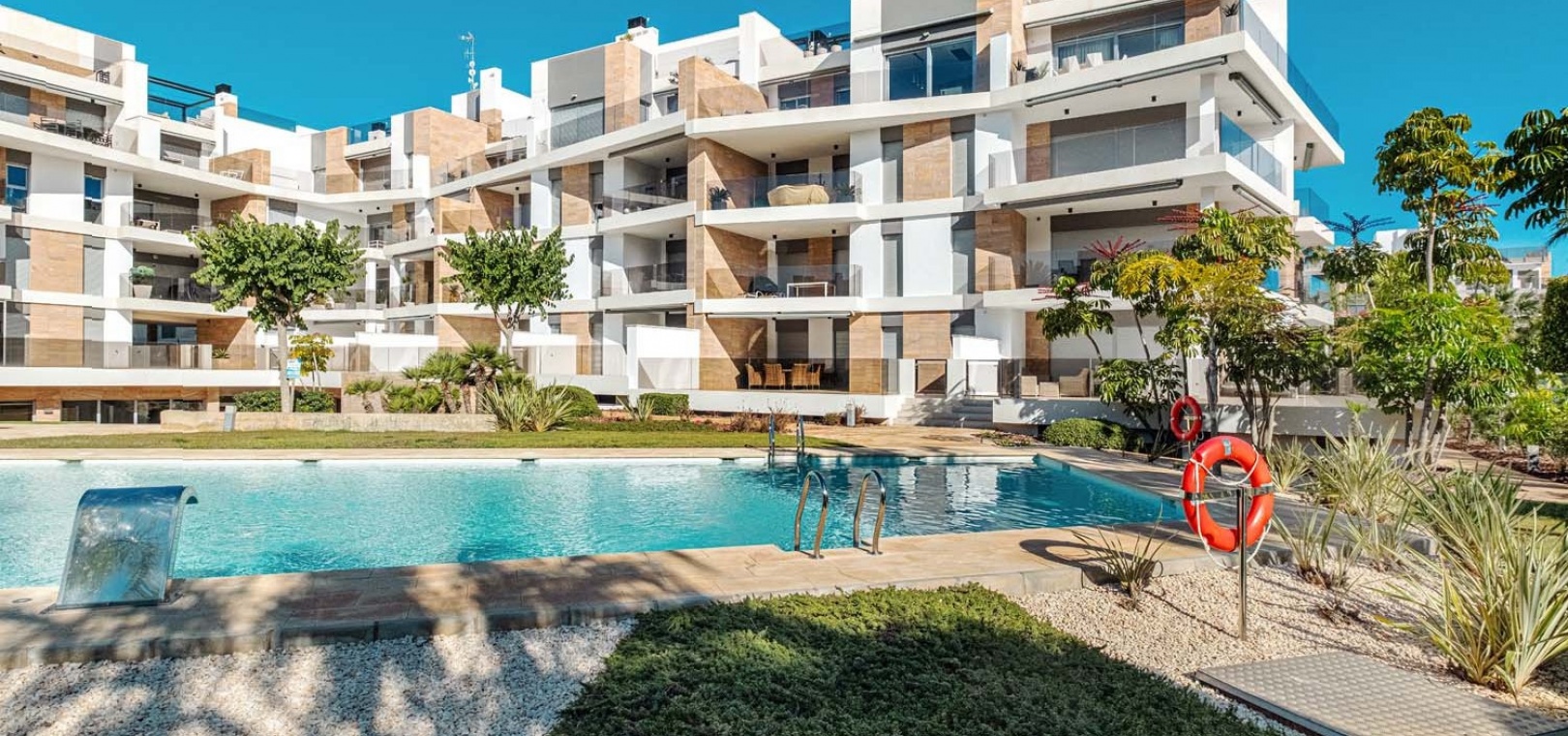 Die Wohnung besticht durch einen hellen und geräumigen offenen Wohn- und Essbereich mit einer eleganten, voll ausgestatteten modernen Küche inklusive Kochinsel – perfekt für den Alltag und zum Bewirten von Gästen. Ein separater Hauswirtschaftsraum bietet zusätzlichen Stauraum und beherbergt diskret verstaute Elektrogeräte. Vom Wohnbereich aus gelangen Sie direkt auf eine großzügige Terrasse mit Blick auf den gepflegten Gemeinschaftspool und die angelegten Gärten – ideal zum Entspannen oder für Mahlzeiten im Freien.
