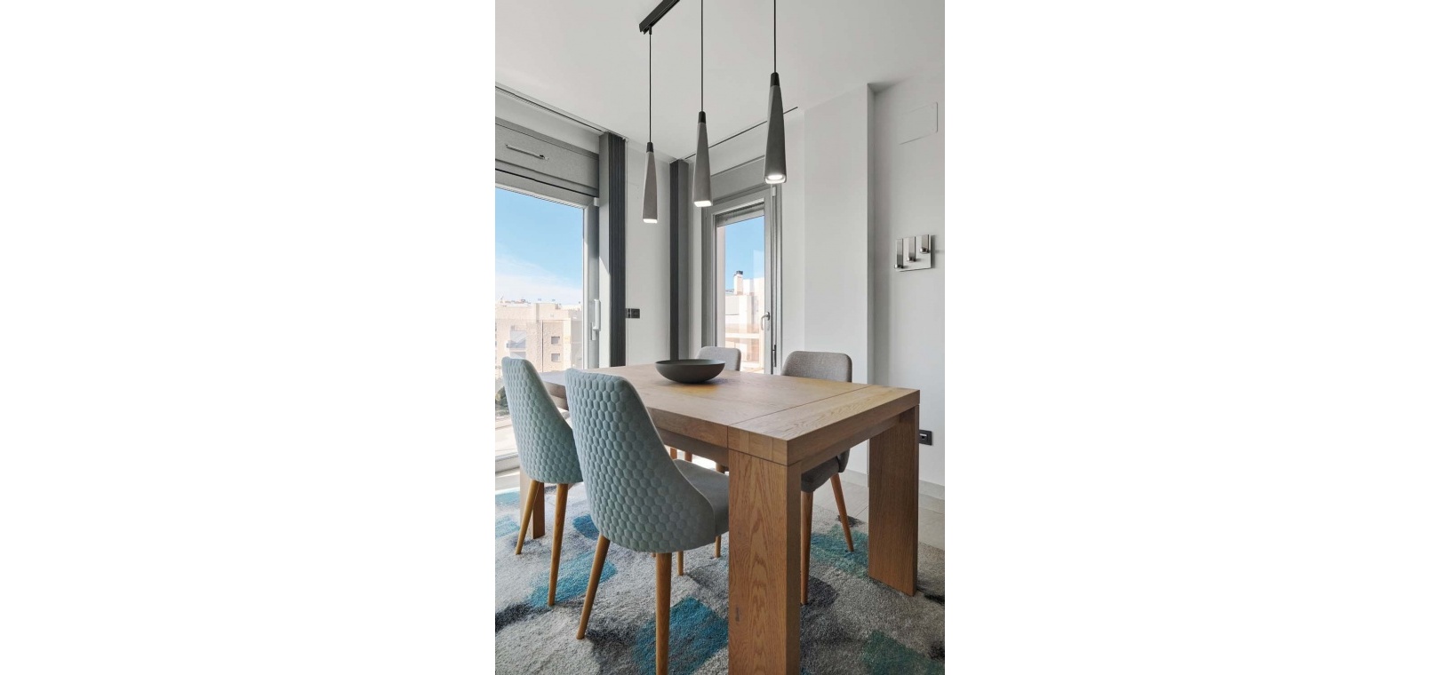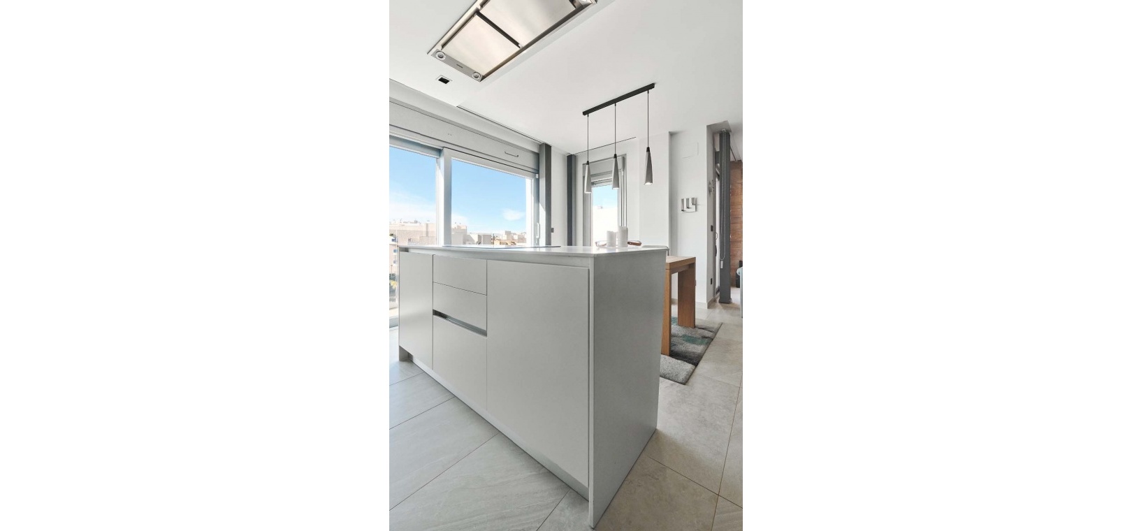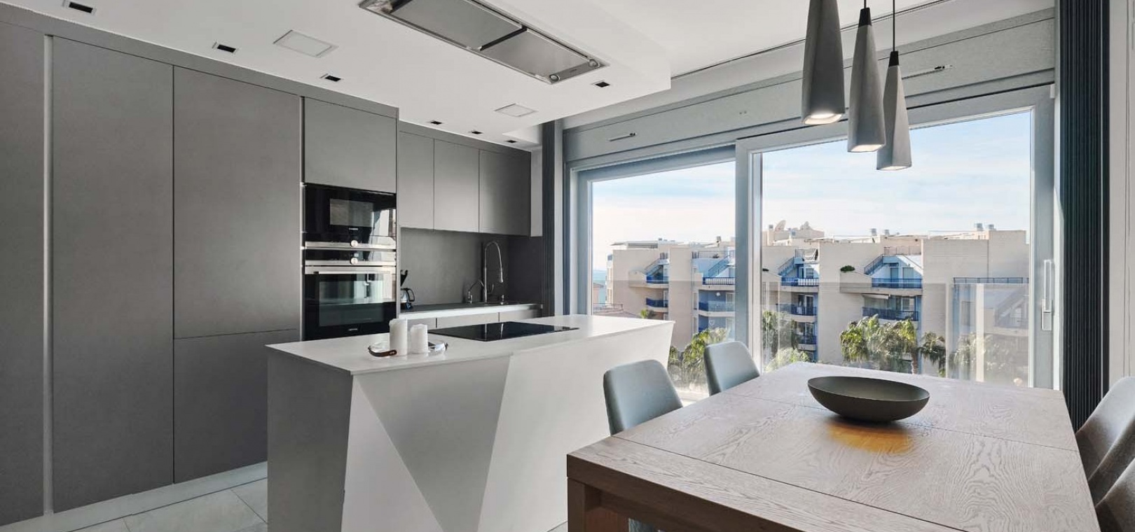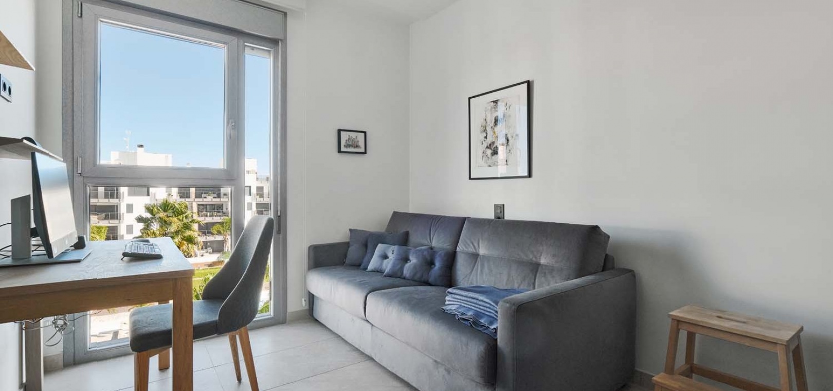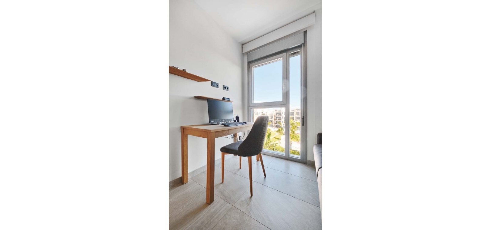Die Wohnung besticht durch einen hellen und geräumigen offenen Wohn- und Essbereich mit einer eleganten, voll ausgestatteten modernen Küche inklusive Kochinsel – perfekt für den Alltag und zum Bewirten von Gästen. Ein separater Hauswirtschaftsraum bietet zusätzlichen Stauraum und beherbergt diskret verstaute Elektrogeräte. Vom Wohnbereich aus gelangen Sie direkt auf eine großzügige Terrasse mit Blick auf den gepflegten Gemeinschaftspool und die angelegten Gärten – ideal zum Entspannen oder für Mahlzeiten im Freien.