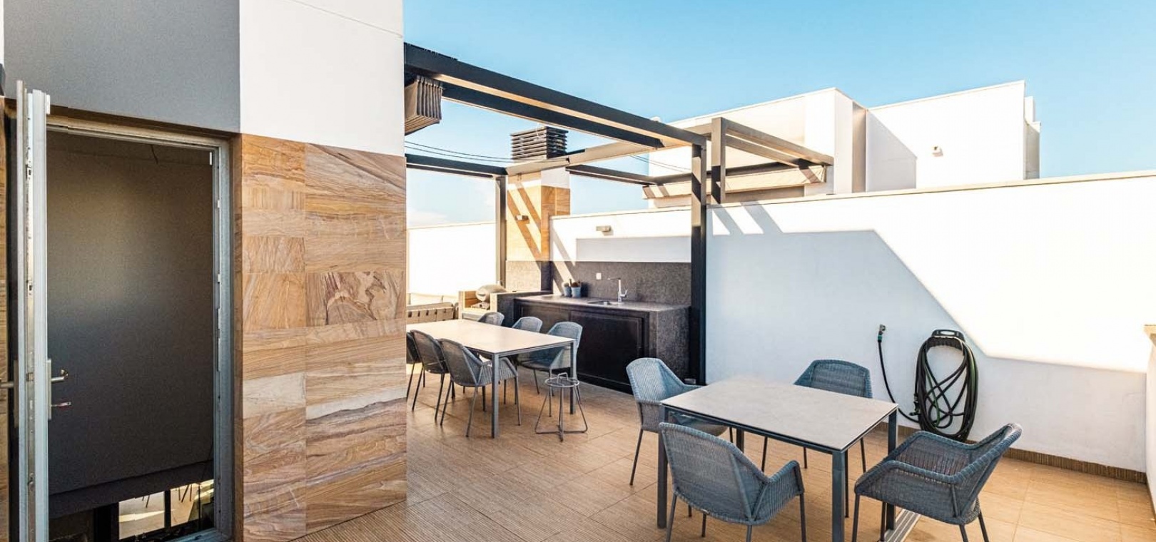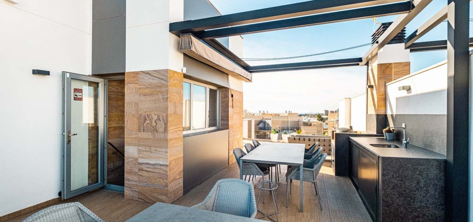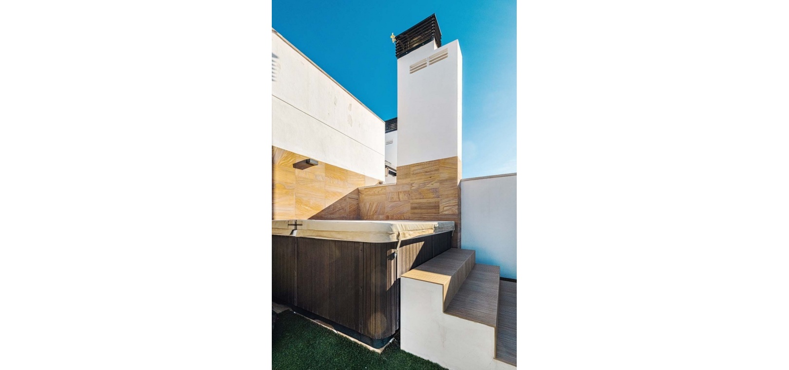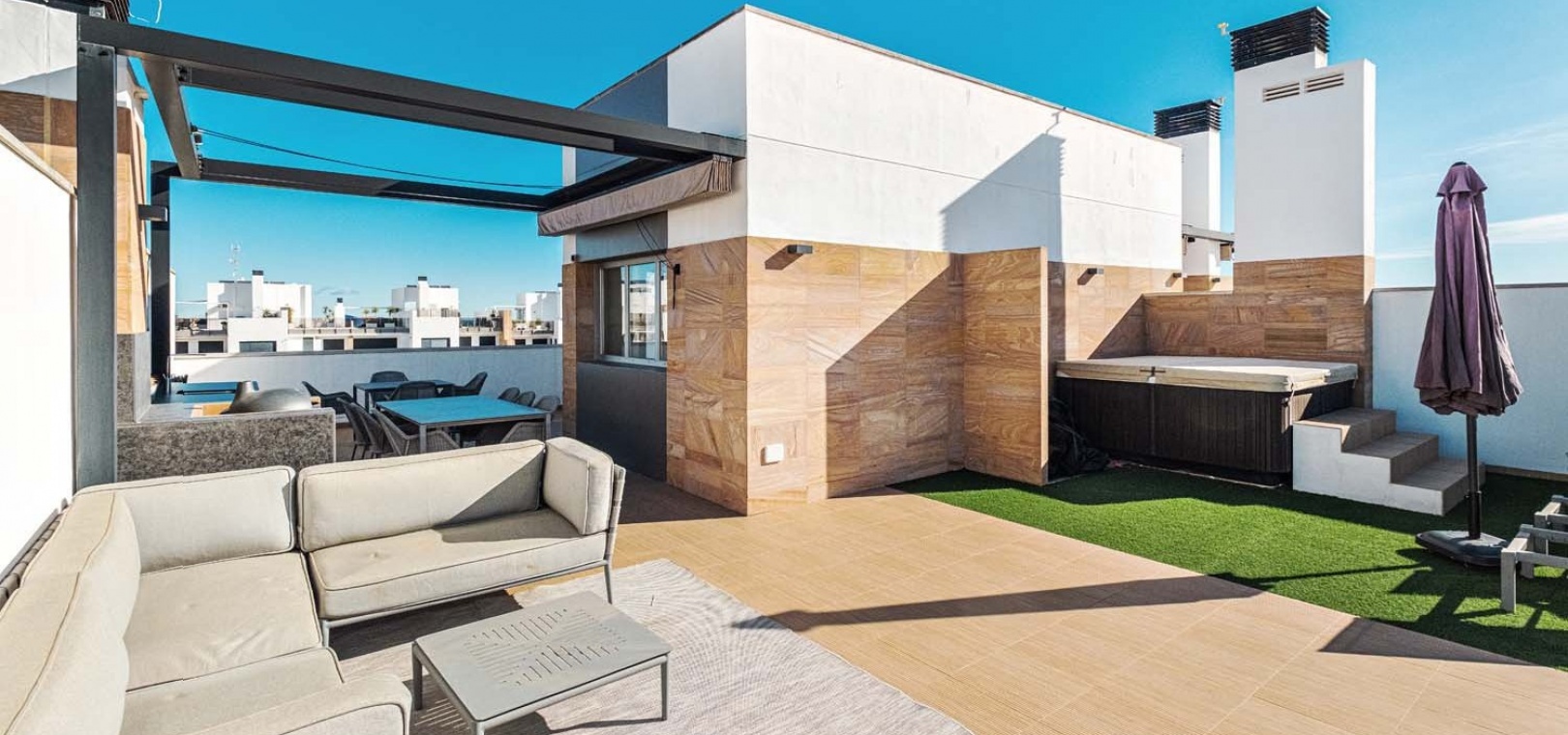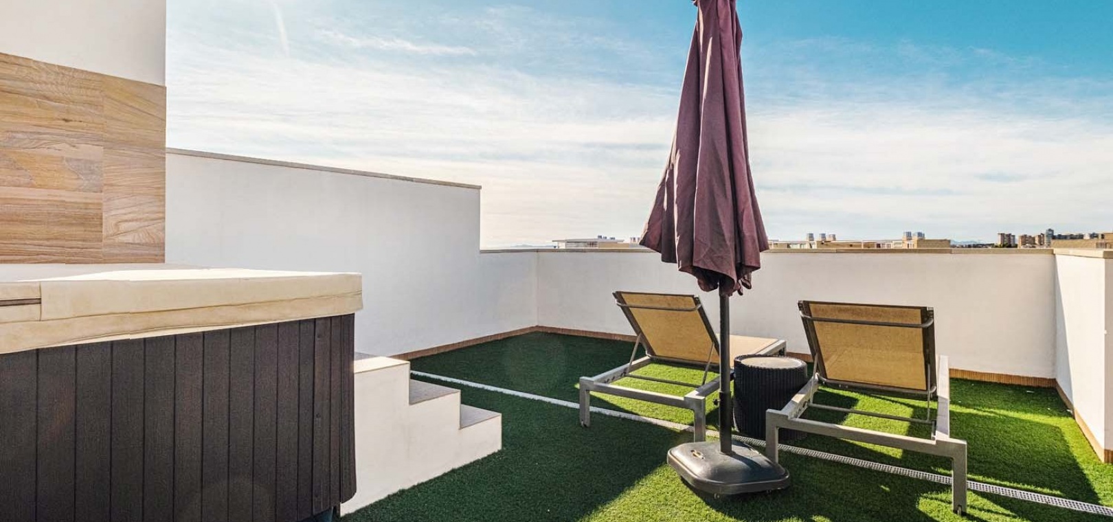Eine elegante Innentreppe führt zum absoluten Highlight des Hauses: einem spektakulären privaten Dachsolarium. Dieser beeindruckende Bereich bietet einen Whirlpool, eine Außenküche, eine Infrarotheizung und viel Platz zum Entspannen und für gesellige Stunden – alles vor einer atemberaubenden Kulisse aus Meer und Küste.