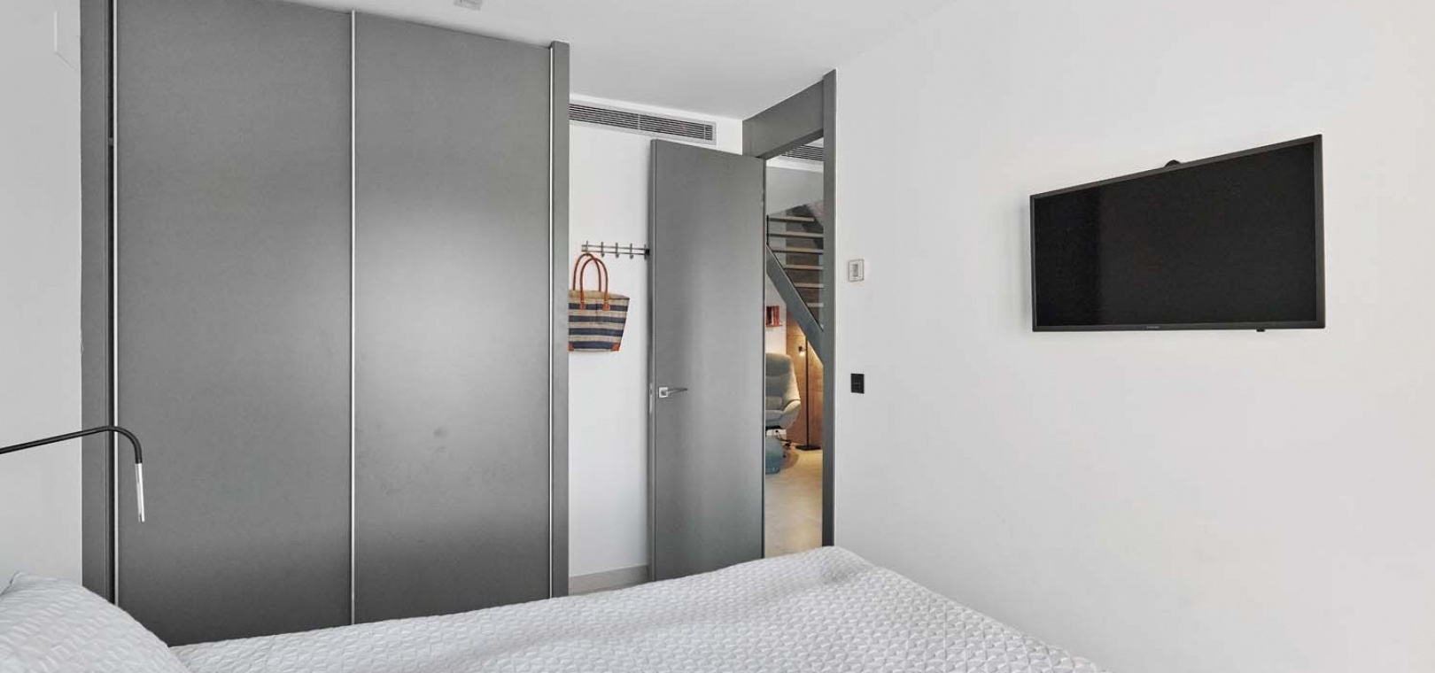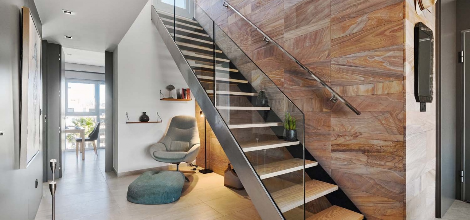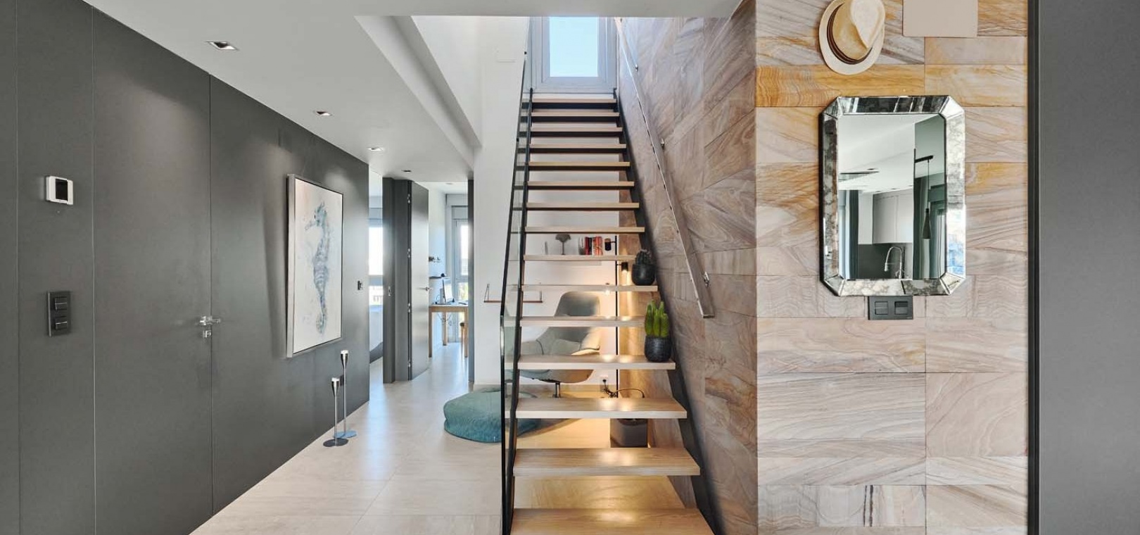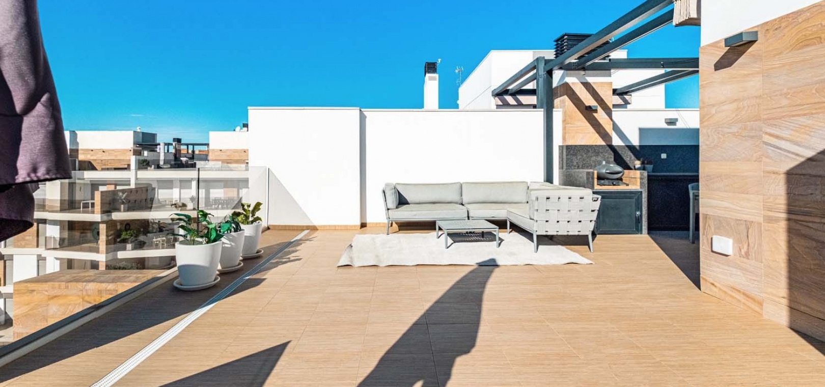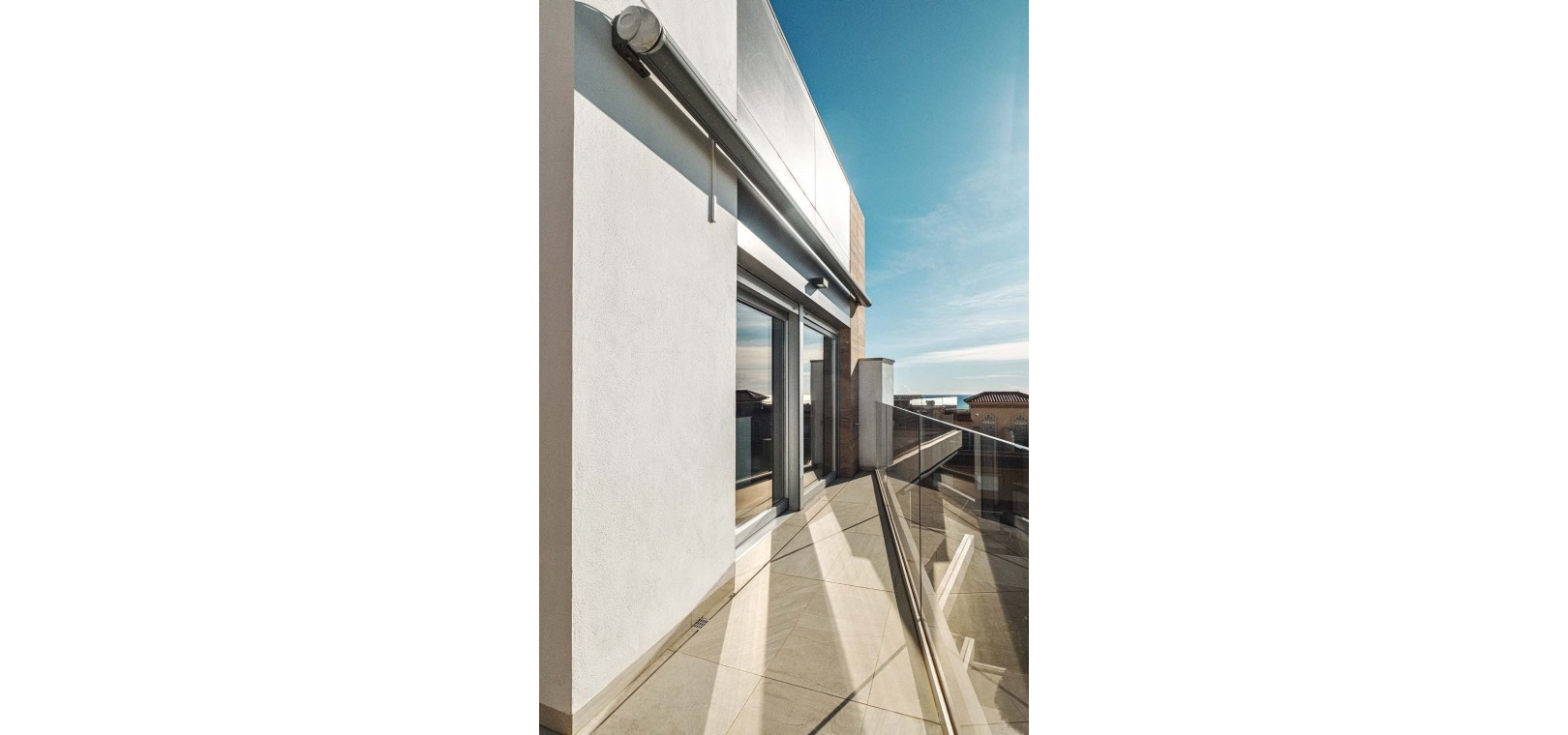 Eine elegante Innentreppe führt zum absoluten Highlight des Hauses: einem spektakulären privaten Dachsolarium. Dieser beeindruckende Bereich bietet einen Whirlpool, eine Außenküche, eine Infrarotheizung und viel Platz zum Entspannen und für gesellige Stunden – alles vor einer atemberaubenden Kulisse aus Meer und Küste.