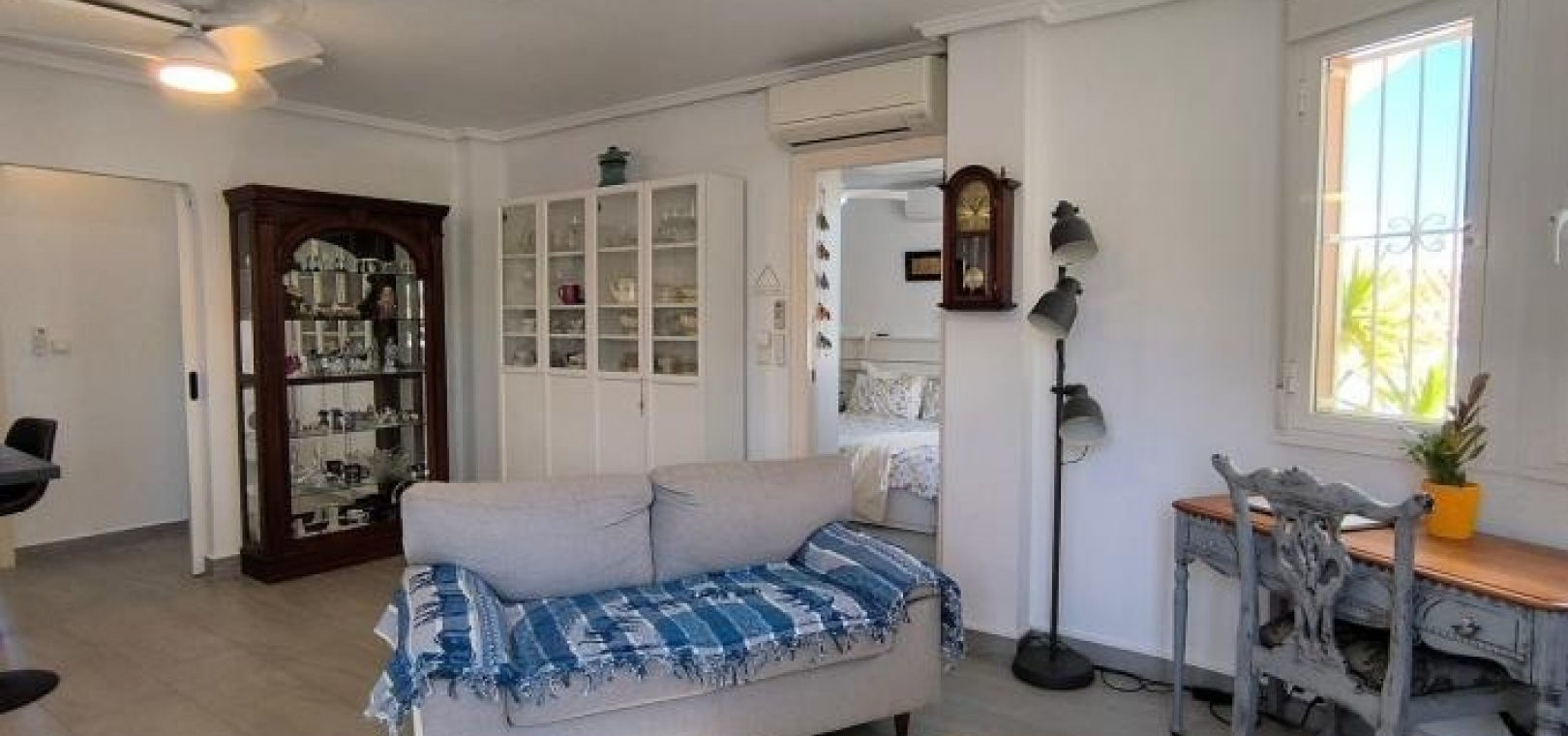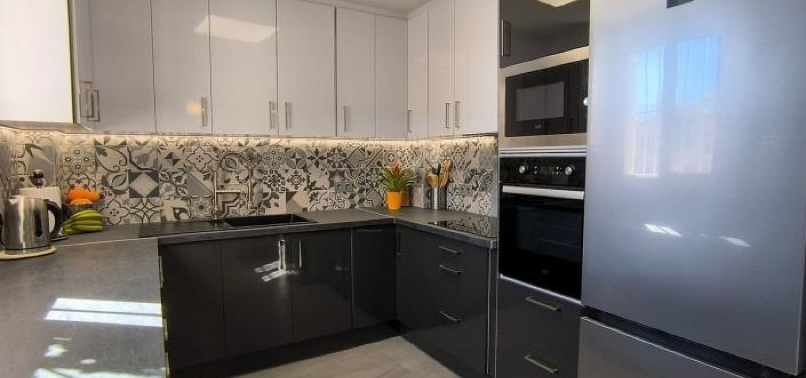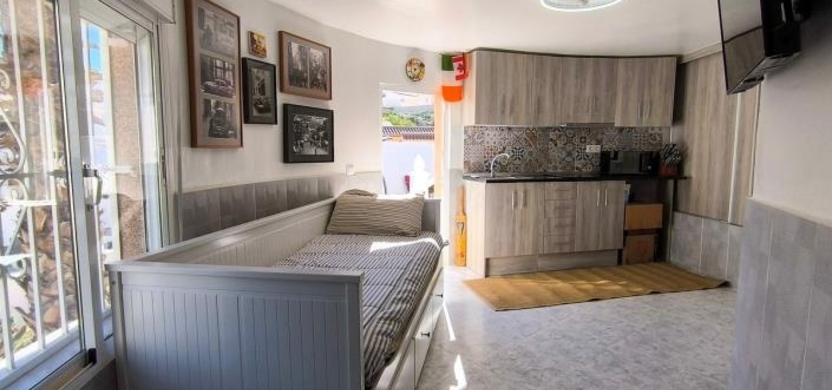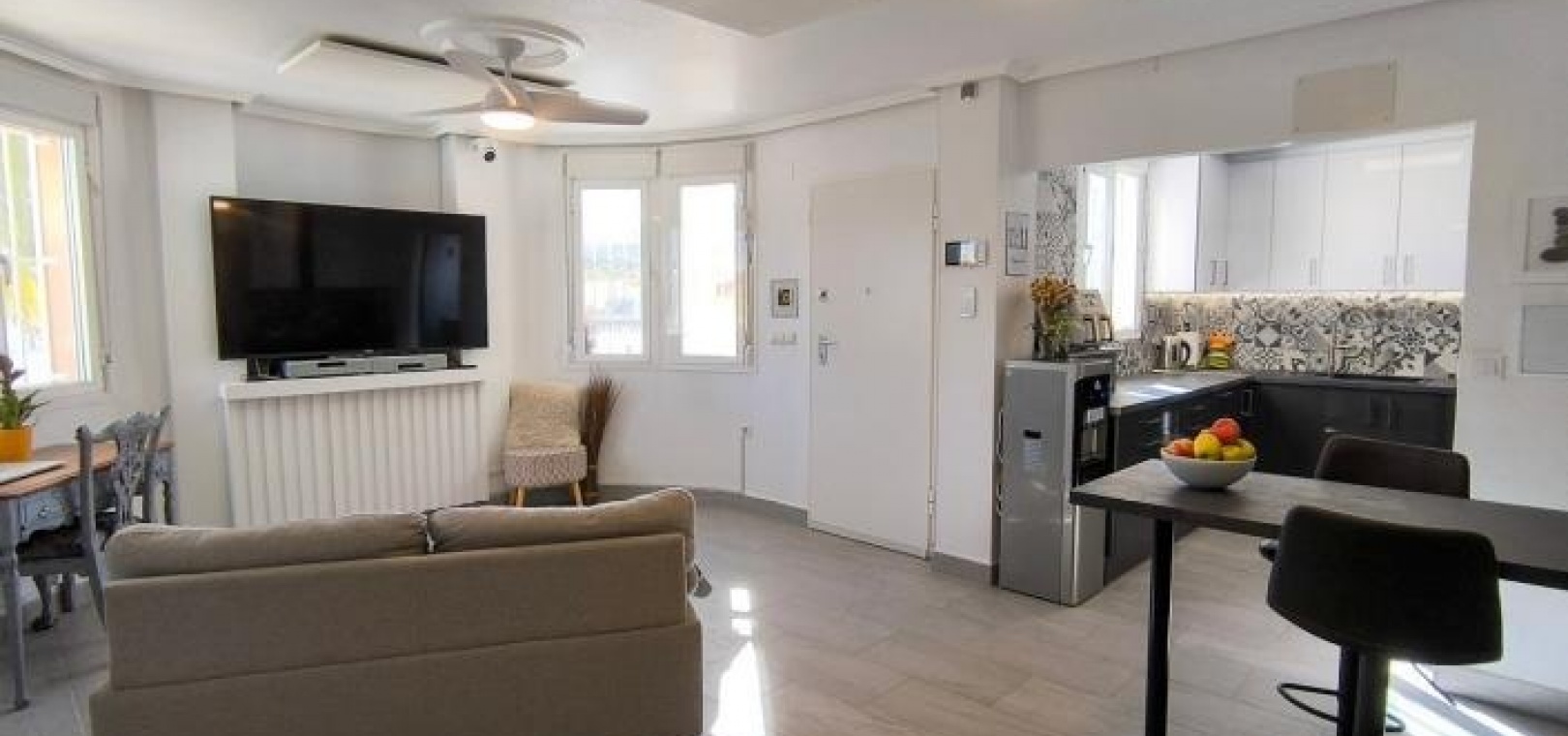 Man betritt das Haus über eine großzügige, umlaufende Terrasse und gelangt in einen hellen Wohn- und Essbereich, der das einladende Herzstück des Anwesens bildet. Infrarot-Heizpaneele und Klimaanlage sorgen ganzjährig für angenehme Temperaturen. Direkt neben dem Wohnbereich befindet sich eine brandneue, moderne Küche, die Stil und Funktionalität vereint.