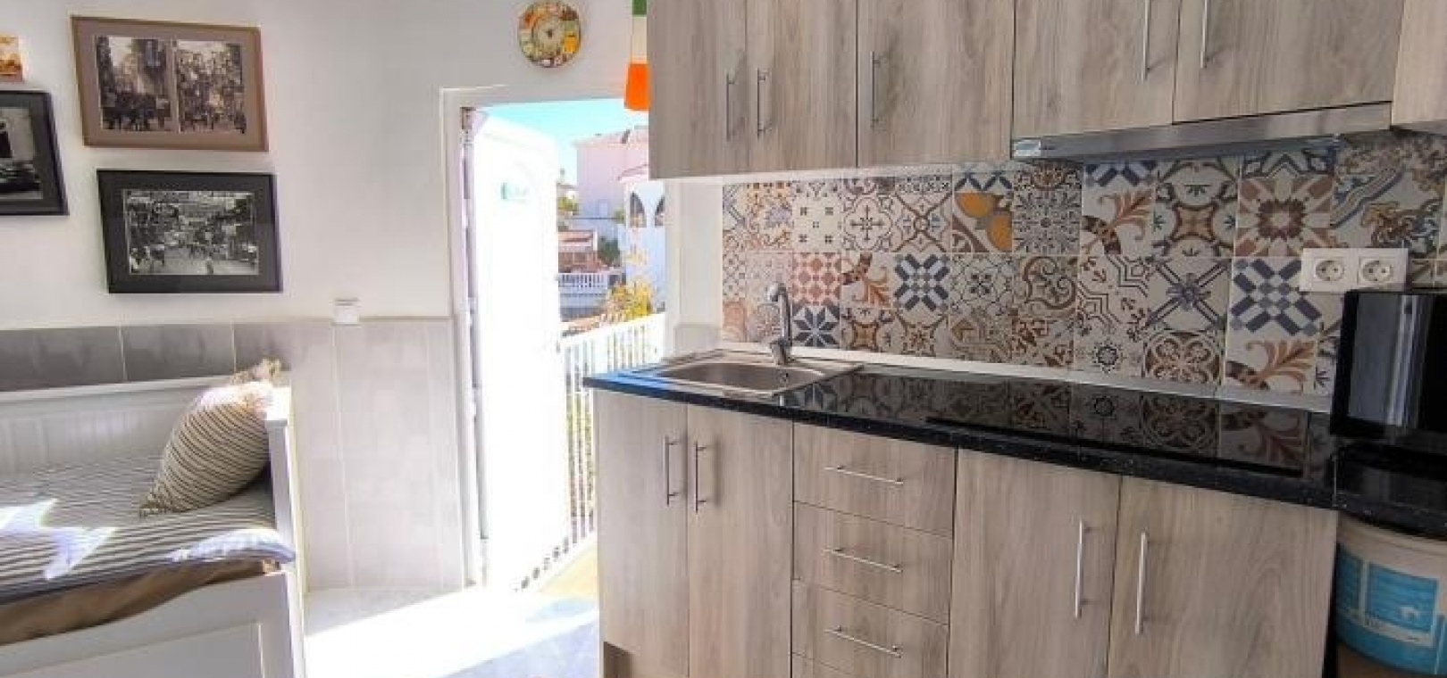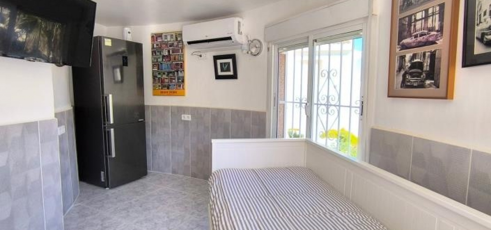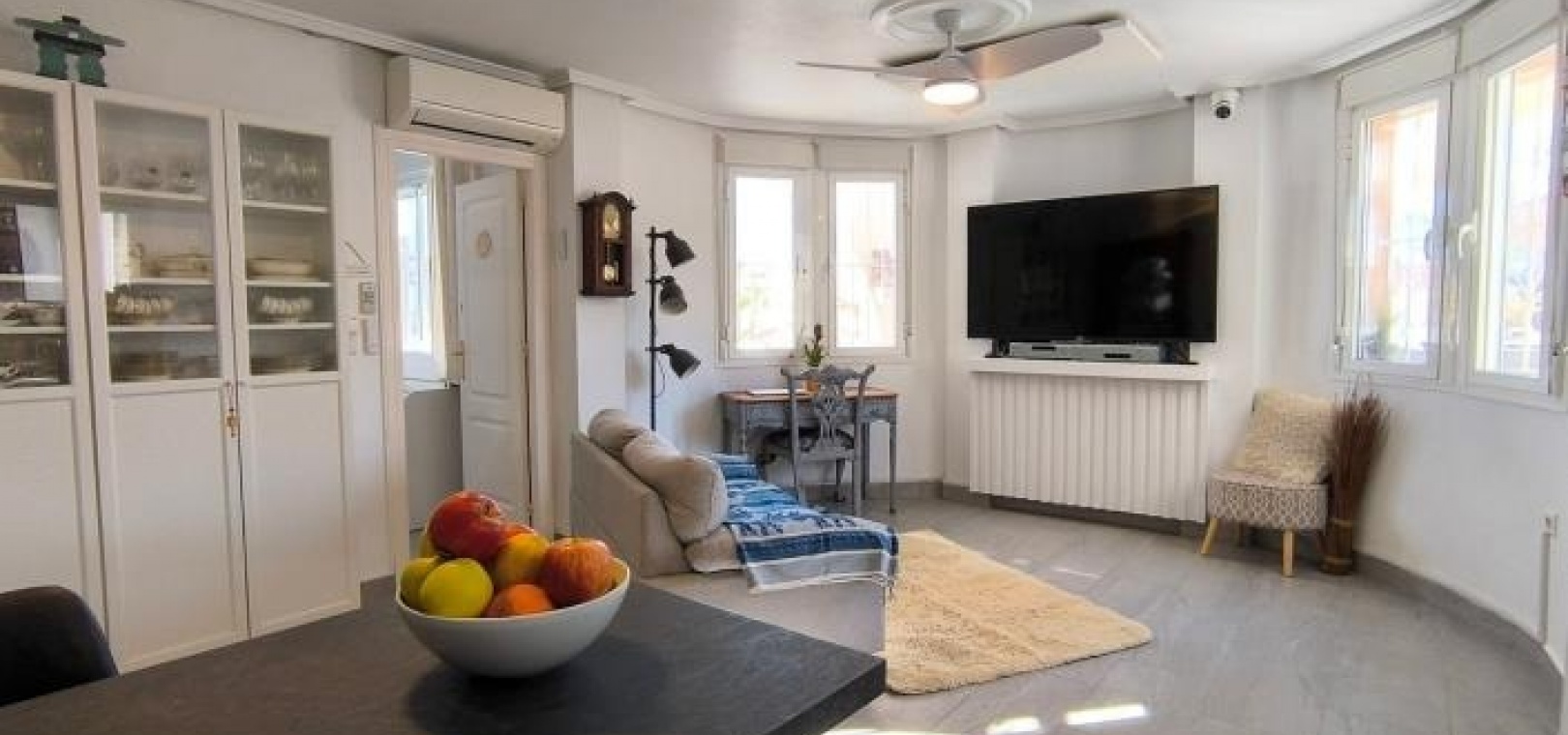 Man betritt das Haus über eine großzügige, umlaufende Terrasse und gelangt in einen hellen Wohn- und Essbereich, der das einladende Herzstück des Anwesens bildet. Infrarot-Heizpaneele und Klimaanlage sorgen ganzjährig für angenehme Temperaturen. Direkt neben dem Wohnbereich befindet sich eine brandneue, moderne Küche, die Stil und Funktionalität vereint.