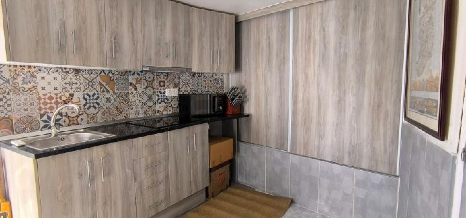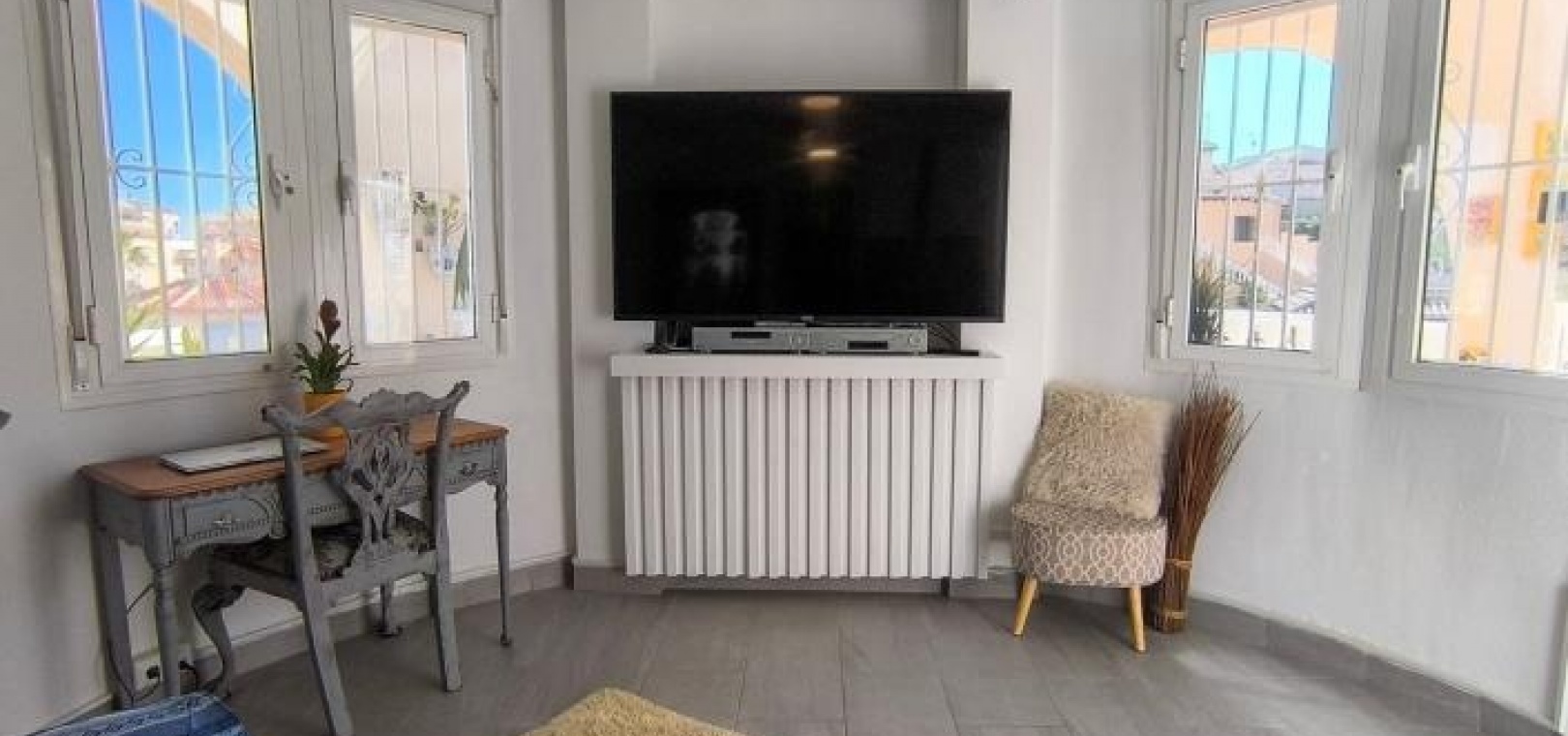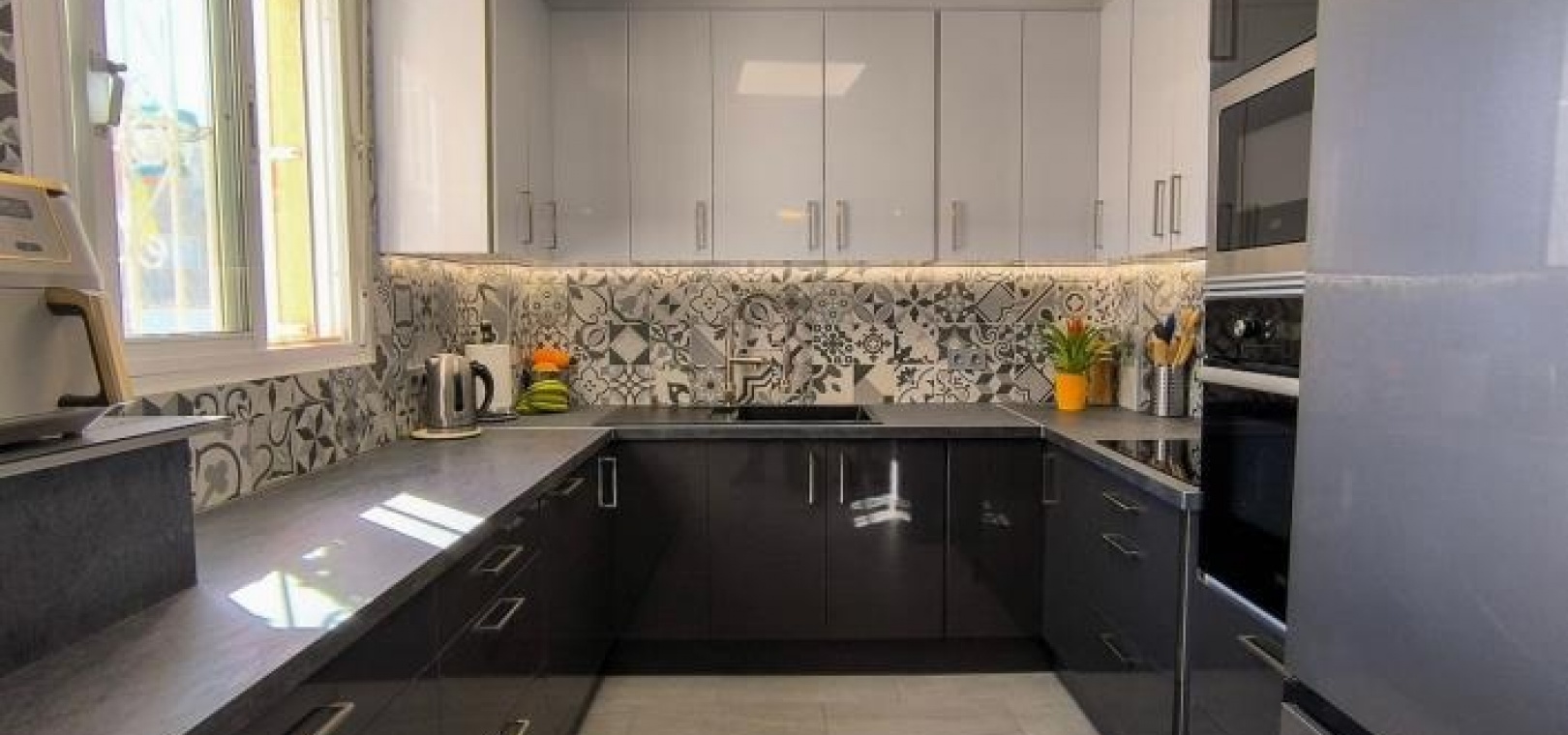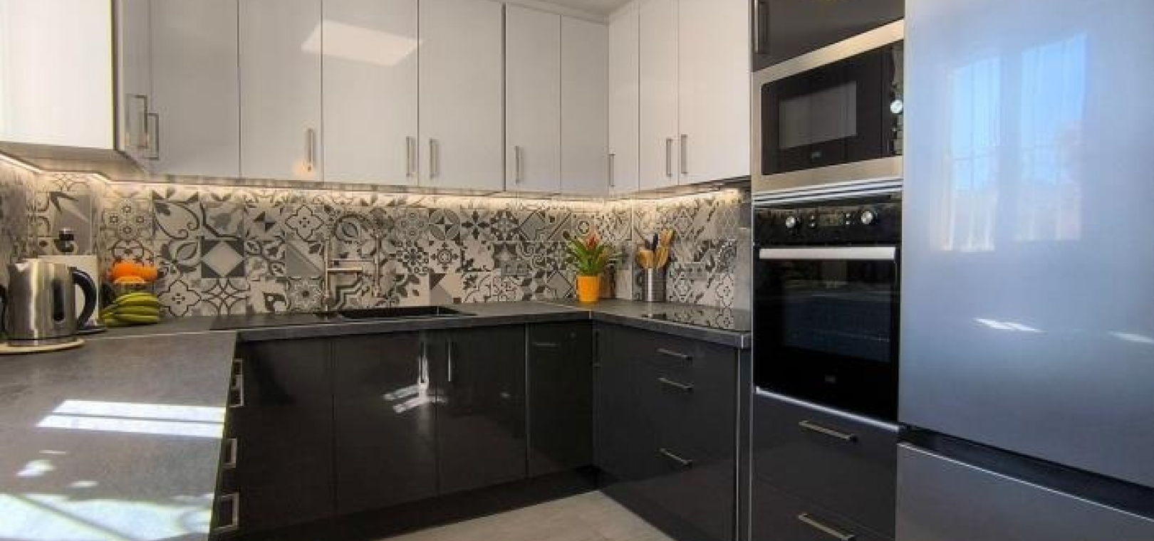 Man betritt das Haus über eine großzügige, umlaufende Terrasse und gelangt in einen hellen Wohn- und Essbereich, der das einladende Herzstück des Anwesens bildet. Infrarot-Heizpaneele und Klimaanlage sorgen ganzjährig für angenehme Temperaturen. Direkt neben dem Wohnbereich befindet sich eine brandneue, moderne Küche, die Stil und Funktionalität vereint.