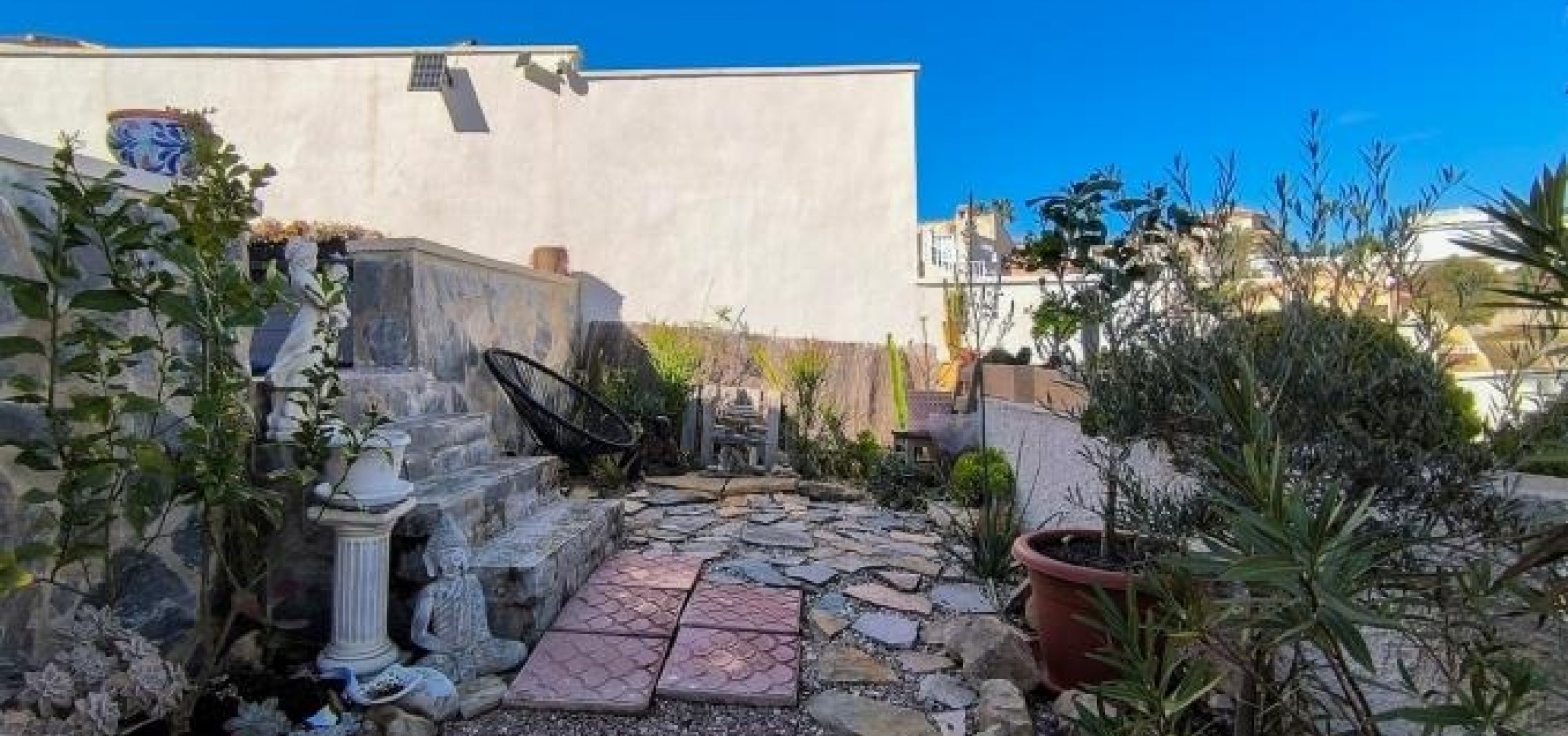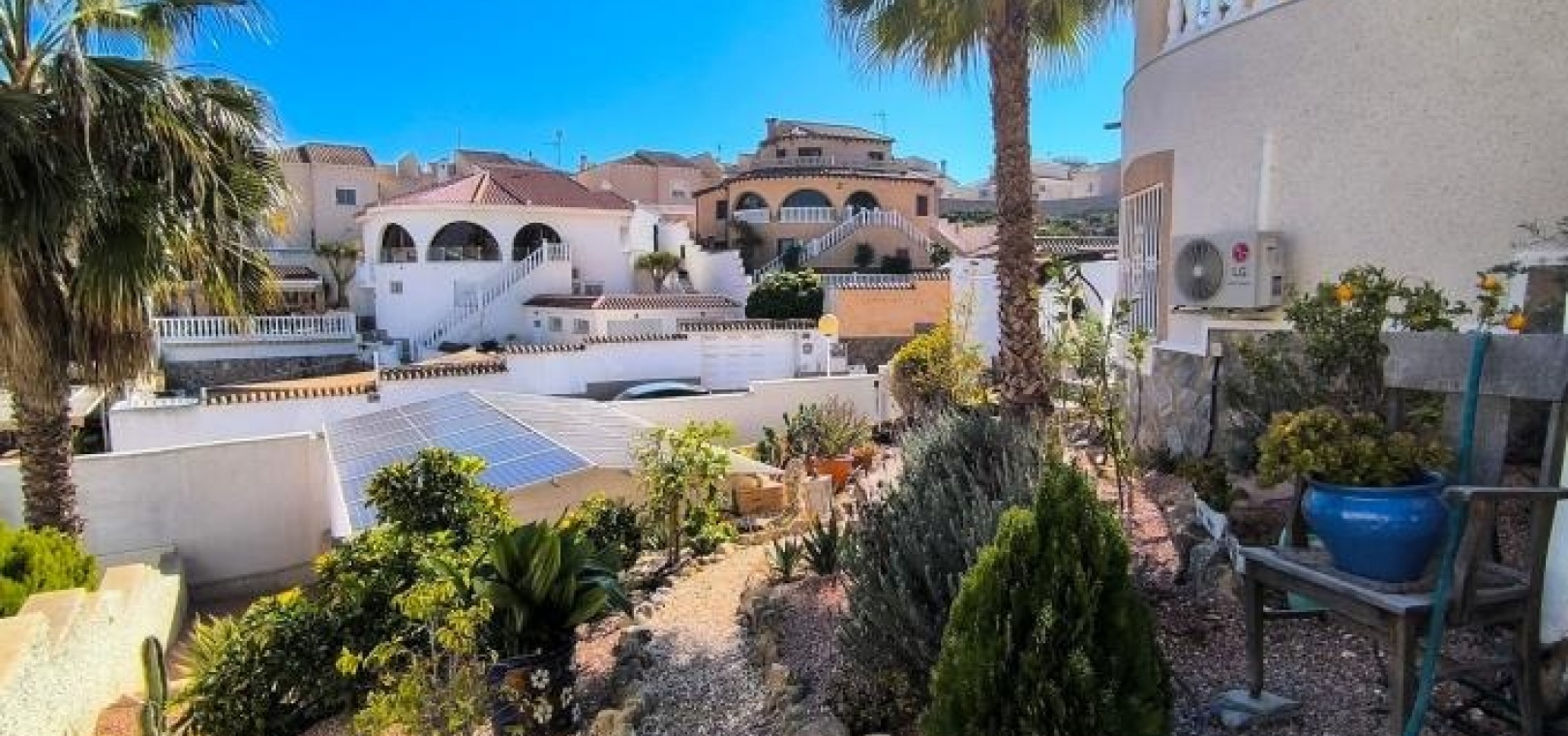 Draußen bietet die großzügige Poolterrasse viel Platz zum Sonnenbaden und für gesellige Stunden, während weitere Terrassen den ganzen Tag über schattige Sitzgelegenheiten bieten. Die hintere Terrasse genießt die späte Nachmittagssonne und einen ungestörten Ausblick. Zwölf Solarpaneele über der Garage verbessern die Energieeffizienz.