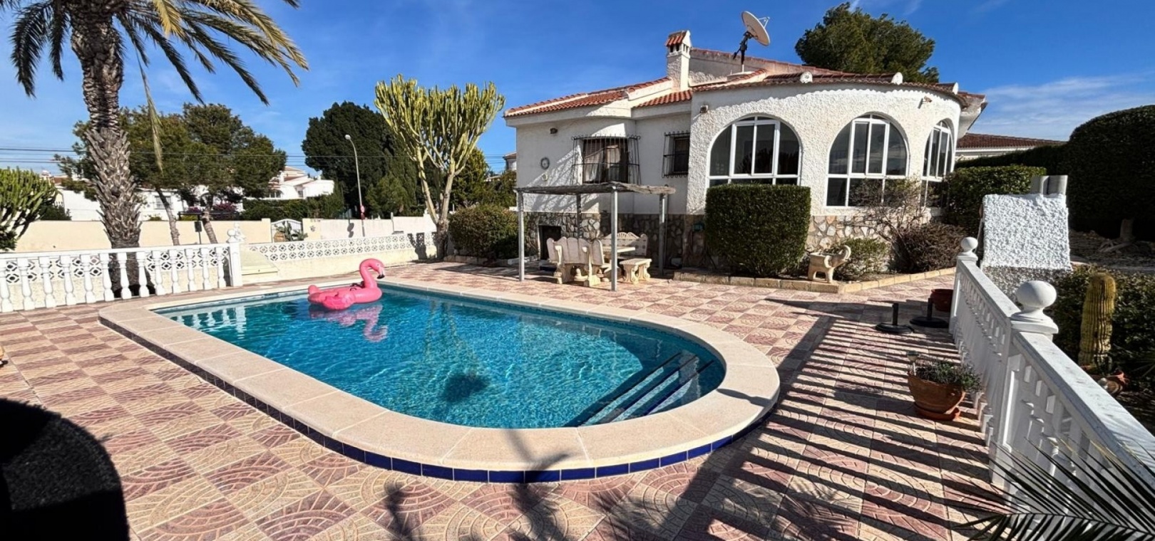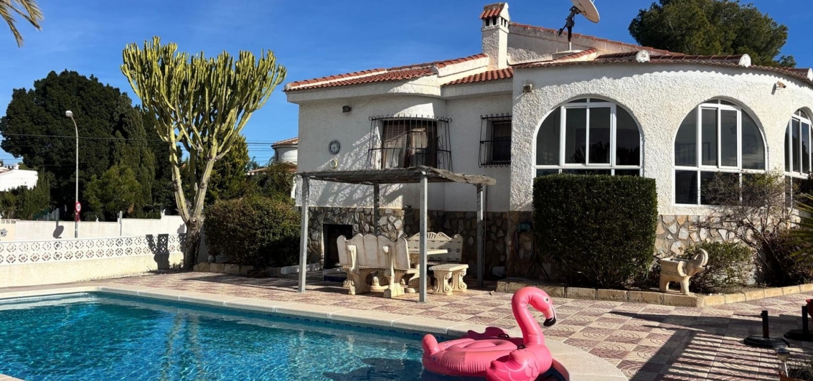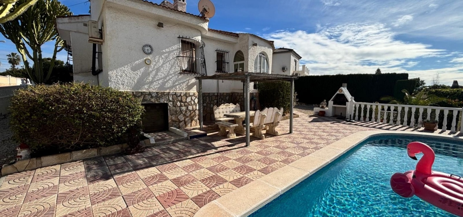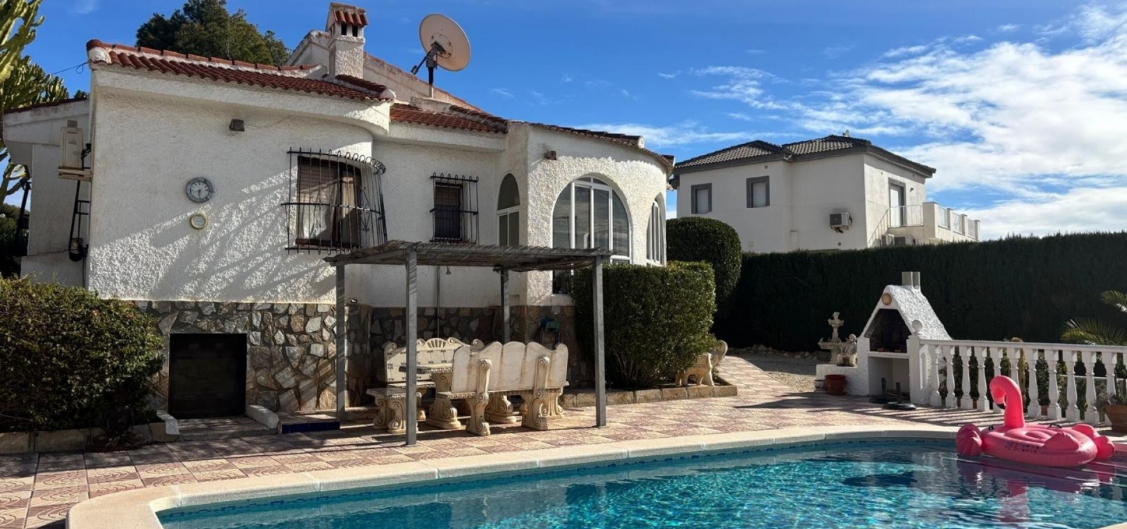 Das Anwesen ist auf komfortables Wohnen auf einer Ebene ausgelegt und bietet geräumige und gut geschnittene Innenräume sowie großzügige Außenbereiche. Die Villa verfügt über einen privaten Swimmingpool und bietet somit den perfekten Rahmen zum Entspannen, für gesellige Stunden und zum Genießen des mediterranen Klimas.