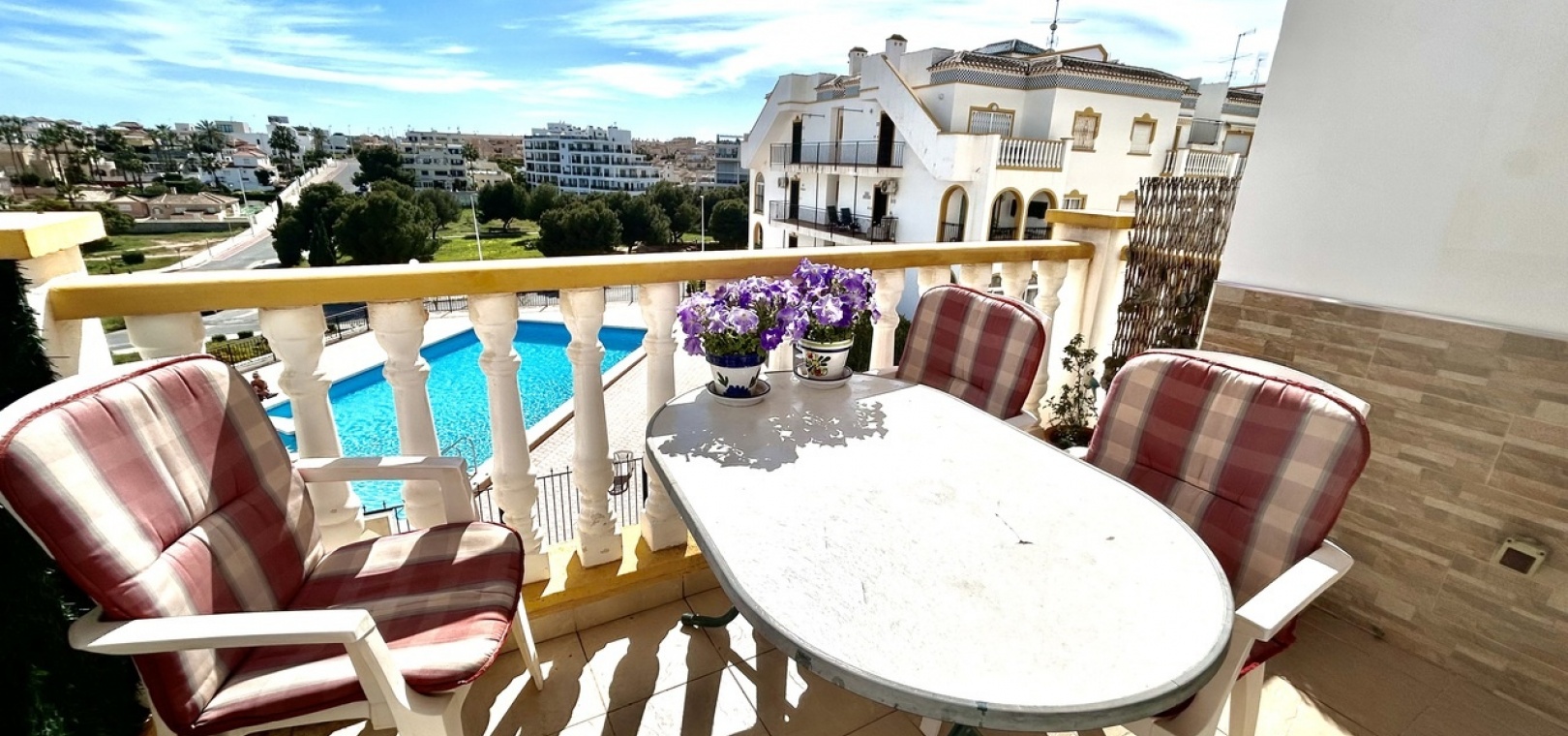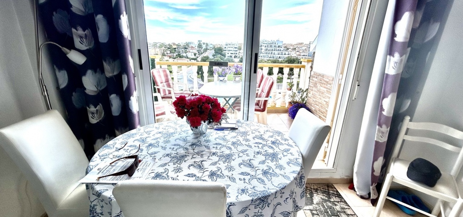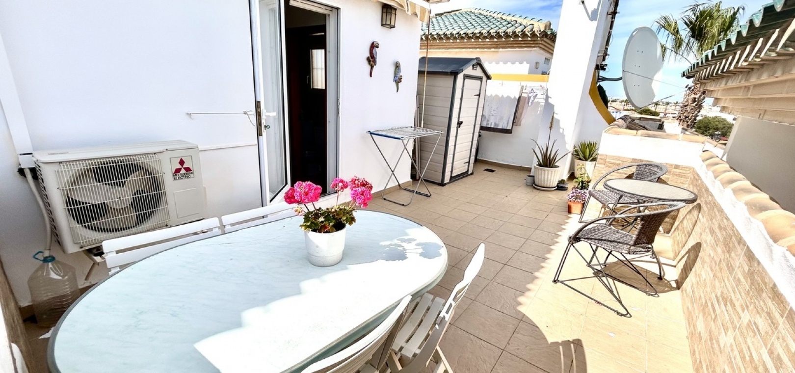 Dieses wunderschön präsentierte, nach Süden ausgerichtete Penthouse befindet sich in der begehrten Wohnanlage Molino Blanco, im Herzen von La Zenia. Es liegt oberhalb der Gemeinschaftsbereiche und bietet absolute Privatsphäre mit einem attraktiven, freien Blick über die gepflegten Gärten und den Pool.