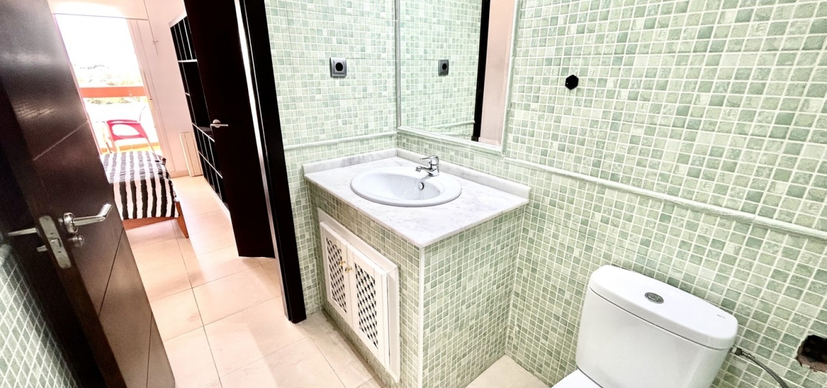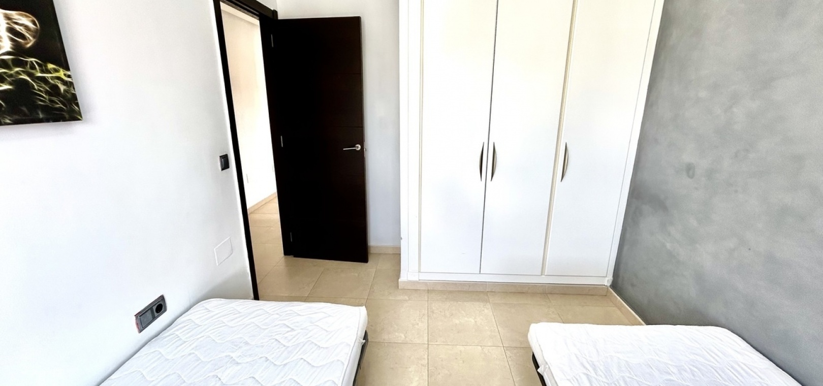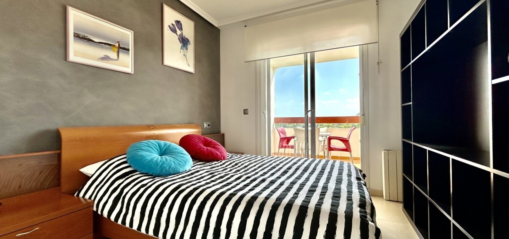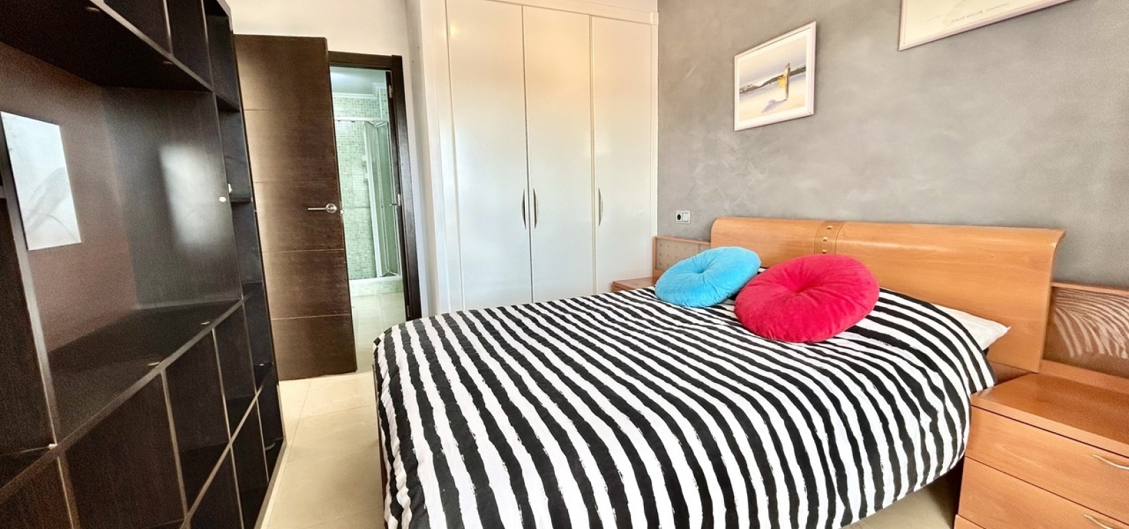 Das Hauptschlafzimmer bietet viel Platz und verfügt über ein eigenes Badezimmer sowie einen direkten Zugang zum Balkon. So entsteht ein privater Bereich zum Entspannen und um das mediterrane Klima in vollen Zügen zu genießen.