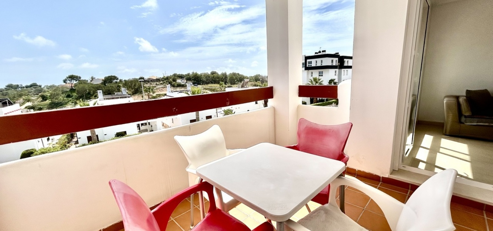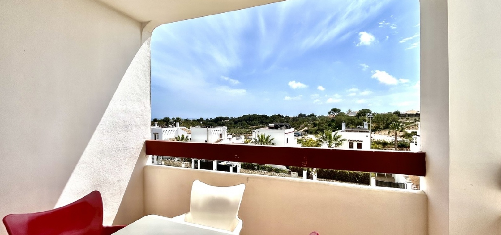 Im Inneren des Hauses öffnet sich ein heller Wohnbereich mit offener Küche, der sowohl für den Alltag als auch für gesellige Abende durchdacht gestaltet ist. Große Schiebetüren führen direkt auf einen sonnigen Balkon – der ideale Ort für den Morgenkaffee mit herrlichem Meerblick.