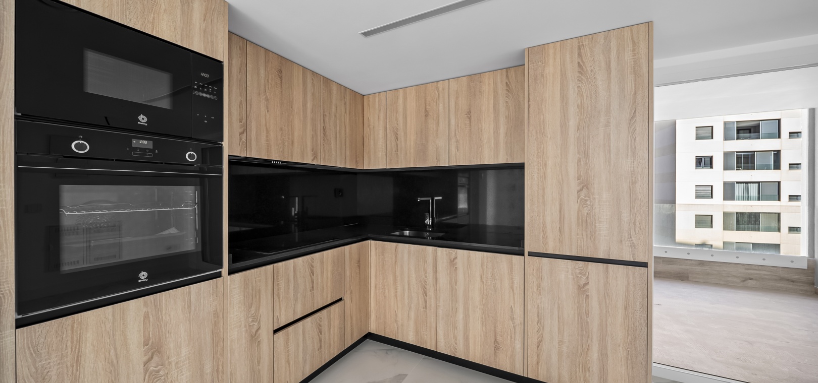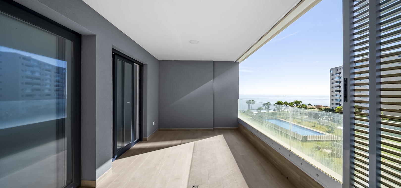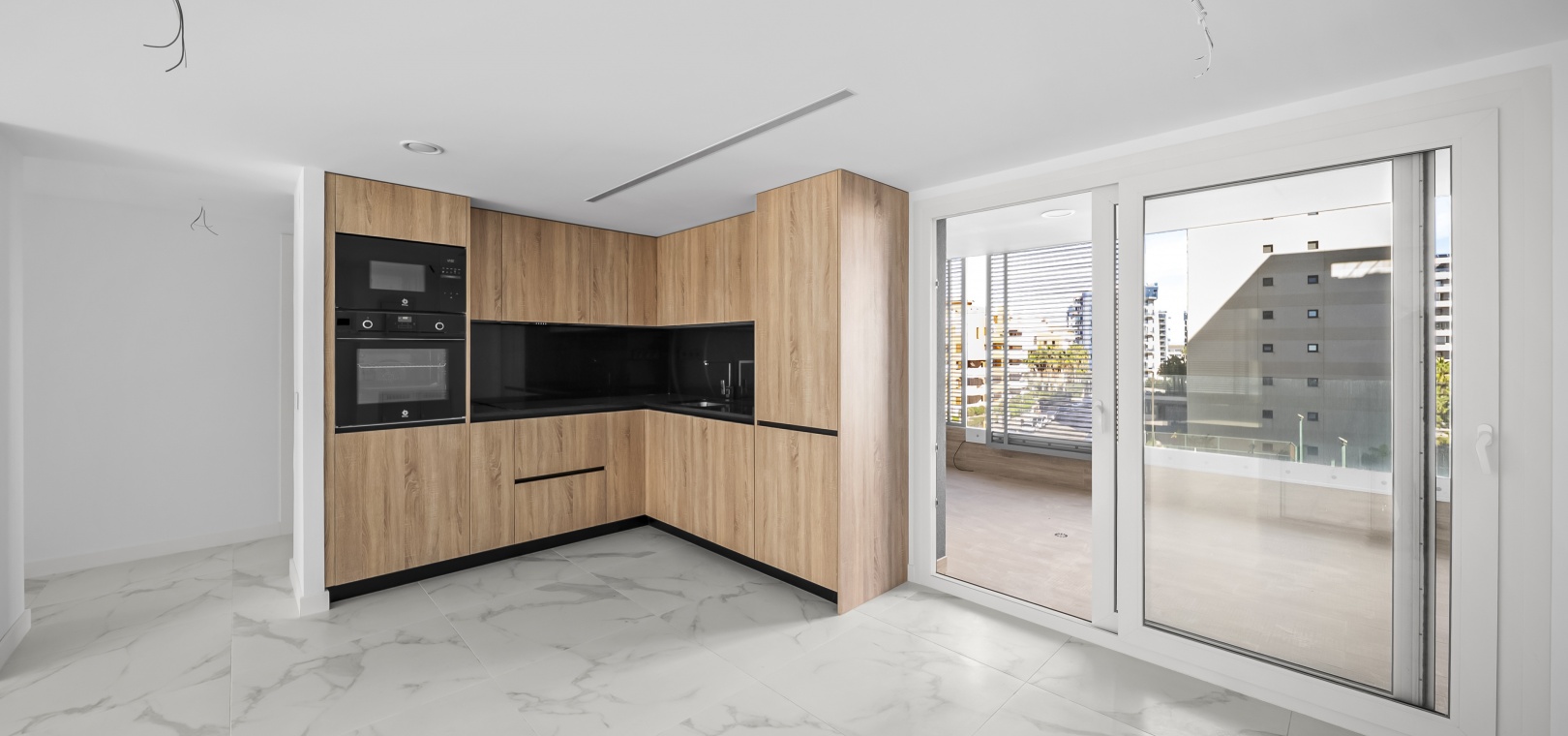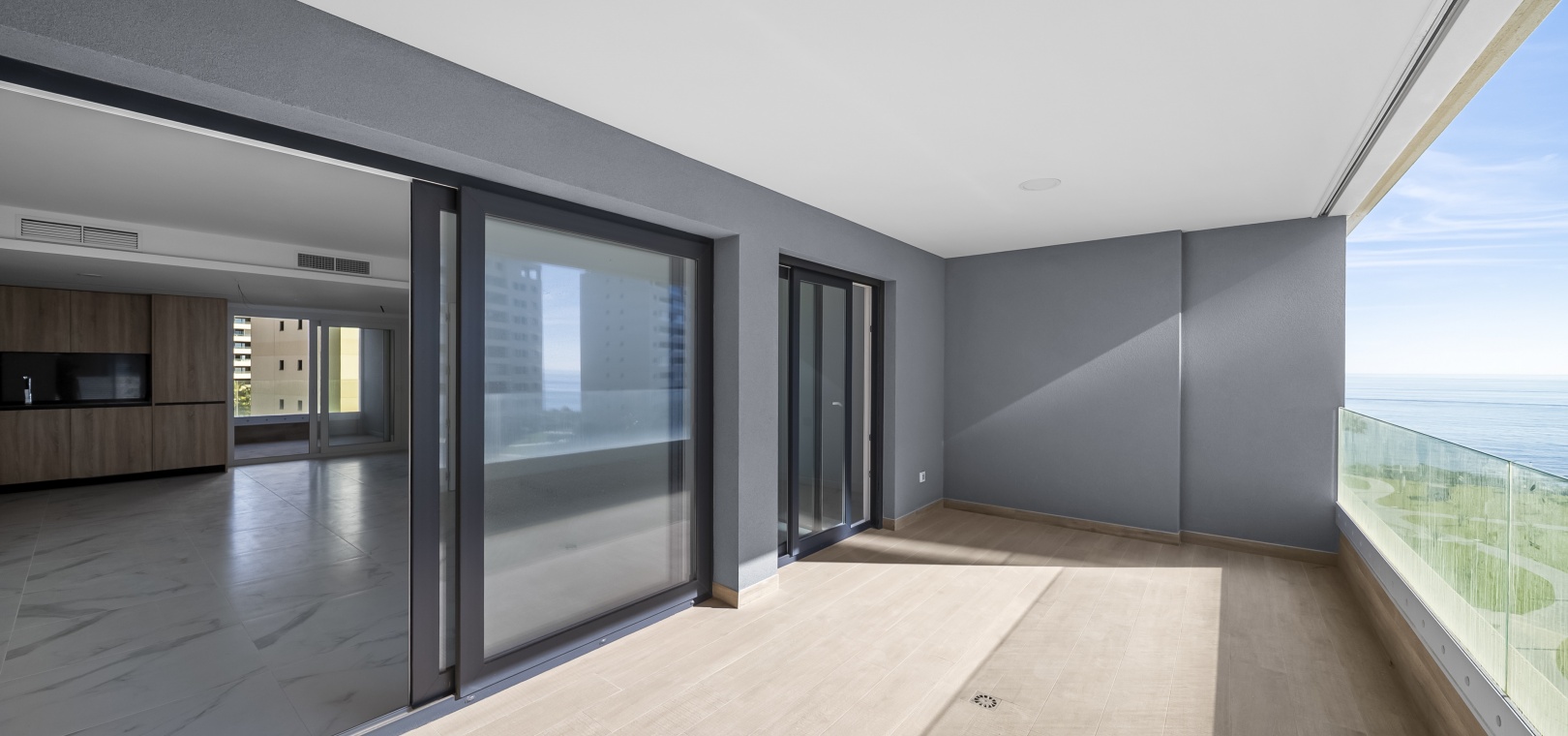 Ein besonderes Highlight ist die doppelte Terrassenaufteilung. Die 16,70 m² große, nach Süden ausgerichtete Hauptterrasse bietet einen wunderschönen Meerblick, während die zweite, 12 m² große Terrasse, die von der Küche aus zugänglich ist, einen zusätzlichen privaten Außenbereich bietet, der sich ideal zum Essen oder Entspannen eignet.