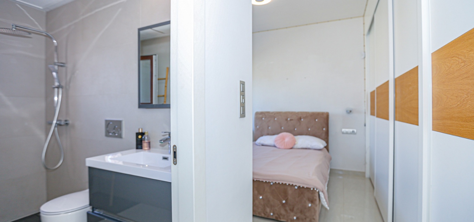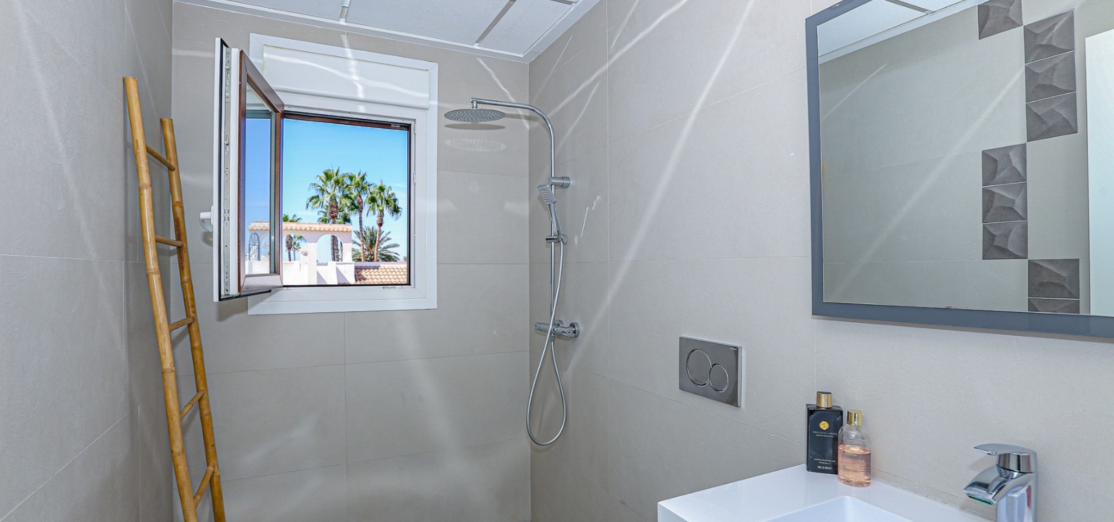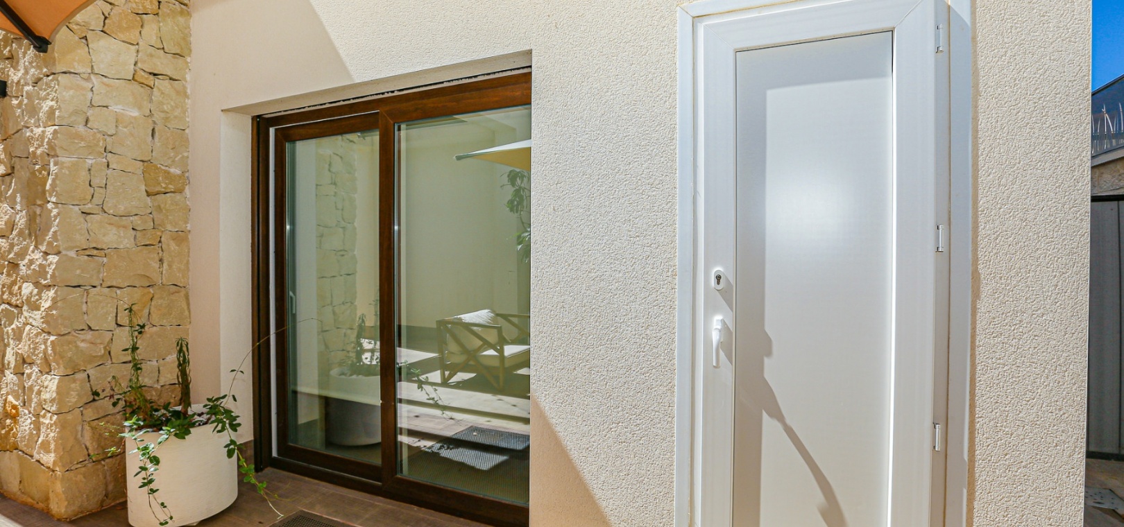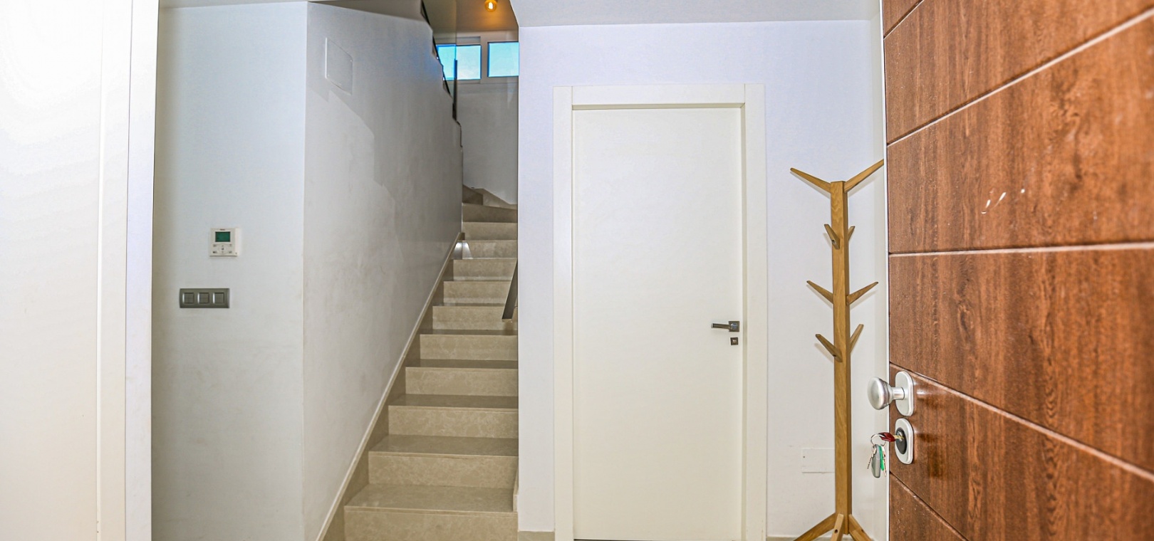 Das Erdgeschoss umfasst ein Schlafzimmer mit direktem Zugang nach draußen und ein Badezimmer mit Fußbodenheizung. Der großzügige Wohnbereich besteht aus einem geräumigen Wohn-Esszimmer und einer voll ausgestatteten offenen Küche. Elektrische Rollläden sind in allen Räumen außer den Wohnzimmerfenstern installiert.
