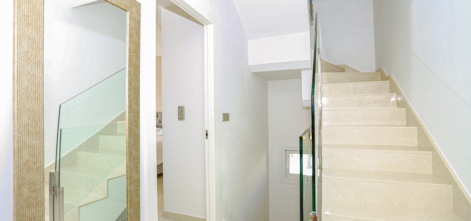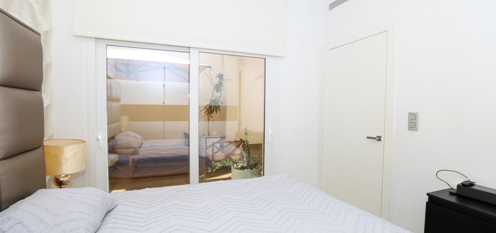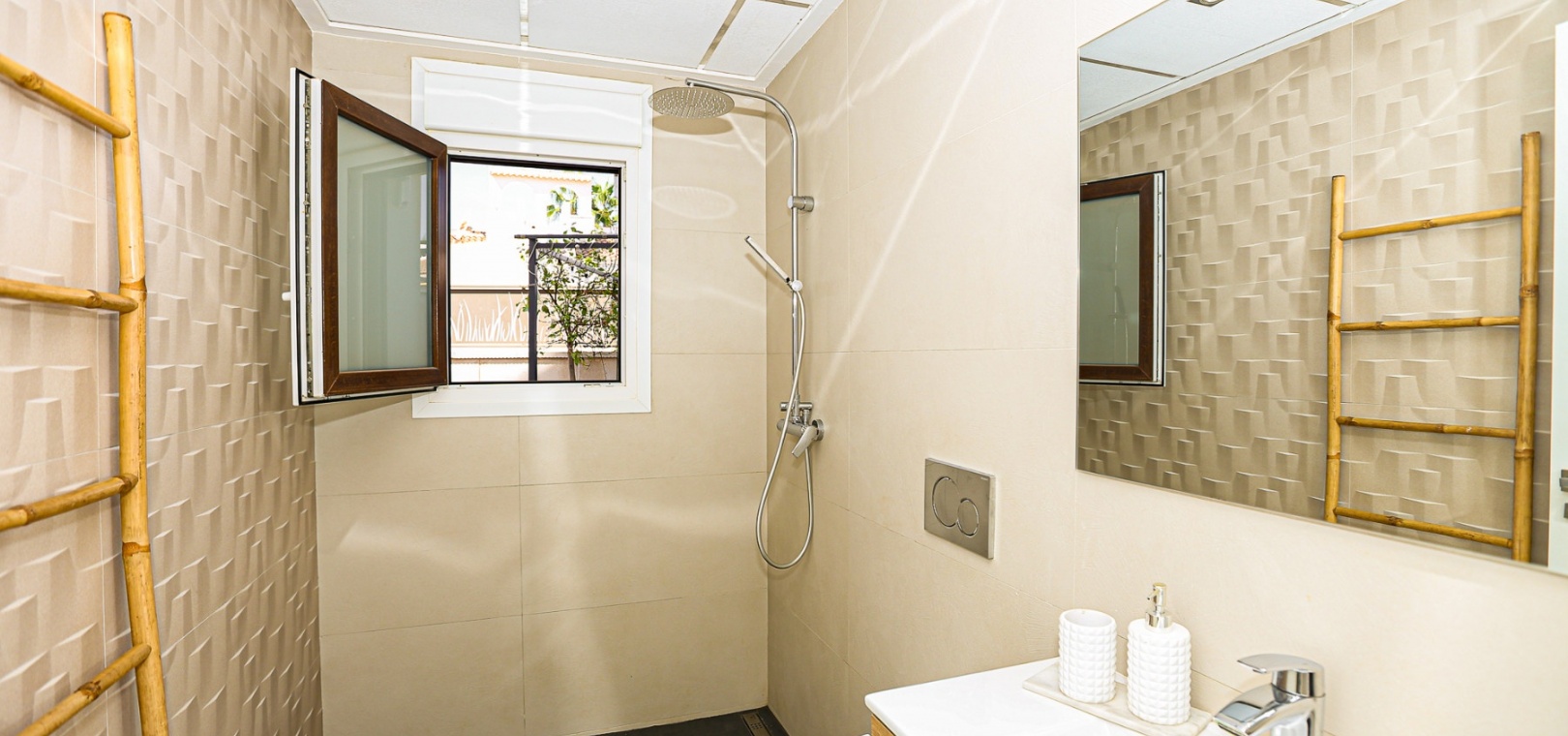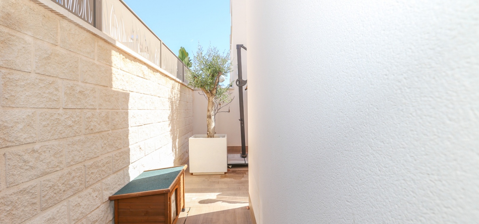 Das Erdgeschoss umfasst ein Schlafzimmer mit direktem Zugang nach draußen und ein Badezimmer mit Fußbodenheizung. Der großzügige Wohnbereich besteht aus einem geräumigen Wohn-Esszimmer und einer voll ausgestatteten offenen Küche. Elektrische Rollläden sind in allen Räumen außer den Wohnzimmerfenstern installiert.