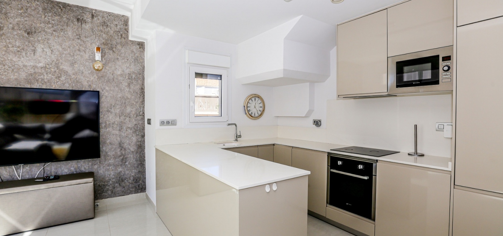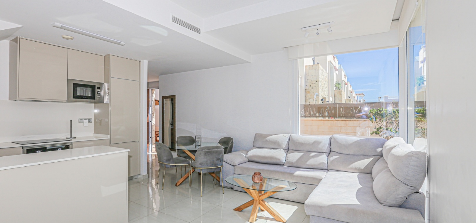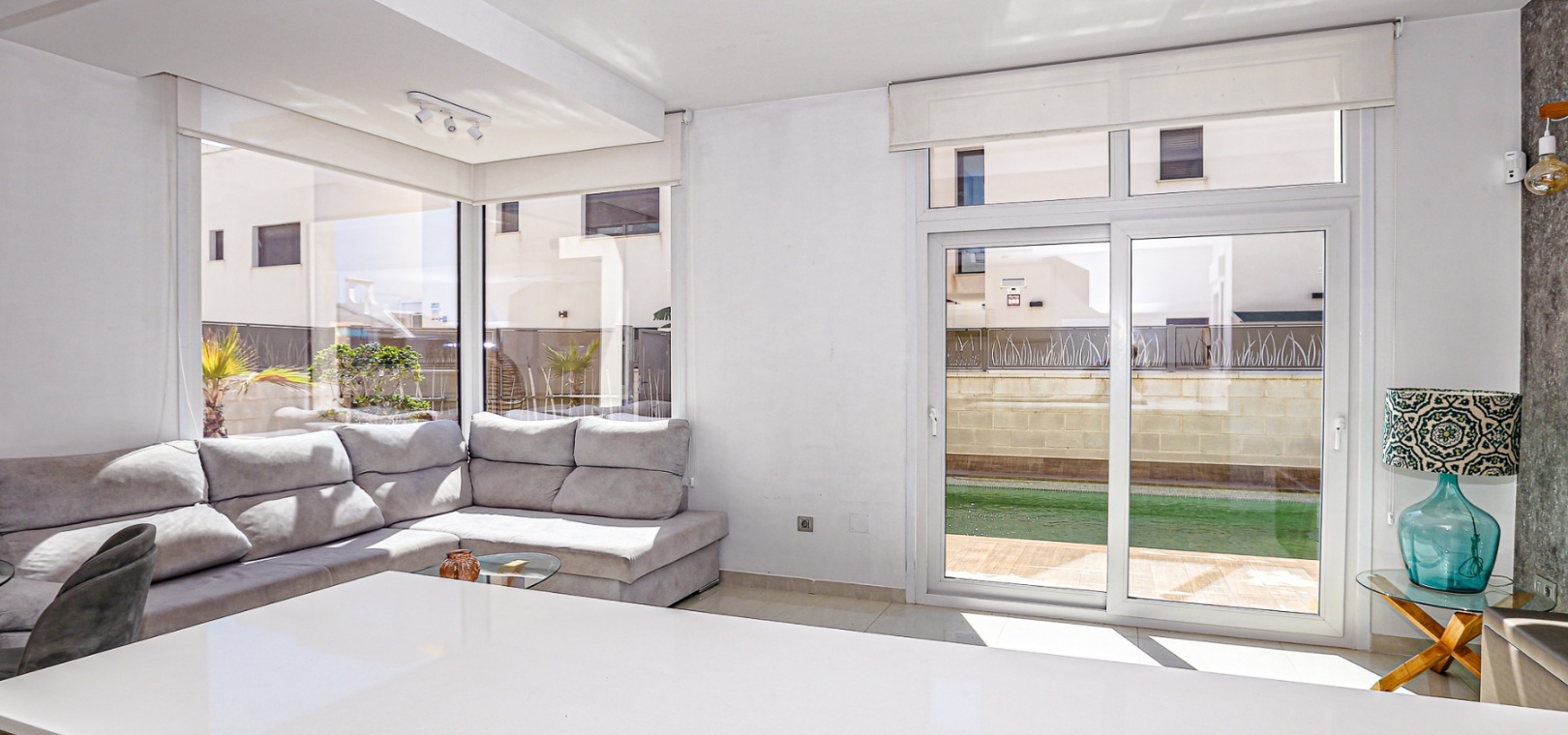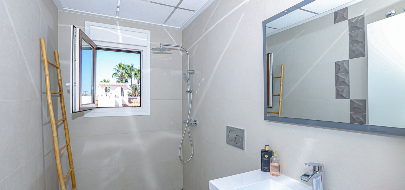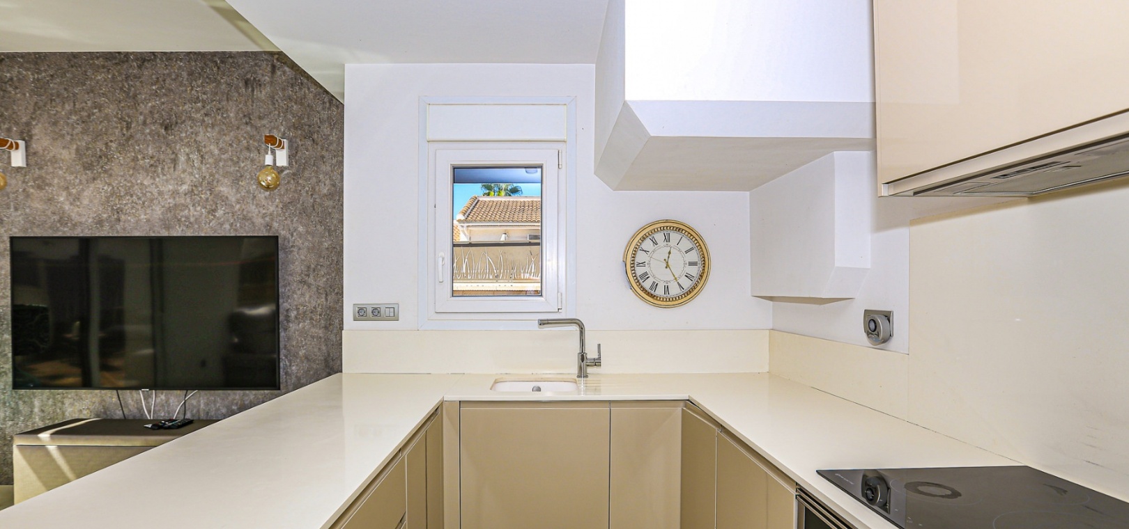 Das Erdgeschoss umfasst ein Schlafzimmer mit direktem Zugang nach draußen und ein Badezimmer mit Fußbodenheizung. Der großzügige Wohnbereich besteht aus einem geräumigen Wohn-Esszimmer und einer voll ausgestatteten offenen Küche. Elektrische Rollläden sind in allen Räumen außer den Wohnzimmerfenstern installiert.