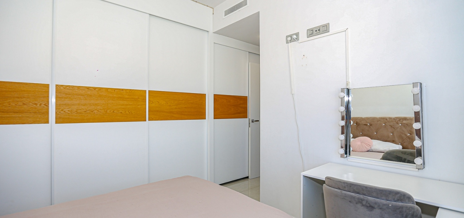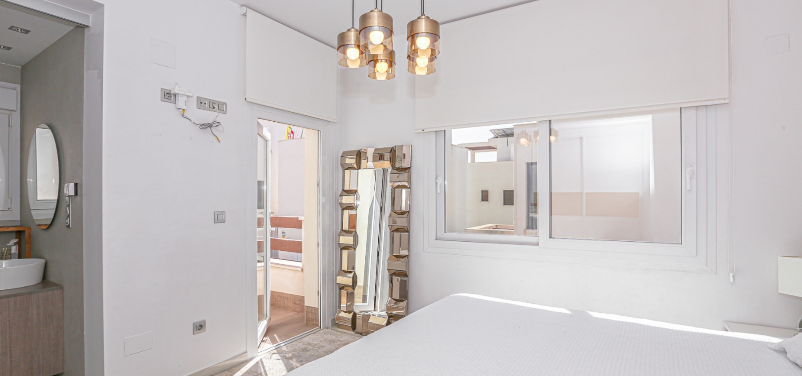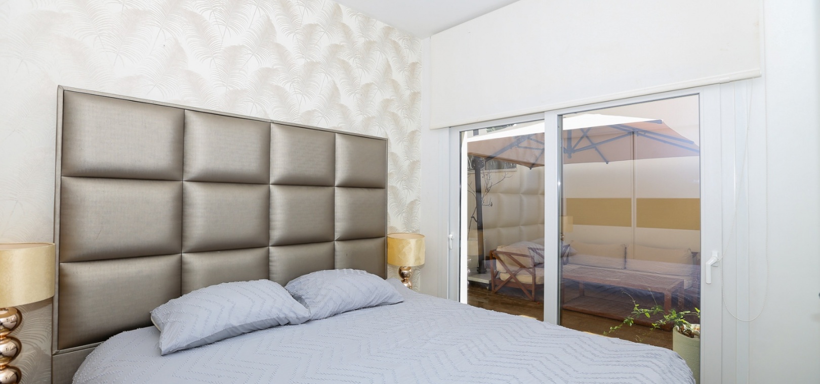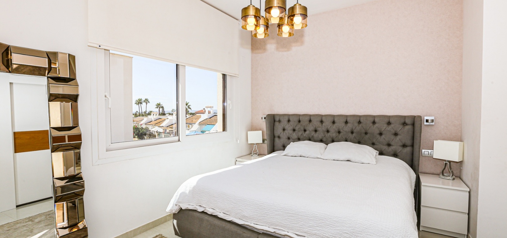 Das Erdgeschoss umfasst ein Schlafzimmer mit direktem Zugang nach draußen und ein Badezimmer mit Fußbodenheizung. Der großzügige Wohnbereich besteht aus einem geräumigen Wohn-Esszimmer und einer voll ausgestatteten offenen Küche. Elektrische Rollläden sind in allen Räumen außer den Wohnzimmerfenstern installiert.