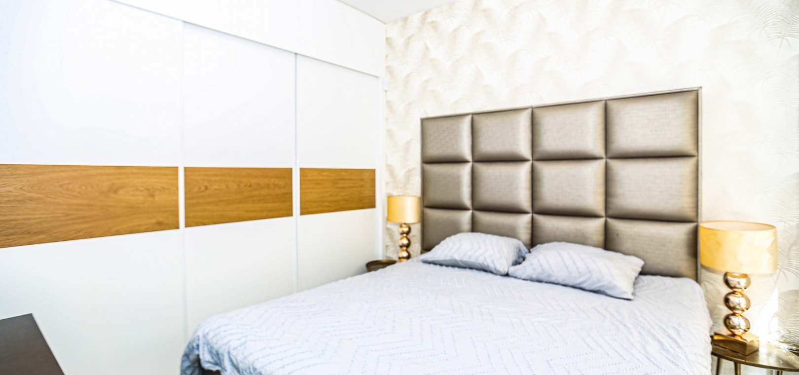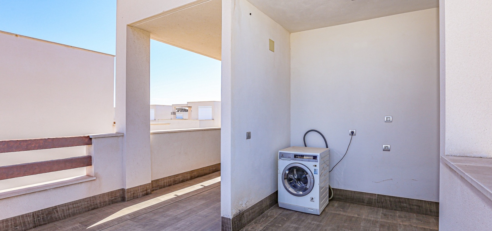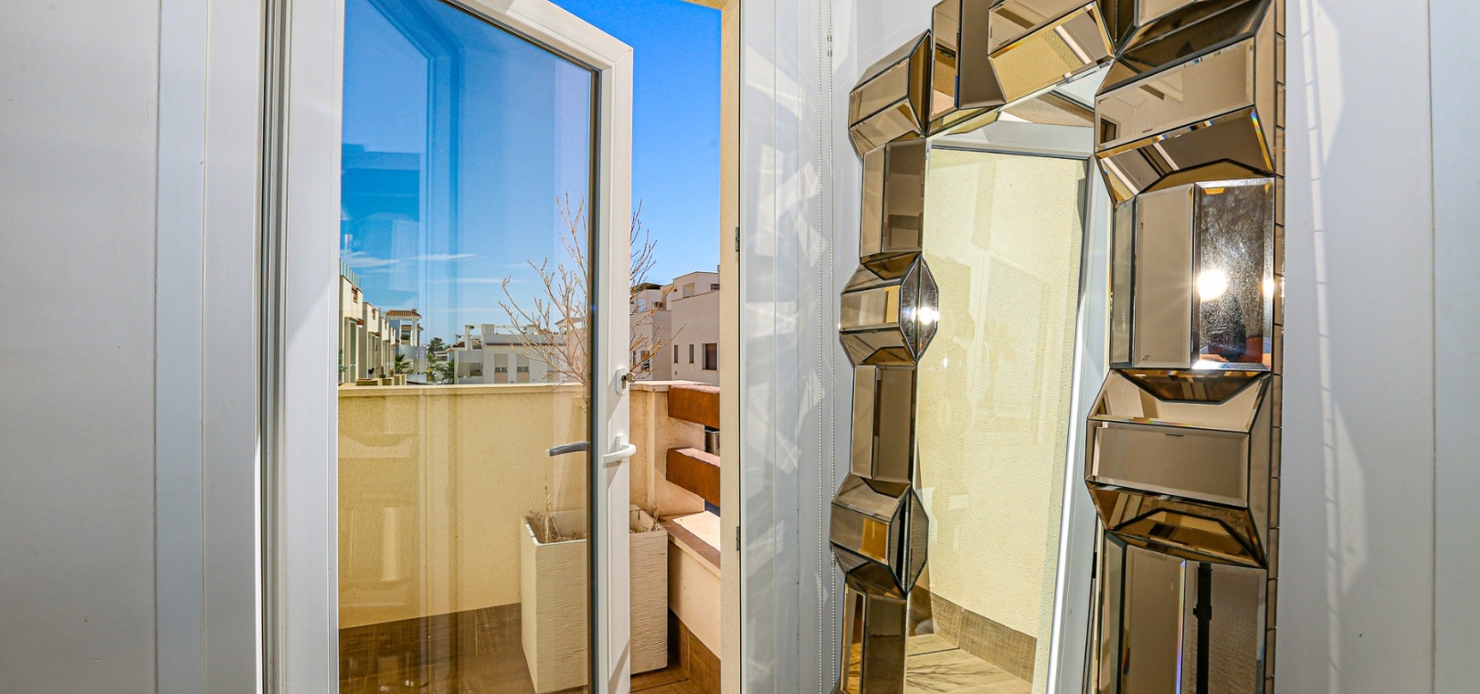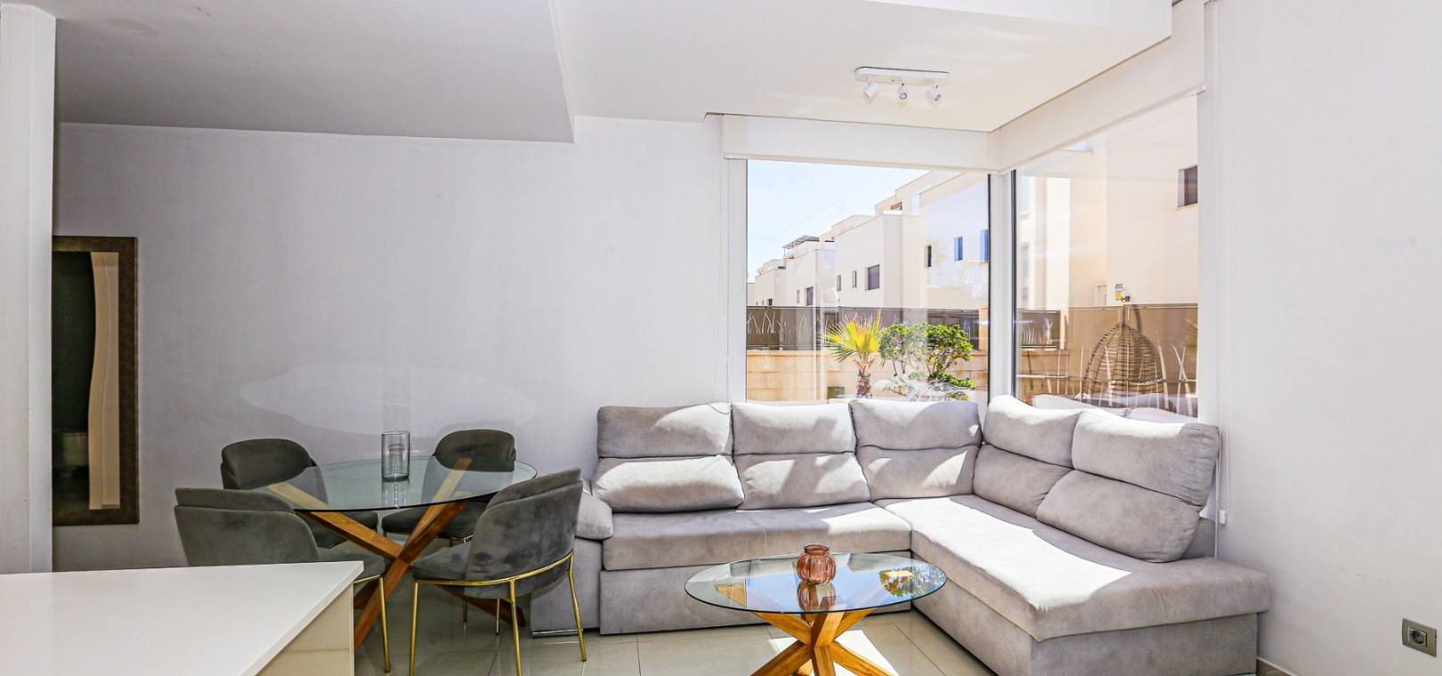 Das Erdgeschoss umfasst ein Schlafzimmer mit direktem Zugang nach draußen und ein Badezimmer mit Fußbodenheizung. Der großzügige Wohnbereich besteht aus einem geräumigen Wohn-Esszimmer und einer voll ausgestatteten offenen Küche. Elektrische Rollläden sind in allen Räumen außer den Wohnzimmerfenstern installiert.