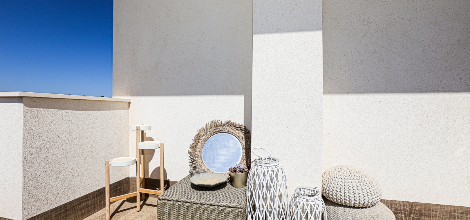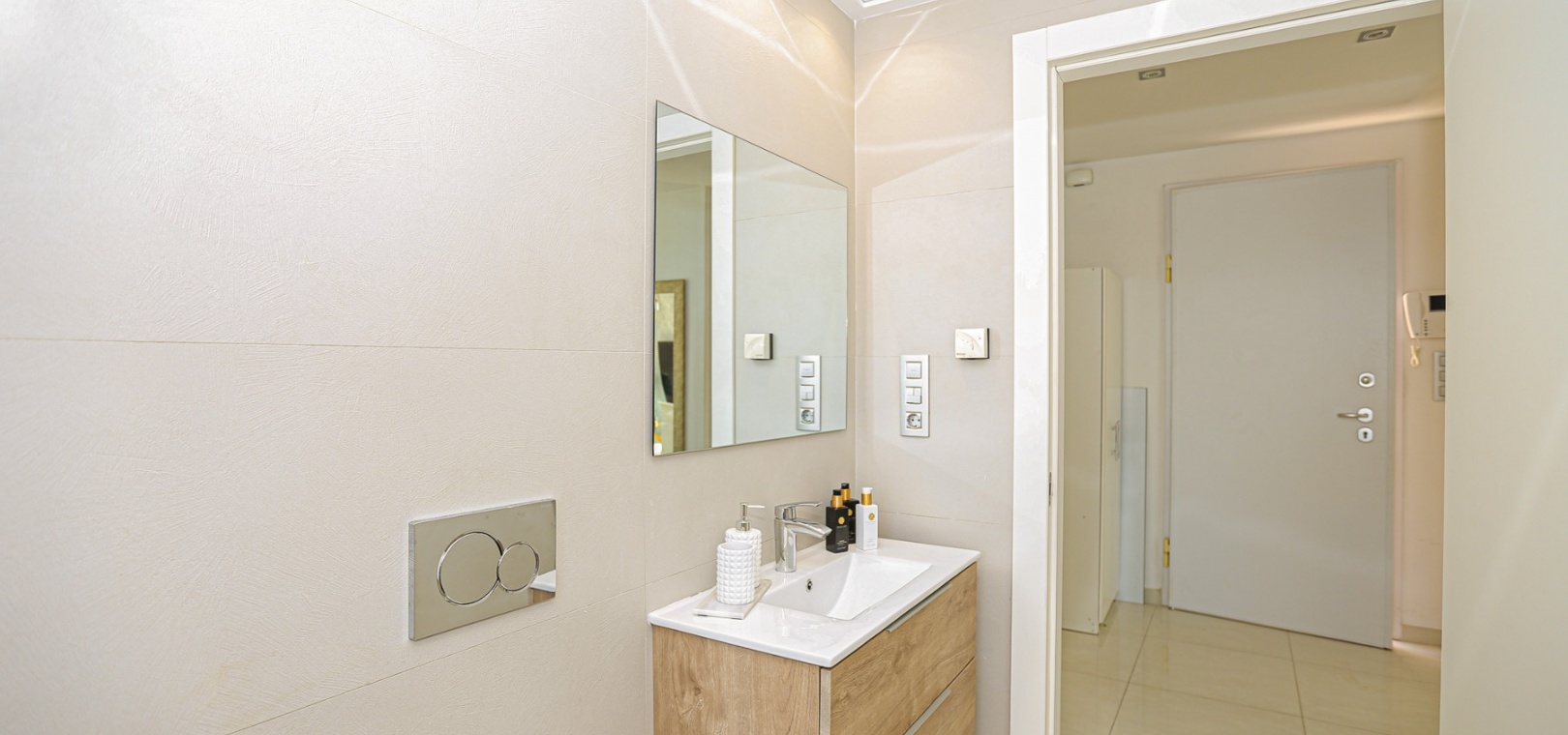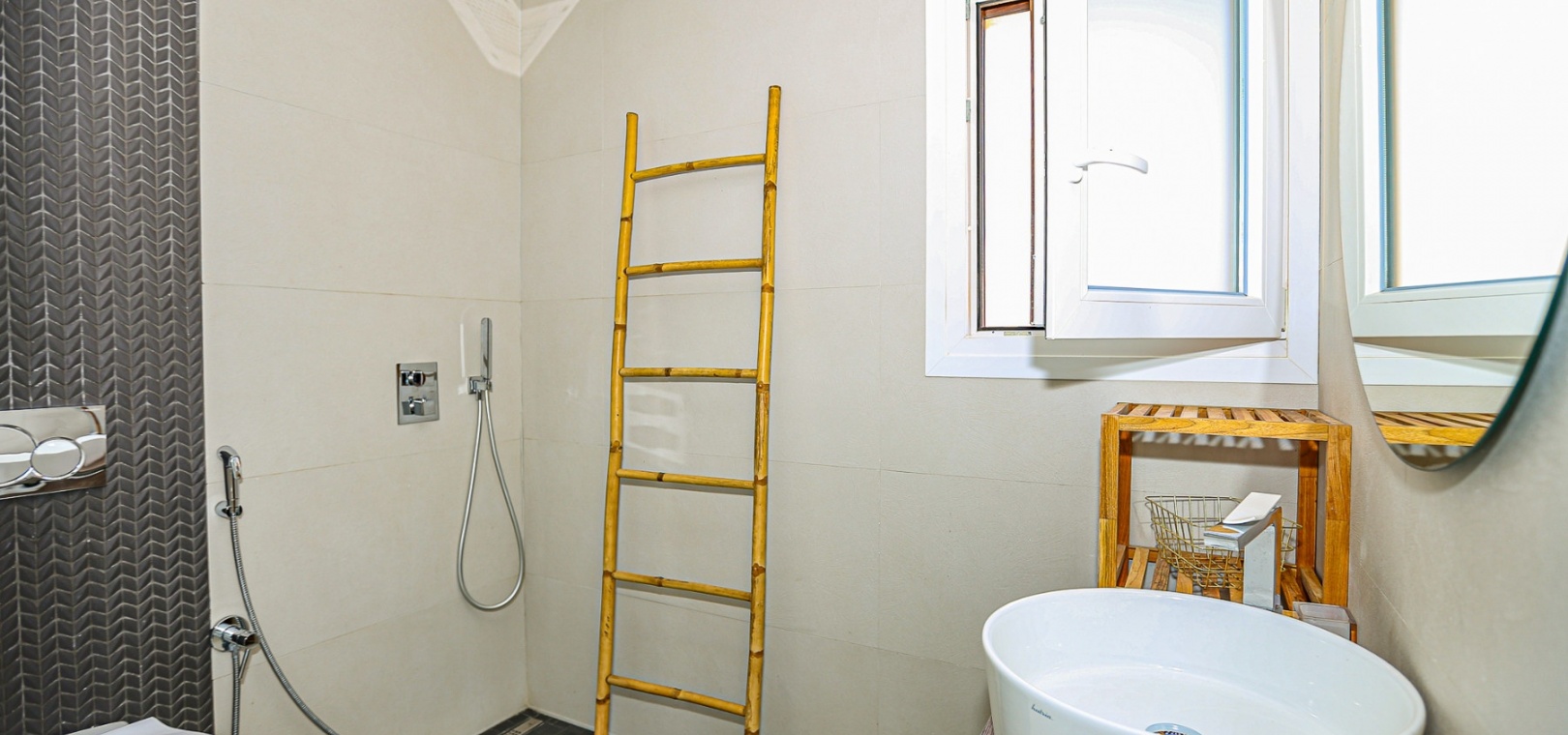Im ersten Stock befinden sich zwei weitere Schlafzimmer, jeweils mit eigenem Badezimmer, das über viel Tageslicht und gute Belüftung verfügt. Das Hauptschlafzimmer bietet zudem eine private Terrasse mit freiem Ausblick.