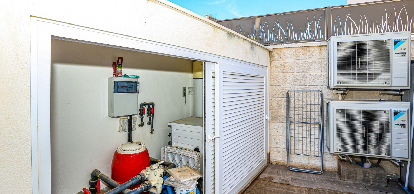 Das Anwesen befindet sich auf einem pflegeleichten Grundstück mit Holzpflasterung, angelegten Pflanzbeeten, einem privaten Swimmingpool und einem Abstellraum im Freien.