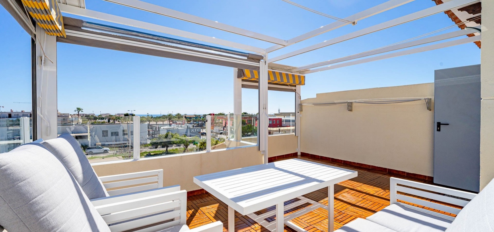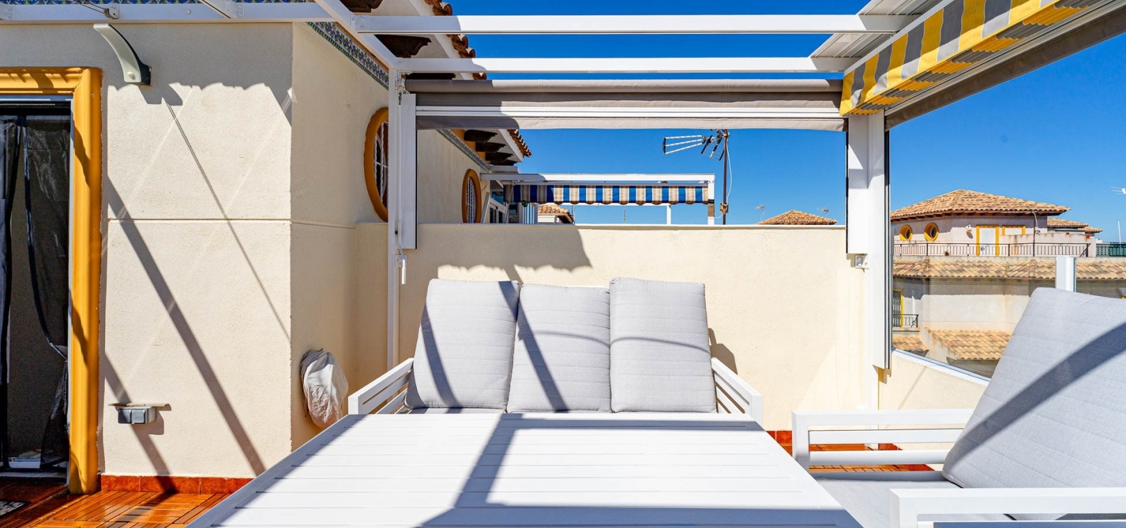 Ein privates Solarium auf dem Dach bietet Meerblick und viel Freiraum für das Leben im Freien das ganze Jahr über.