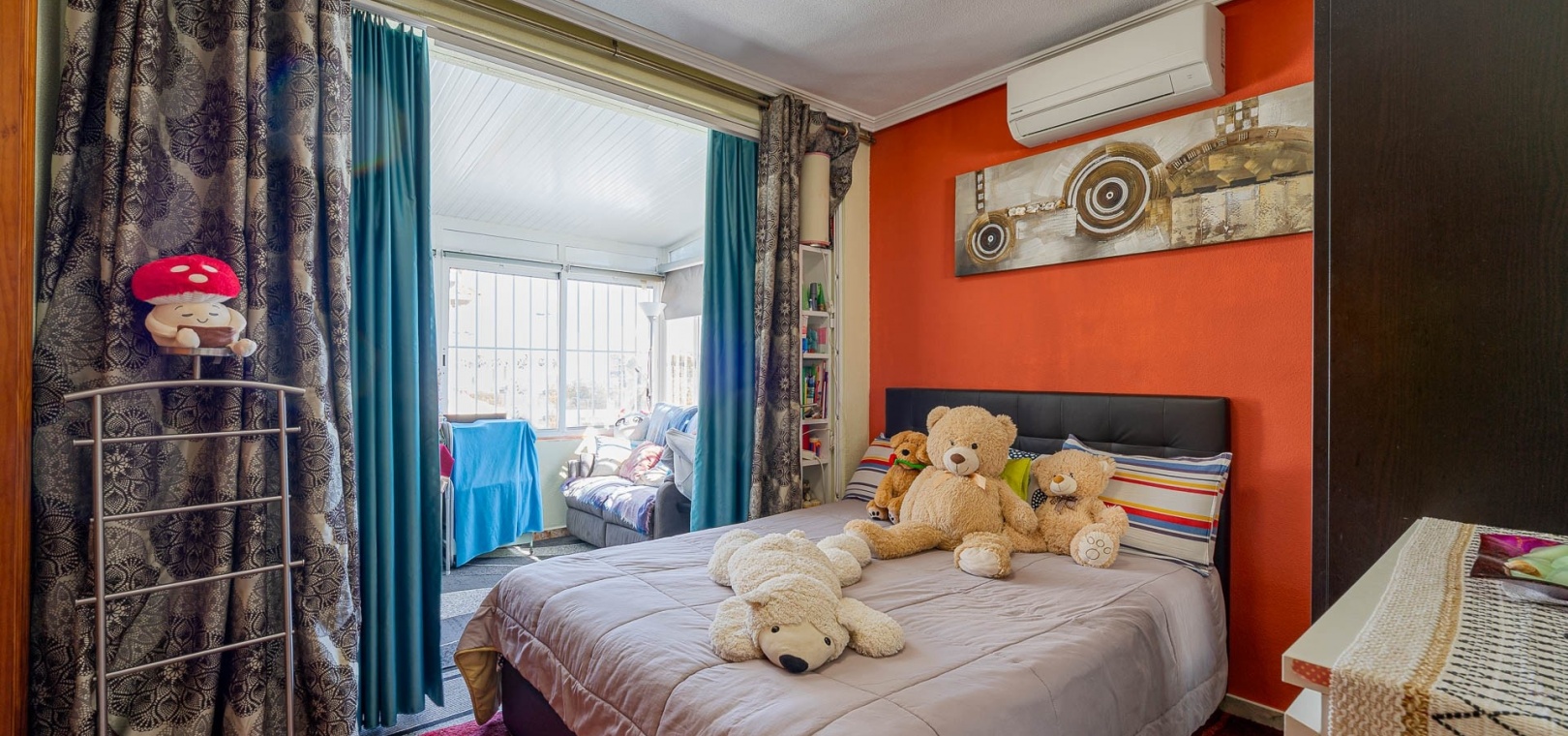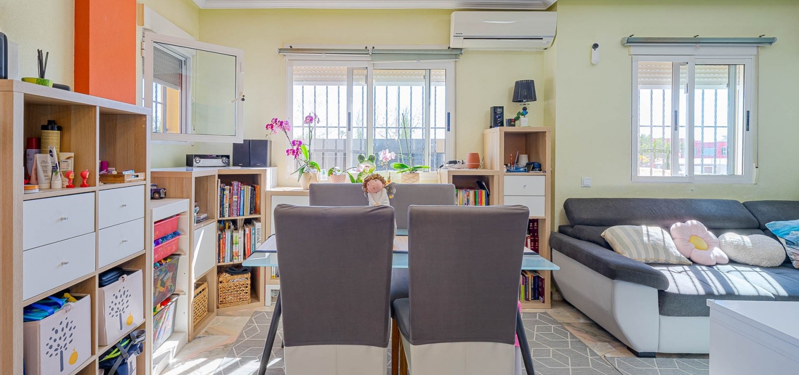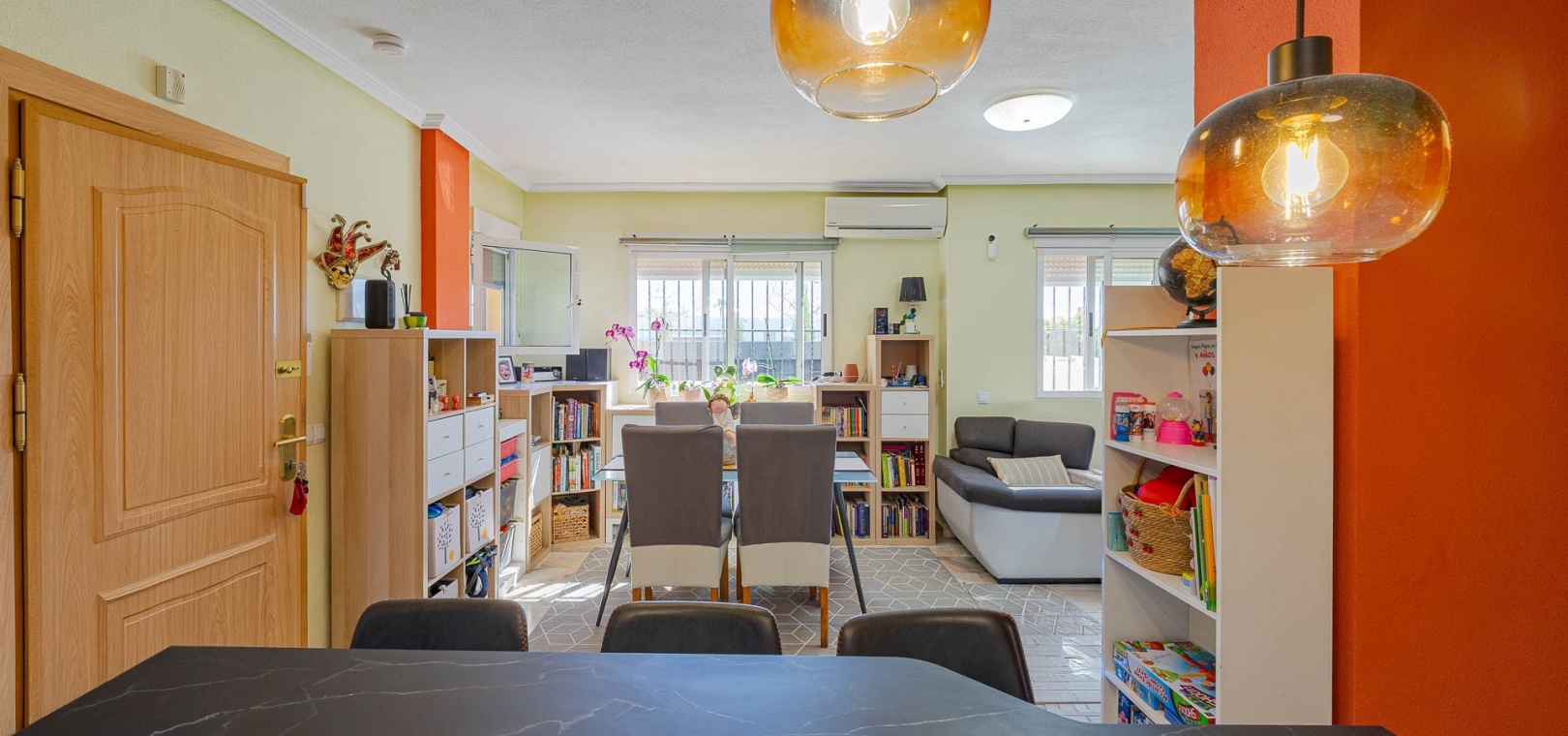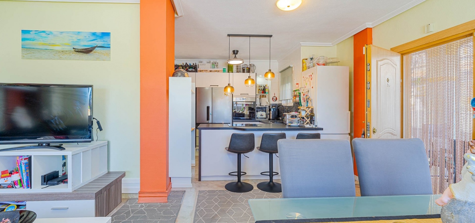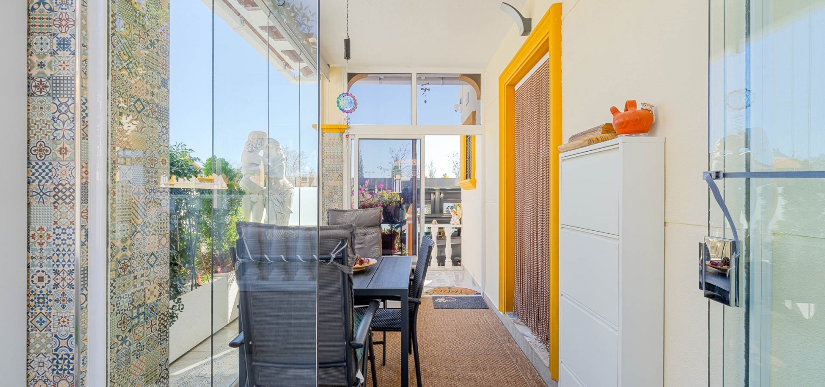 Am Eingang befindet sich eine verglaste Terrasse, die in einen hellen Wohn- und Essbereich führt, der mit einer voll ausgestatteten Küche verbunden ist.