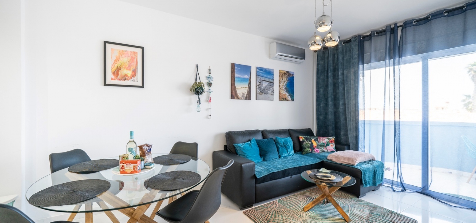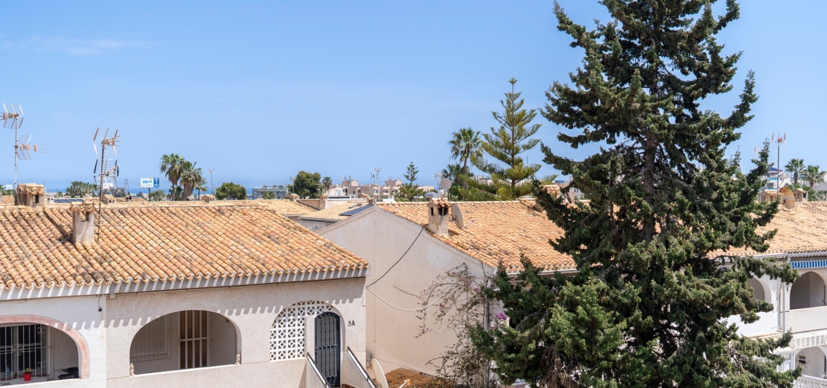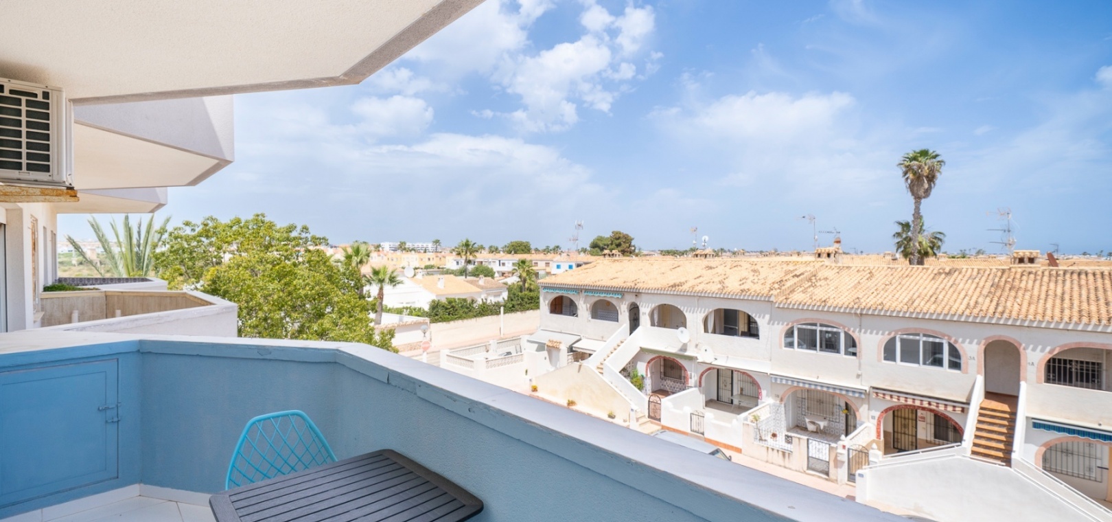Vom Wohnzimmer aus gelangt man direkt auf eine private Terrasse mit freiem Blick über die Siedlung, die von altem Grün und Palmen umgeben ist und so einen angenehmen Außenbereich für den täglichen Gebrauch schafft.