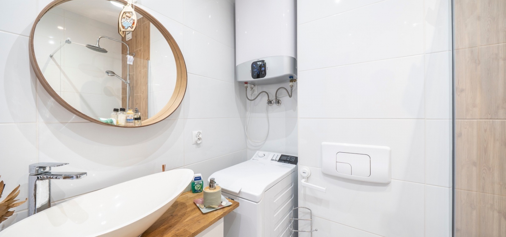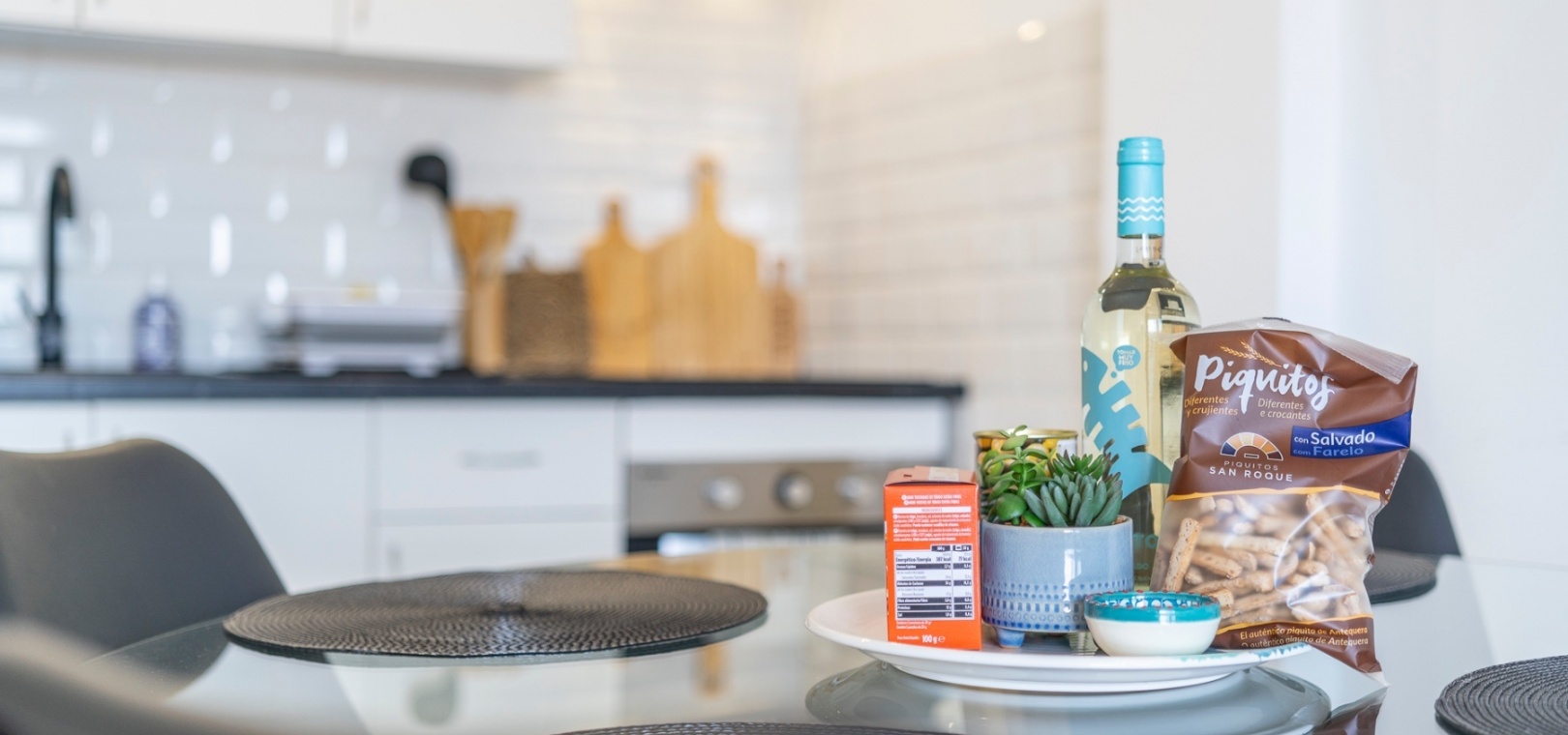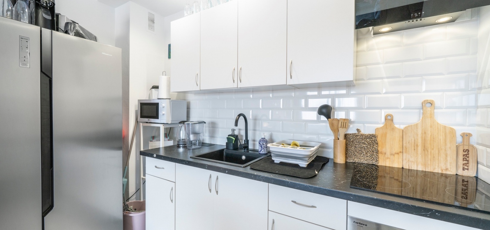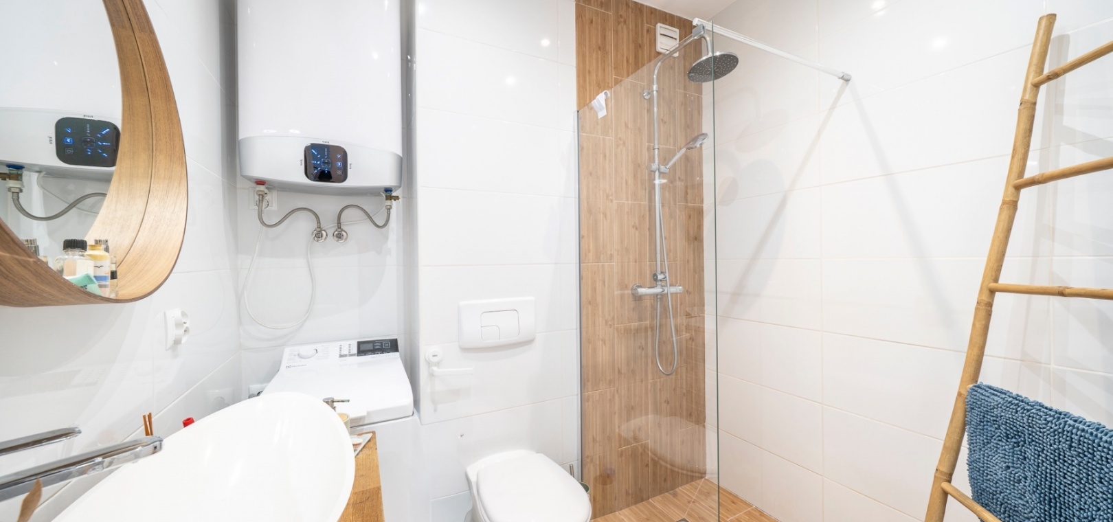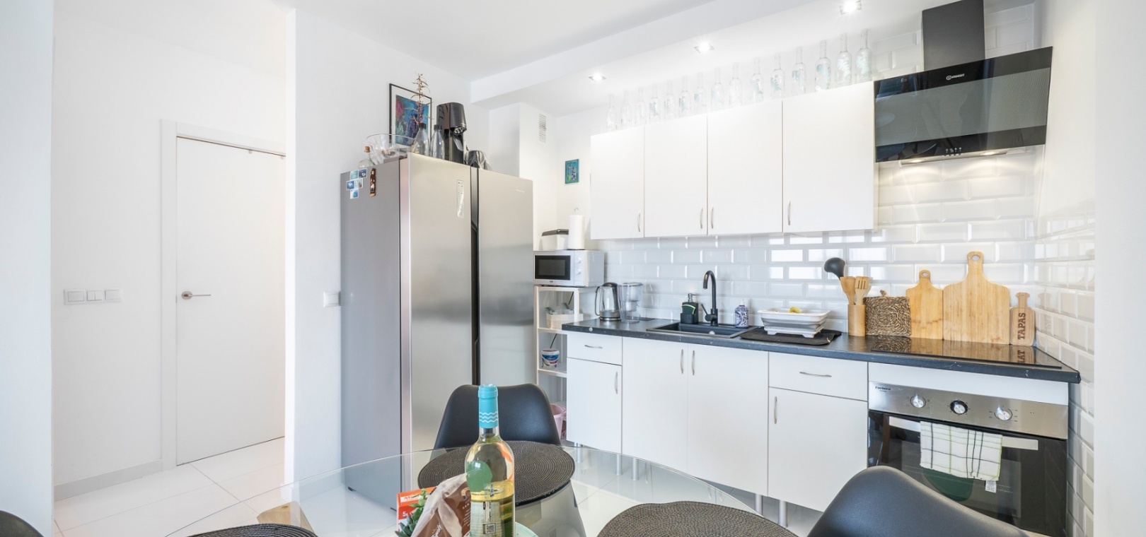 Die Immobilie umfasst einen hellen Wohn- und Essbereich mit offener, voll ausgestatteter Küche, ein Schlafzimmer mit Einbauschrank und ein komplettes Badezimmer mit Dusche und Platz für eine Waschmaschine.