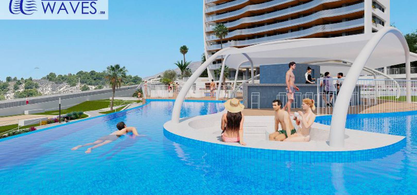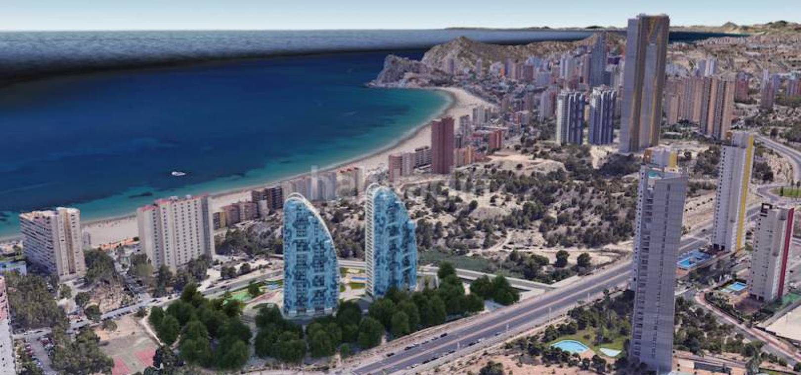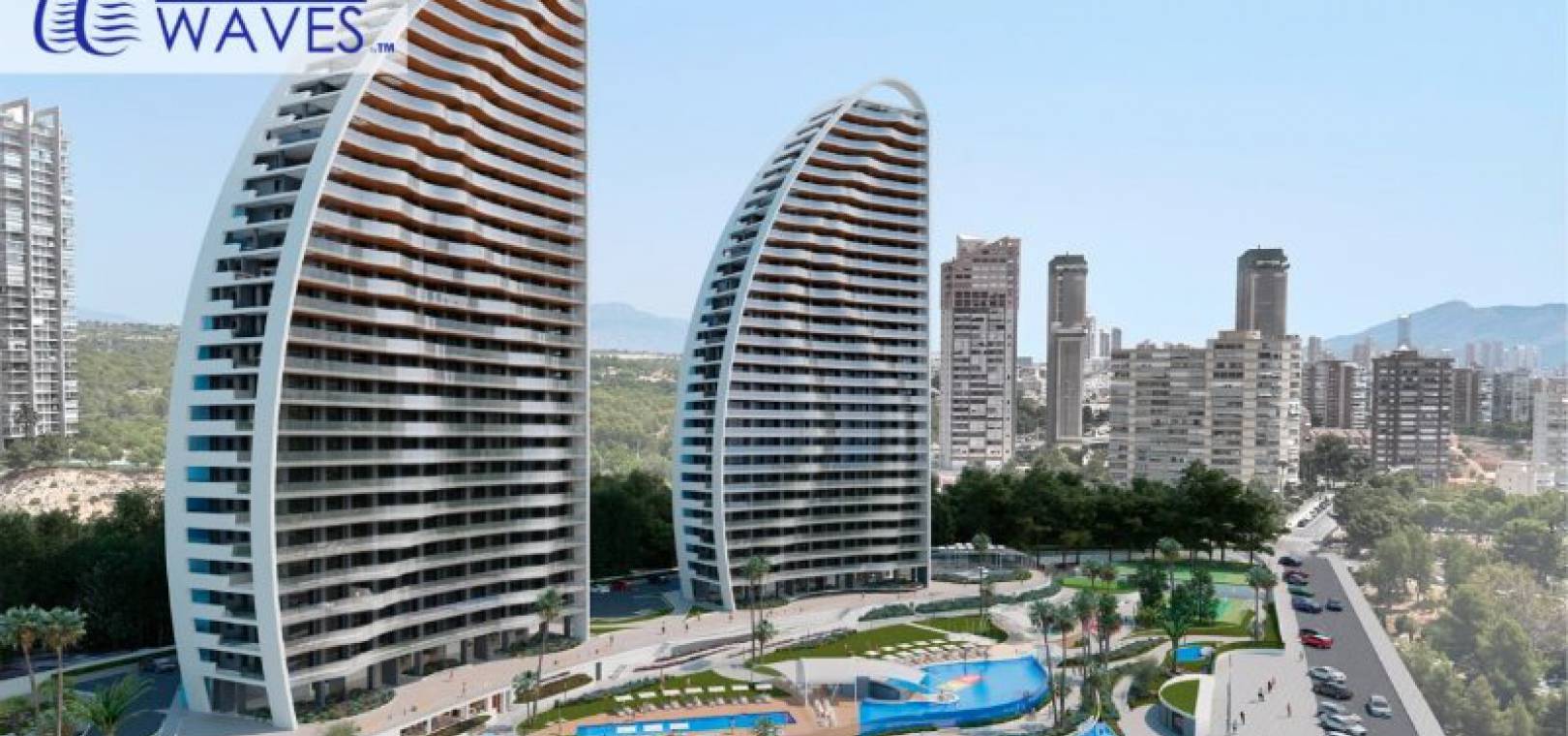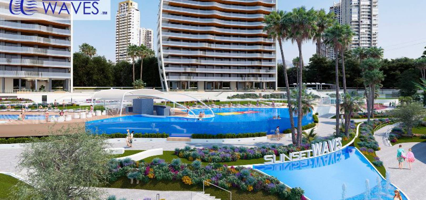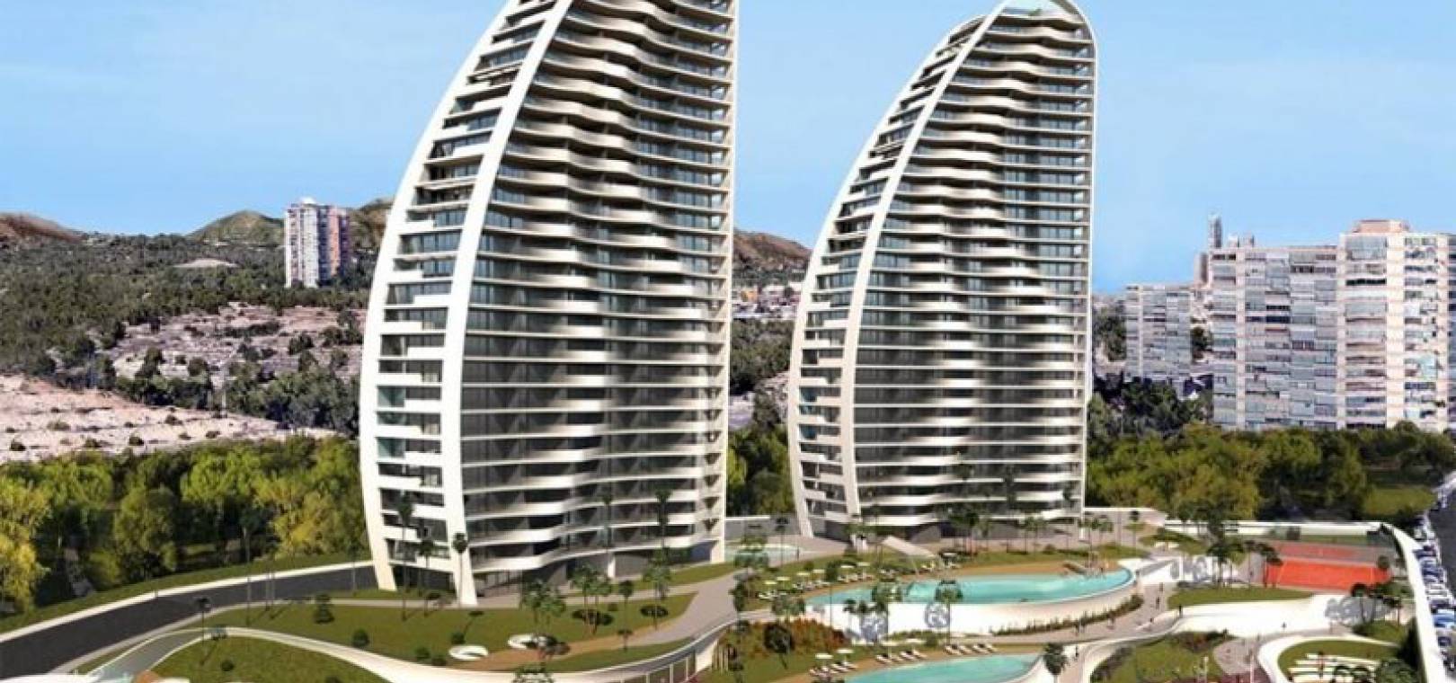 Luxus-Neubauwohnungen mit 3 Schlafzimmern und 2 Bädern und herrlichem Meerblick in Res. Sonnenuntergang Wellen, Benidorm, Costa Blanca.