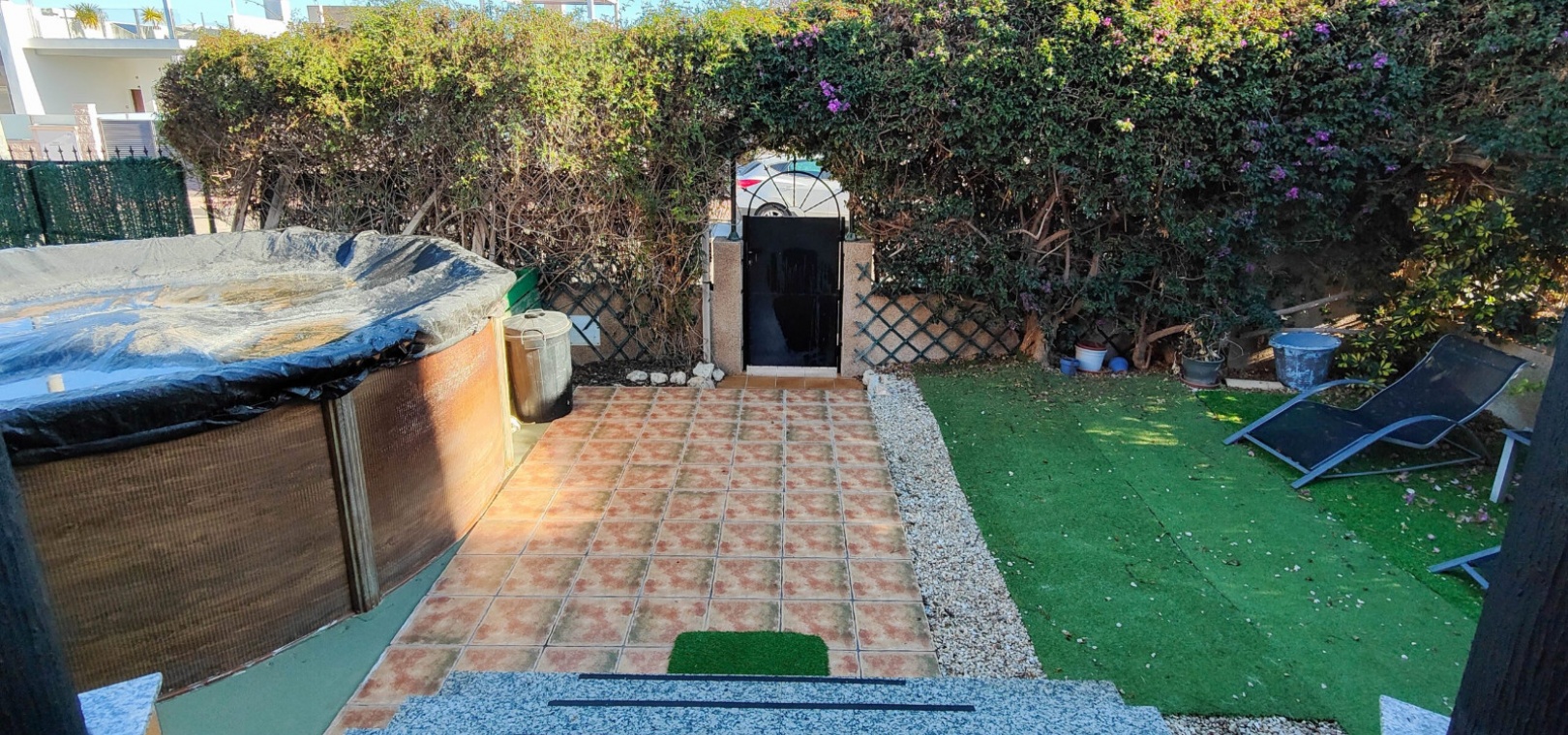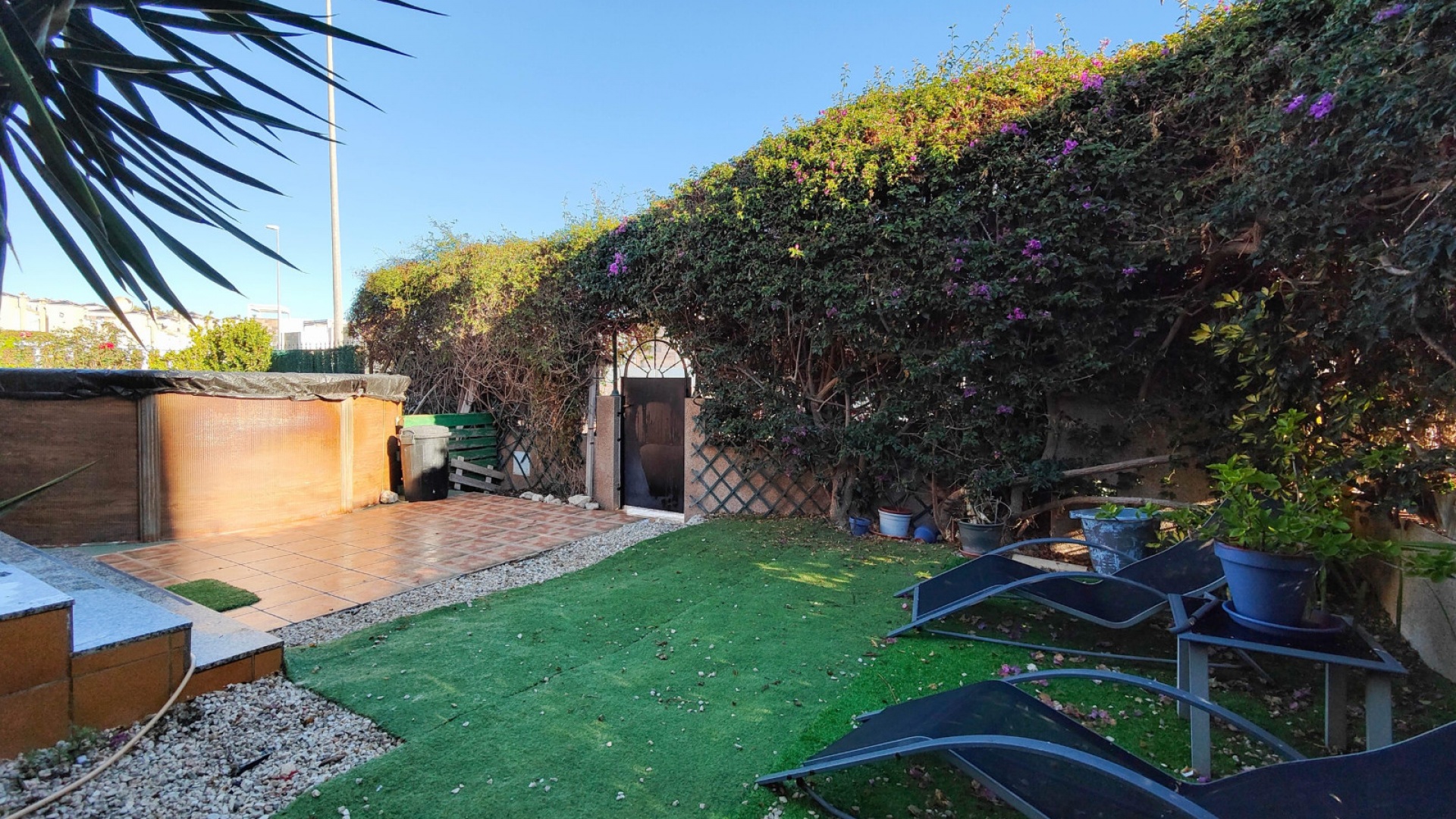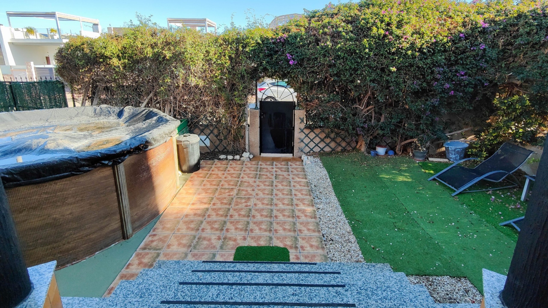 Dehors, il y a un jardin entièrement carrelé à faible entretien avec une terrasse avant, une piscine privée, une allée et bien plus encore.