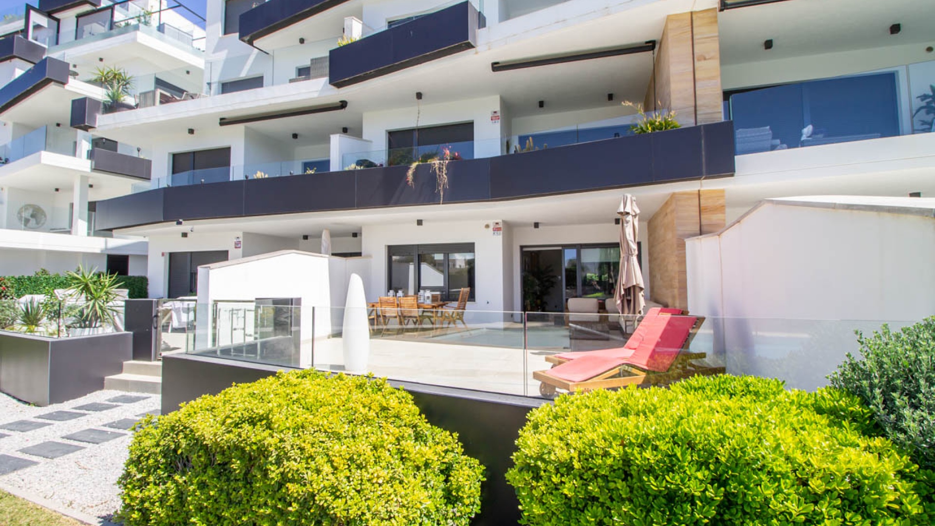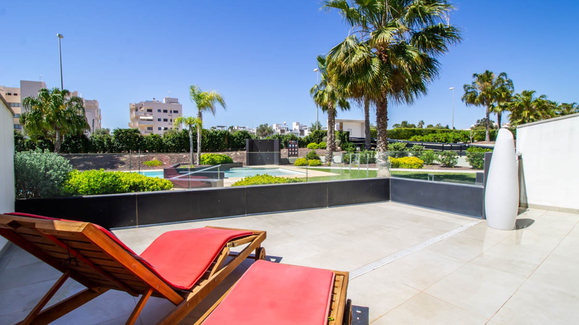 Un grand salon / salle à manger avec des portes-fenêtres donnant sur la terrasse de 64m2 avec une vue fantastique sur la piscine commune et les jardins. Une cuisine ouverte entièrement équipée avec tous les appareils inclus et une buanderie séparée, jardin arrière de 23m2, 2 x grandes chambres doubles avec placards. La chambre principale a une salle de douche attenante, 1 x salle de douche pour les invités, une terrasse très ensoleillée de 64m2 avec vue sur l'une des piscines communes et un parking souterrain avec un débarras. Il y a la climatisation chaude et froide dans toutes les chambres.