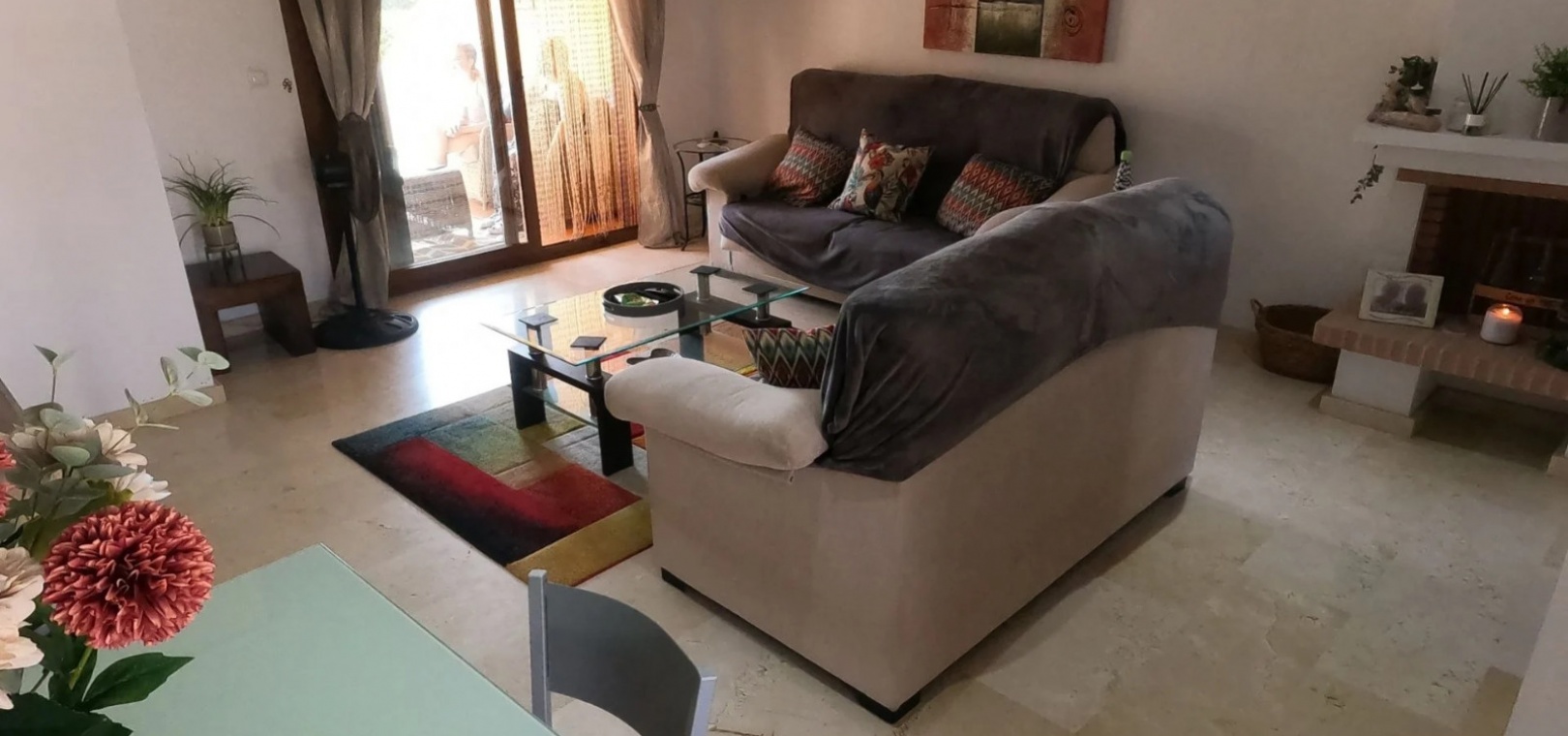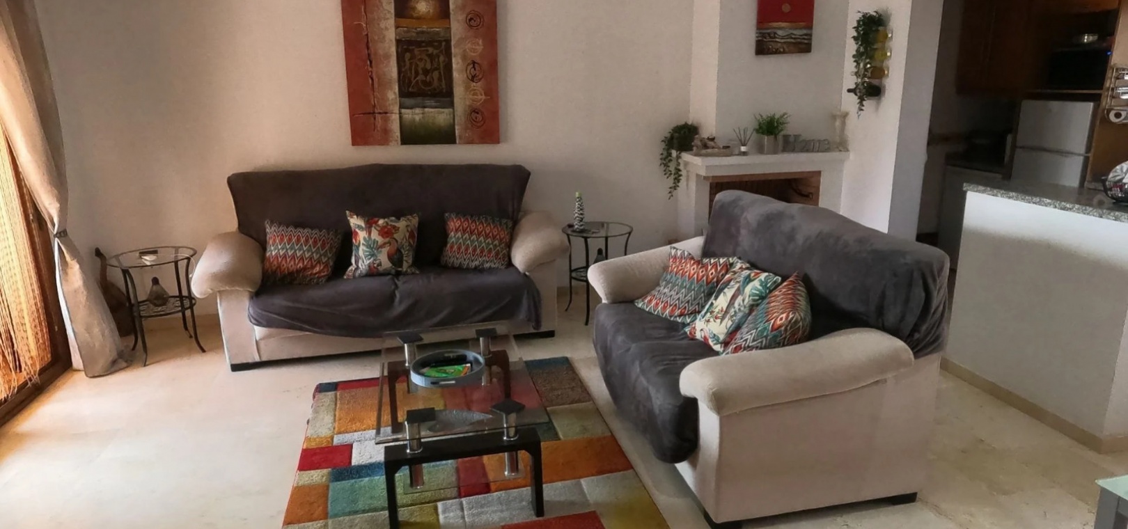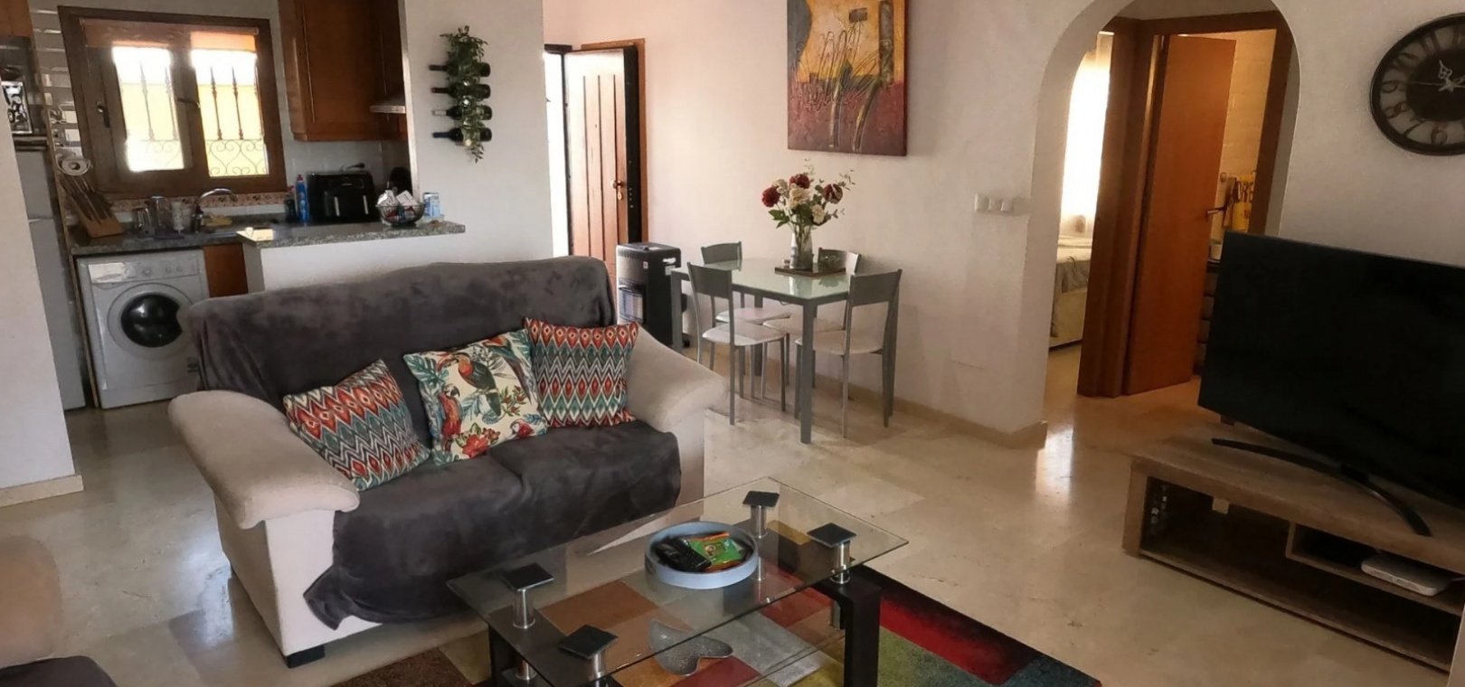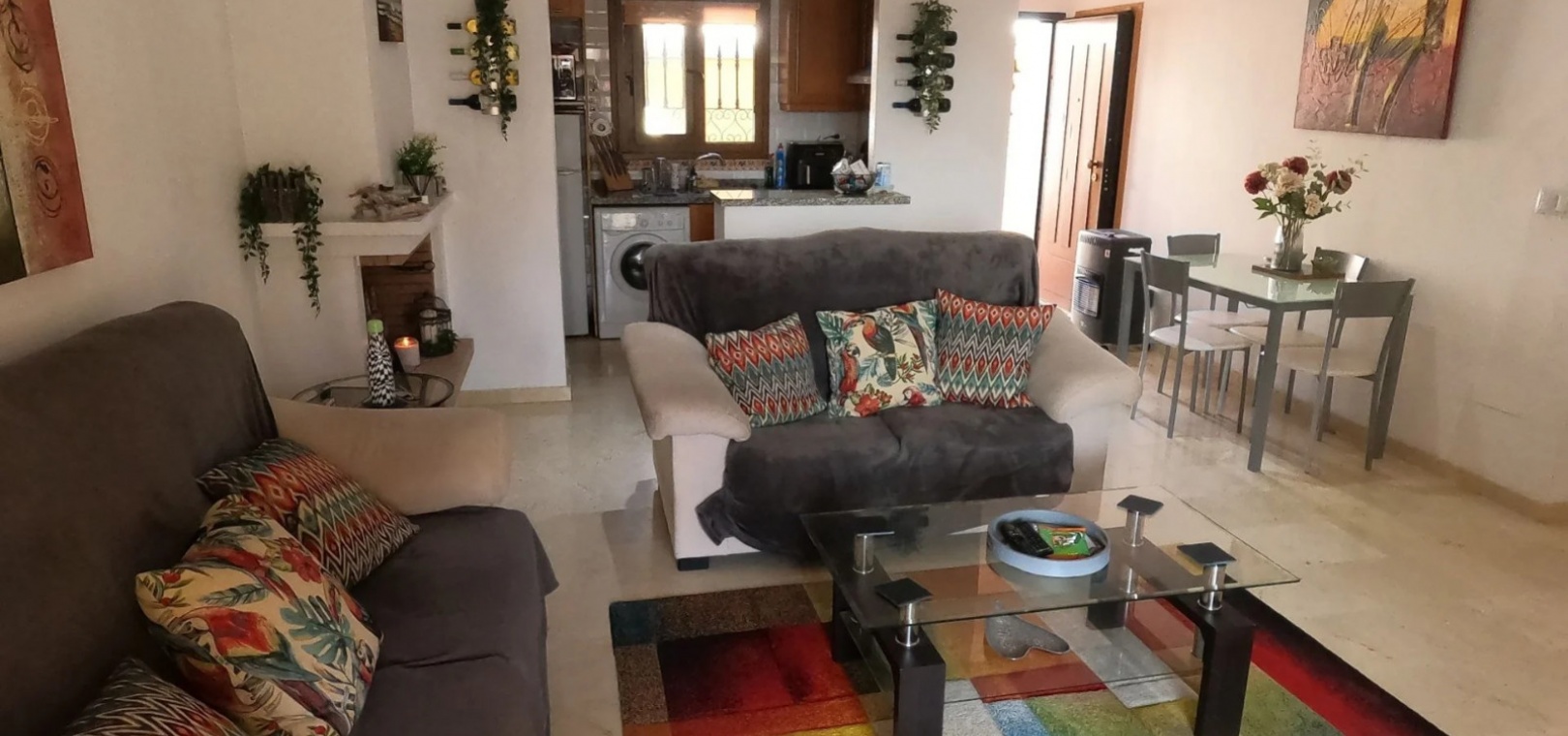 Salon / salle à manger avec cheminée et climatisation chaude et froide, cuisine ouverte entièrement équipée, 2 x chambres doubles toutes deux avec placards, la chambre principale avec salle de douche attenante, 1 x salle de bain familiale, terrasse avant couverte à côté du salon, jardin devant, belle piscine commune, parking commun et bien plus encore.
