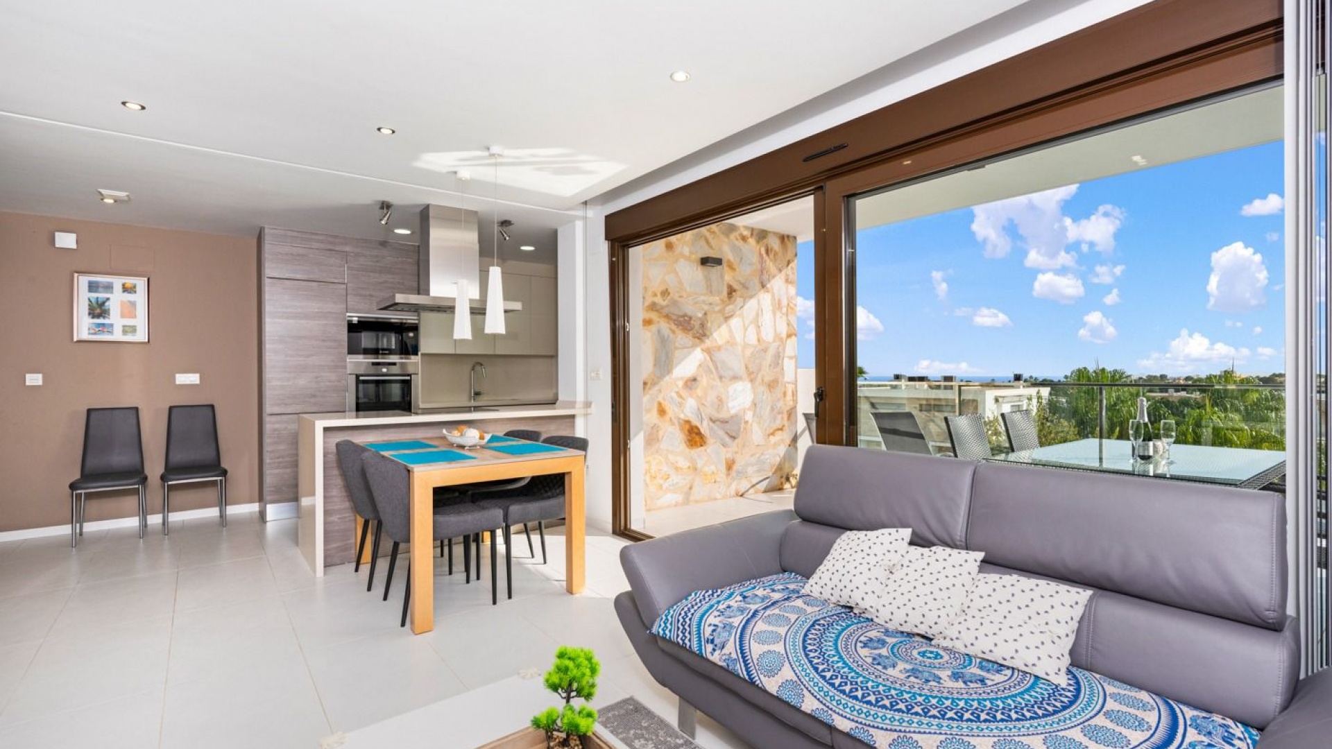 Grand salon/salle à manger, cuisine ouverte entièrement équipée, buanderie séparée, 2 x chambres doubles avec placards, la chambre principale a une salle de douche attenante, 1 x salle de douche invités, terrasse privée de 22 m2 donnant sur la piscine commune et les jardins avec vue sur la mer, communauté fermée sécurisée, parking souterrain avec débarras, climatisation canalisée partout, vendu meublé et bien plus encore.