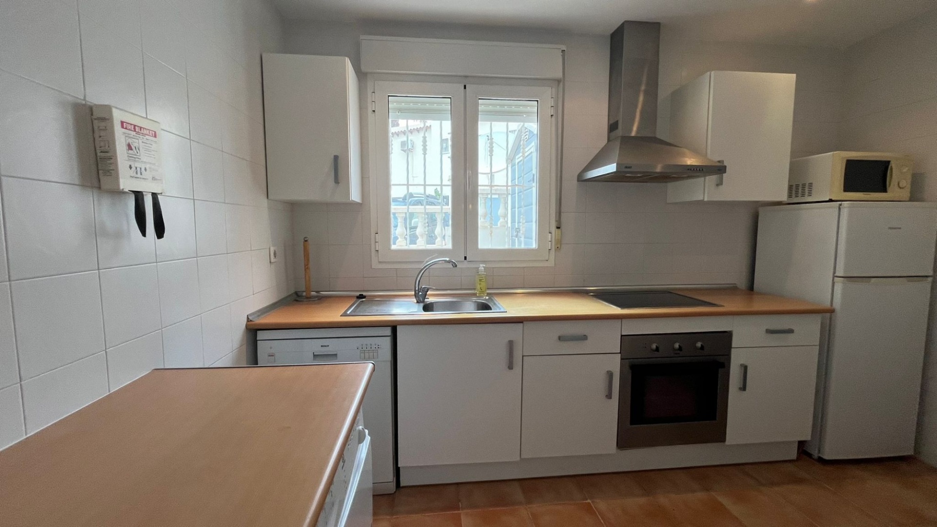 Au rez-de-chaussée il y a un salon/salle à manger avec ventilateurs de plafond, une cuisine séparée entièrement équipée, 1 x chambre double avec placards, climatisation chaude et froide, ventilateur de plafond et 1 x salle de douche.